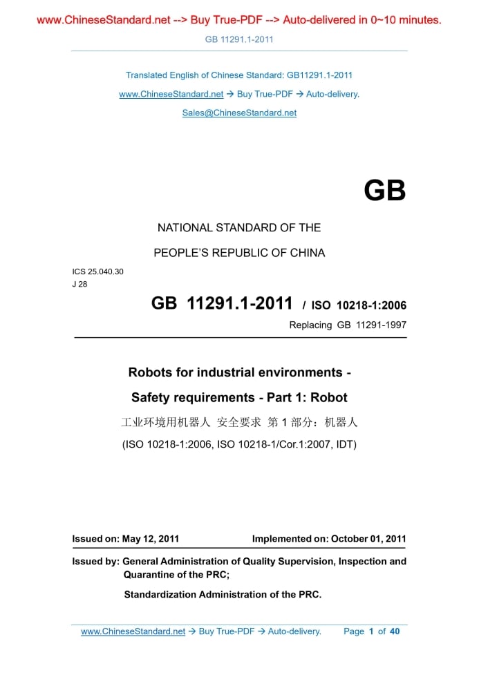 GB 11291.1-2011: Robots for industrial environments -- Safety requirements -- Part 1: Robot Delivery: 9 seconds. True-PDF full-copy in English & invoice will be downloaded + auto-delivered via email. See step-by-step procedure Status: Valid GB 11291.1: Historical versions
