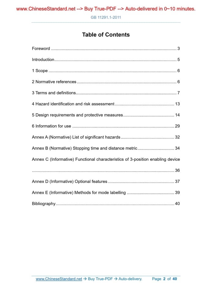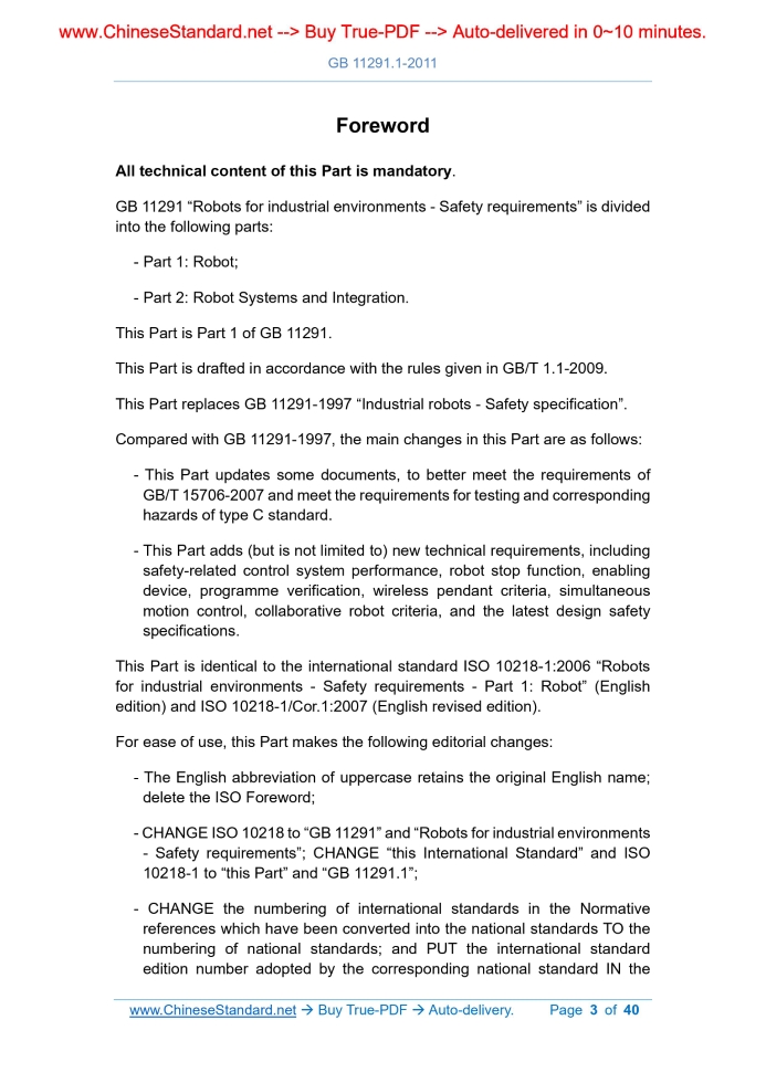 Similar standardsGB 11291.1-2011: Robots for industrial environments -- Safety requirements -- Part 1: Robot---This is an excerpt. Full copy of true-PDF in English version (including equations, symbols, images, flow-chart, tables, and figures etc.), auto-downloaded/delivered in 9 seconds, can be purchased online: https://www.ChineseStandard.net/PDF.aspx/GB11291.1-2011Robots for industrial environments.Safety requirements.Part 1.Robot ICS 25.040.30 J28 National Standards of People's Republic of China Replacing GB 11291-1997 Robots for industrial environments - Safety requirements Part 1.Robots Part 1.Robot (ISO 10218-1.2006, ISO 10218-1/Cor.1.2007, IDT) Issued on. 2011-05-12 2011-10-01 implementation Administration of Quality Supervision, Inspection and Quarantine of People's Republic of China Standardization Administration of China released Table of ContentsPreface Ⅰ Introduction Ⅱ 1 Scope 1 2 Normative references 1 3 Terms and definitions Hazard identification and risk assessment 4 5 5 design requirements and protection measures 6 6 15 use the information Appendix A (normative) lists 17 major risk Appendix B (normative) Stop time/distance metric 19 Annex C (informative) 3-position enabling device features 20 Annex D (informative) Optional Features 21 Methods Appendix E (normative) mode of operation mark 22 References 23ForewordAll technical content in this section is mandatory. GB 11291 "Robots for industrial environments - Safety requirements" is divided into the following sections. --- Part 1.Robot; --- Part 2.Robot systems and integration. This is Part 1 GB 11291's. This section drafted in accordance with GB/T 1.1-2009 given rules. This Part replaces GB 11291-1997 "industrial robot safety norms." This section of the main changes compared to GB 11291-1997 are as follows. --- This section updated some files to make them more in line with GB/T 15706-2007 and comply with the requirements of the use of Class C standard check Testing requirements and corresponding hazards. --- This section increased (but not limited to) new technical requirements, including those related to security control system performance, the robot stop work You can enable the device, program verification, wireless teach pendant guidelines, joint control, collaborative robots guidelines, and the latest design safety specification. This section identical with the international standard ISO 10218-1.2006 "Safety requirements for industrial environments - Part 1 robot. robot" (English version) and ISO 10218-1/Cor.1.2007 (revised English edition). For ease of use, this part of the editorial changes as follows. --- Uppercase acronym in English formerly reserved to remove ISO foreword; --- ISO 10218 will be changed to "GB 11291" and "" Robots for industrial environments - Safety requirements ''; will the "international standards" and ISO 10218-1 words "this section" and "GB 11291.1"; --- The Normative documents have been translated into national standards with international standards Renumber national standard number, and the corresponding national International standards adopted standard version number placed in parentheses after the number of national standards, ease of use and access; unconverted international standards Approved leave; --- Deletion of the original text does not meet the standard of written words. Correspondence between the consistency of the standards of international documents and normative references of the following documents. --- GB/T 12642-2001 industrial robot performance specifications and test methods (eqvISO 9283.1998); --- GB 16754-2008 Safety of machinery - Emergency stop design principles (ISO 13850.2006, IDT); --- GB/T 19876-2005 Safety of machinery and parts of the body close to the speed of the positioning of protective equipment (ISO 13855. 2002, MOD). This part is proposed by China Machinery Industry Federation. This part of the automation systems and integration by the National Standardization Technical Committee (SAC/TC159) centralized. This section is drafted. Beijing Machinery Industry Automation, Beijing University of Aeronautics and Astronautics. The main drafters of this section. Young book reviews, Yun Chao, Wang Sisi. This part of the standard replaces the previous editions are. --- GB 11291-1997.introductionGB 11291 is based on the recognition of industrial robots and industrial robot systems can lead to specific risks basis. GB 11291 is GB/T 15706.1-2007 standard Class C said. Note the machine, the level of risk, hazard and incident involved have been described in the context of GB 11291. Class C and Class A standard Class B standard or standards are different. For Class C in accordance with the standard design and manufacture of machinery, Class C standard terms Precedence over other standard terms. Related dangerous robot has been widely recognized. However, the use of different sources of danger robot system is often different, so the type of risk The automation process is directly related to the number and complexity of the robot installation. Depending on the type of robot use, purpose of use of the robot, Risks associated with the robot installation, programming, operation and maintenance of different ways, leading to the danger of these are different. Note 1.Not all danger described in GB 11291 are applicable to each robot. Similarly, the level of risk of a particular dangerous situations in different machine It is the world may differ. Thus, the provisions in GB 11291 safety requirements and/or protective measures for different robots may vary With, then it can carry out a risk assessment to determine what protective measures. In recognition of industrial robots for different purposes have different hazardous properties, GB 11291 is divided into two parts; Part 1 provides Security assurances guidance recommends that when designing and manufacturing the robot. Since the industrial robot application security by a particular robotic system integration Influence in the 