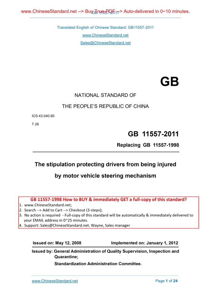 GB 11557-2011: The stipulation protecting drivers from being injured by motor vehicle steering mechanism Delivery: 9 seconds. True-PDF full-copy in English & invoice will be downloaded + auto-delivered via email. See step-by-step procedure Status: Valid GB 11557: Historical versions