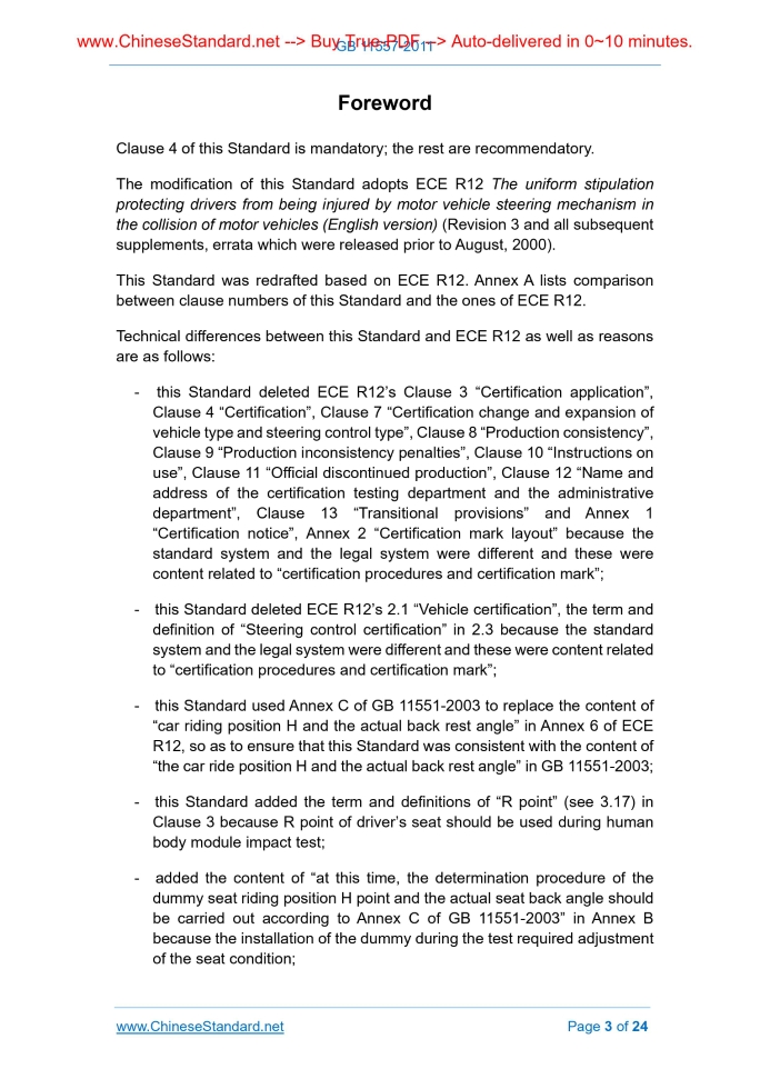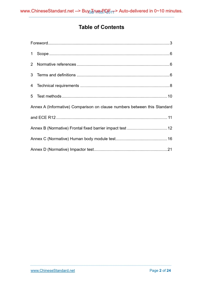 GB 11557-2011: The stipulation protecting drivers from being injured by motor vehicle steering mechanism---This is an excerpt. Full copy of true-PDF in English version (including equations, symbols, images, flow-chart, tables, and figures etc.), auto-downloaded/delivered in 9 seconds, can be purchased online: https://www.ChineseStandard.net/PDF.aspx/GB11557-2011 GB NATIONAL STANDARD OF THE PEOPLE’S REPUBLIC OF CHINA ICS 43.040.60 T 26 Replacing GB 11557-1998 The stipulation protecting drivers from being injured by motor vehicle steering mechanism Issued on. MAY 12, 2008 Implemented on. JANUARY 1, 2012 Issued by. General Administration of Quality Supervision, Inspection and Quarantine; Standardization Administration Committee. Table of ContentsForeword... 3 1 Scope... 6 2 Normative references... 6 3 Terms and definitions... 6 4 Technical requirements... 8 5 Test methods... 10 Annex A (Informative) Comparison on clause numbers between this Standard and ECE R12... 11 Annex B (Normative) Frontal fixed barrier impact test... 12 Annex C (Normative) Human body module test... 16 Annex D (Normative) Impactor test... 21ForewordClause 4 of this Standard is mandatory; the rest are recommendatory. The modification of this Standard adopts ECE R12 The uniform stipulation protecting drivers from being injured by motor vehicle steering mechanism in the collision of motor vehicles (English version) (Revision 3 and all subsequent supplements, errata which were released prior to August, 2000). This Standard was redrafted based on ECE R12.Annex A lists comparison between clause numbers of this Standard and the ones of ECE R12. Technical differences between this Standard and ECE R12 as well as reasons are as follows. - this Standard deleted ECE R12’s Clause 3 “Certification application”, Clause 4 “Certification”, Clause 7 “Certification change and expansion of vehicle type and steering control type”, Clause 8 “Production consistency”, Clause 9 “Production inconsistency penalties”, Clause 10 “Instructions on use”, Clause 11 “Official discontinued production”, Clause 12 “Name and address of the certification testing department and the administrative department”, Clause 13 “Transitional provisions” and Annex 1 “Certification notice”, Annex 2 “Certification mark layout” because the standard system and the legal system were different and these were content related to “certification procedures and certification mark”; - this Standard deleted ECE R12’s 2.1 “Vehicle certification”, the term and definition of “Steering control certification” in 2.3 because the standard system and the legal system were different and these were content related to “certification procedures and certification mark”; - this Standard used Annex C of GB 11551-2003 to replace the content of “car riding position H and the actual back rest angle” in Annex 6 of ECE R12, so as to ensure that this Standard was consistent with the content of “the car ride position H and the actual back rest angle” in GB 11551-2003; - this Standard added the term and definitions of “R point” (see 3.17) in Clause 3 because R point of driver’s seat should be used during human body module impact test; - added the content of “at this time, the determination procedure of the dummy seat riding position H point and the actual seat back angle should be carried out according to Annex C of GB 11551-2003” in Annex B because the installation of the dummy during the test required adjustment of the seat condition; - added terms and illustrations (see C.2.5.3 and Figure C.2) about the relative position of the human body module and the steering mechanism and the direction of impact during the test in Annex C because the relative position of the test could be more clearly indicated; - added “If the impact velocity of the test is higher than this value, but the steering mechanism still complies with the specified requirements, this test shall be regarded to meet requirements” (see D.4.3) in Annex D because it specified the determination reference for test results to comply with requirements under more severe conditions (impact velocity is higher than the specified value). This Standard also made the following editorial modifications. - modified “this Regulation” to “this Standard”; - added the informative Annex A. This Standard replaces GB 11557-1998 The stipulation protecting drivers from being injured by motor vehicle steering mechanism. The main differences between this Standard and GB 11557-1998 are as follows. - the scope of application of this Standard has been adjusted; Edition 1998 is applicable to vehicles of M1 category but not short cars and flat cars; This edition is applicable to vehicles of M1 category and N1 vehicles of which the maximum total mass is less than 1500 kg (Clause 1 of this Edition); - added requirements of “the amount of movement of the steering shaft and the top of the steering column” in frontal fixed barrier crash test (4.3 of this Edition); - added head-type impact test of steering mechanism (4.3 of this Edition). Annex B, Annex C, Annex D of this Standard are normative; Annex A is informative. The transition period of the implementation of this Standard. for new car model, this Standard is implemented since January 1, 2012; for model in production, this Standard is implemented since January 1, 2014. This Standard was proposed by National Development and Reform Commission. This Standard shall be under jurisdiction of National Automotive Standardization Technical Committee. Drafting organization of this Standard. China Automotive Technology and Research Center. Main drafters of this Standard. Du Tianqiang, Yuan Jian. The previous versions replaced by this Standard are as follows. - GB 11557-1989, GB 11557-1998. The stipulation protecting drivers from being injured by motor vehicle steering mechanism1 ScopeThis Standard specifies technical requirements and