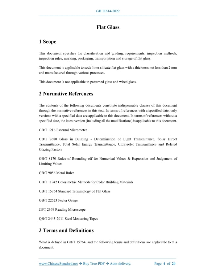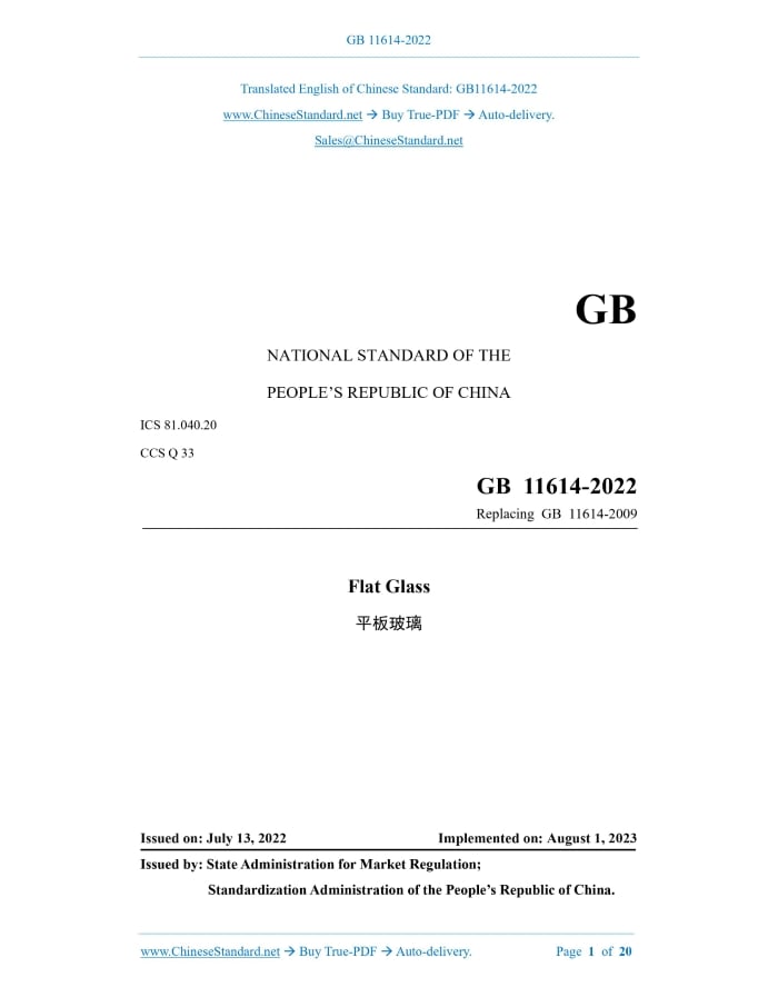 GB 11614-2022: Flat glass Delivery: 9 seconds. True-PDF full-copy in English & invoice will be downloaded + auto-delivered via email. See step-by-step procedure Status: Valid GB 11614: Historical versions
