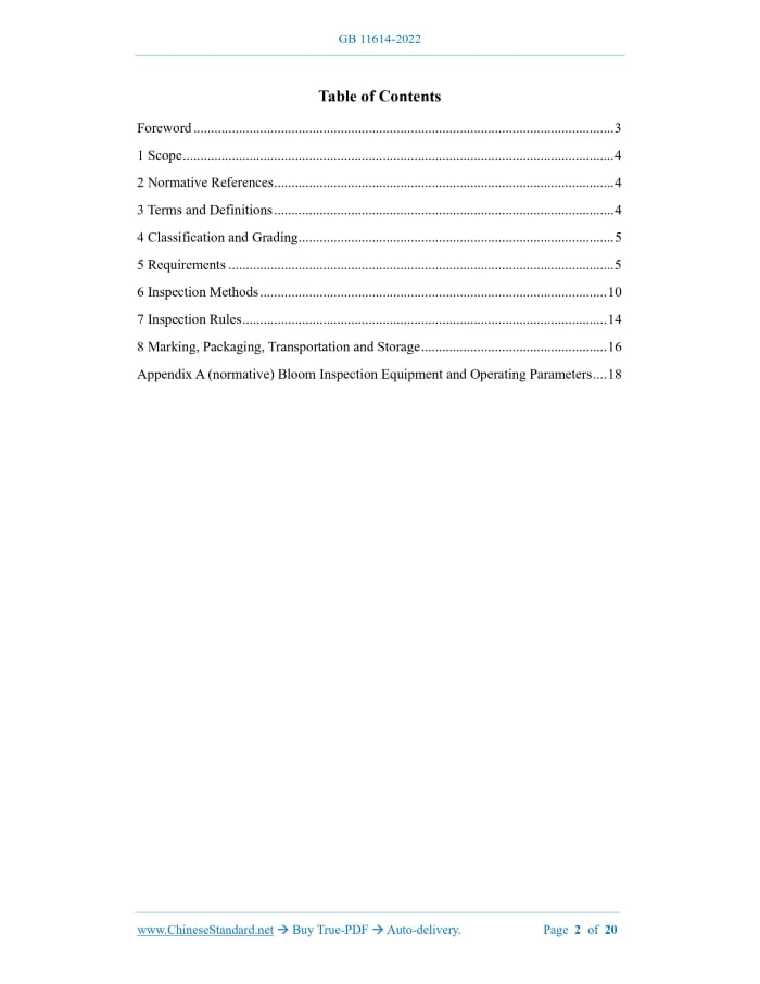 Similar standardsGB 11614-2022: Flat glass---This is an excerpt. Full copy of true-PDF in English version (including equations, symbols, images, flow-chart, tables, and figures etc.), auto-downloaded/delivered in 9 seconds, can be purchased online: https://www.ChineseStandard.net/PDF.aspx/GB11614-2022GB NATIONAL STANDARD OF THE PEOPLE’S REPUBLIC OF CHINA ICS 81.040.20 CCS Q 33 Replacing GB 11614-2009 Flat Glass Issued on. JULY 13, 2022 Implemented on. AUGUST 1, 2023 Issued by. State Administration for Market Regulation; Standardization Administration of the People’s Republic of China. Table of ContentsForeword... 3 1 Scope... 4 2 Normative References... 4 3 Terms and Definitions... 4 4 Classification and Grading... 5 5 Requirements... 5 6 Inspection Methods... 10 7 Inspection Rules... 14 8 Marking, Packaging, Transportation and Storage... 16 Appendix A (normative) Bloom Inspection Equipment and Operating Parameters... 181 ScopeThis document specifies the classification and grading, requirements, inspection methods, inspection rules, marking, packaging, transportation and storage of flat glass. This document is applicable to soda-lime-silicate flat glass with a thickness not less than 2 mm and manufactured through various processes. This document is not applicable to patterned glass and wired glass.2 Normative ReferencesThe contents of the following documents constitute indispensable clauses of this document through the normative references in this text. In terms of references with a specified date, only versions with a specified date are applicable to this document. In terms of references without a specified date, the latest version (including all the modifications) is applicable to this document. GB/T 1216 External Micrometer GB/T 2680 Glass in Building - Determination of Light Transmittance, Solar Direct Transmittance, Total Solar Energy Transmittance, Ultraviolet Transmittance and Related Glazing Factors GB/T 8170 Rules of Rounding off for Numerical Values & Expression and Judgement of Limiting Values GB/T 9056 Metal Ruler GB/T 11942 Colorimetric Methods for Color Building Materials GB/T 15764 Standard Terminology of Flat Glass GB/T 22523 Feeler Gauge JB/T 2369 Reading Microscope QB/T 2443-2011 Steel Measuring Tapes3 Terms and DefinitionsWhat is defined in GB/T 15764, and the following terms and definitions are applicable to this document. 3.1 Optical Distortion Optical distortion refers to the defect of distortion presented when observing an object through glass at a certain angle. NOTE. the degree of distortion is expressed by the incident angle (commonly known as zebra angle). 3.2 Spot Faults Spot faults is a general term for defects, such as. air bubbles, inclusions, and spots. 3.3 Edge Defects Edge defects refer to the phenomenon of convex or concave or incomplete glass plate section. NOTE. edge defects include bursting edges, edge bumps, missing corners and beveled edges, etc. 3.4 Thickness Wedge Thickness wedge refers to the difference between the maximum value and the minimum value of thickness of the same glass. 3.5 Bloom Bloom refers to the light interference color presented through visual observation of the lower surface of the glass (during molding, the surface that is in contact with the tin liquid) after the float glass of different thicknesses is heated and cooled for a specified time. 3.6 Spot Distortion Spot distortion refers to spots on the surface of flat glass that cause optical distortion.4 Classification and Grading4.1 In accordance with the attribute of color, it is classified into two types. 4.2 In accordance with different requirements for appearance quality, it is classified into two grades. ordinary flat glass and high-quality processed flat glass.5 Requirements5.1 Overview The inspection items of flat glass, as well as the corresponding clauses of the requirements and inspection methods are shown in Table 1. 5.2 Dimensional deviations Flat glass shall be cut into rectangles, and the dimensional deviations of its length and width shall not exceed those specified in Table 2. 5.3 Diagonal Difference The diagonal difference shall not be greater than 0.2% of the average diagonal length. 5.4 Thickness and Thickness Wedge 5.5 Appearance Quality 5.6 Curvature For ordinary flat glass, the curvature shall not be greater than 0.2%. 5.7 Bloom This inspection is only performed on high-quality processed flat glass produced through the float process. After the test, there shall be no phenomenon of bloom. 5.8 Optical Properties 5.9 Color Uniformity This test is only carried out on body-tinted flat glass. In the same batch of products,6 Inspection Methods6.1 Dimensional Deviations Use a metal ruler with a division value of 1 mm that complies with the stipulations of GB/T 9056 or a steel measuring tape with Grade-1 precision that complies with the stipulations of QB/T 2443-2011 to respectively measure the distance between two parallel sides in the middle of the long and wide sides. The difference between the measured value and the nominal dimension is the dimensional deviation. 6.2 Diagonal Difference Use a steel measuring tape with Grade-1 precision that complies with the stipulations of QB/T 2443-2011 to measure the length of two diagonals of the glass plate. The absolute value of the difference is the diagonal difference. Calculate the percentage of the diagonal difference and the average length of the diagonal. 6.3 Thickness Use a digital display micrometer (or spiral micrometer) with a division value of 0.001 mm that complies with the stipulations of GB/T 1216 to measure five points perpendicular to the pulling direction of the glass plate. at about 15 mm from the edge, respectively take one point inward; equally divide the remaining three points between the two points. The measured value shall take three decimal places. Calculate the difference between the measured values at five points and the clearly stated thickness; compare the maximum value of deviation with T