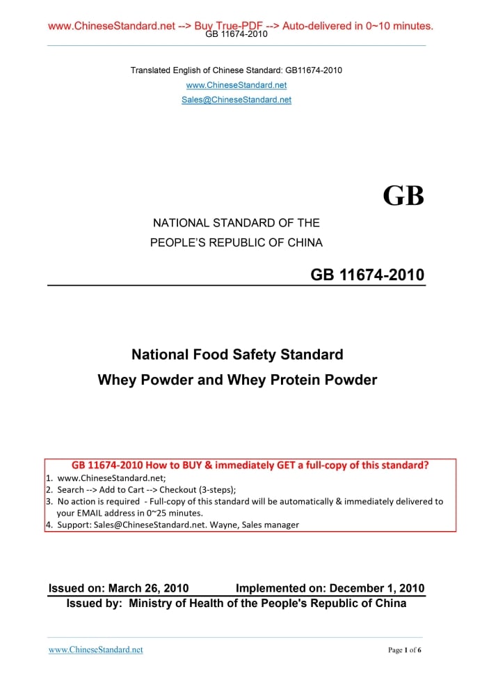 GB 11674-2010: National food safety standard -- Whey powder and whey protein powder Delivery: 9 seconds. True-PDF full-copy in English & invoice will be downloaded + auto-delivered via email. See step-by-step procedure Status: Valid GB 11674: Historical versions