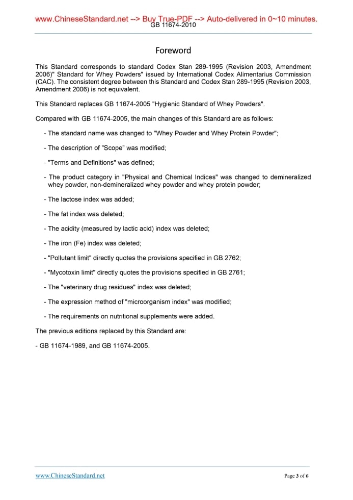 Similar standardsGB 11674-2010: National food safety standard -- Whey powder and whey protein powder---This is an excerpt. Full copy of true-PDF in English version (including equations, symbols, images, flow-chart, tables, and figures etc.), auto-downloaded/delivered in 9 seconds, can be purchased online: https://www.ChineseStandard.net/PDF.aspx/GB11674-2010GB NATIONAL STANDARD OF THE PEOPLE’S REPUBLIC OF CHINA National Food Safety Standard Whey Powder and Whey Protein Powder Issued on. MARCH 26, 2010 Implemented on. DECEMBER 1, 2010 Issued by. Ministry of Health of the People's Republic of China Table of ContentsForeword... 3 1 Scope... 4 2 Normative References... 4 3 Terms and Definitions... 4 4 Technical Requirements... 4ForewordThis Standard corresponds to standard Codex Stan 289-1995 (Revision 2003, Amendment 2006)" Standard for Whey Powders" issued by International Codex Alimentarius Commission (CAC). The consistent degree between this Standard and Codex Stan 289-1995 (Revision 2003, Amendment 2006) is not equivalent. This Standard replaces GB 11674-2005 "Hygienic Standard of Whey Powders". Compared with GB 11674-2005, the main changes of this Standard are as follows. - The standard name was changed to "Whey Powder and Whey Protein Powder"; - The description of "Scope" was modified; - "Terms and Definitions" was defined; - The product category in "Physical and Chemical Indices" was changed to demineralized whey powder, non-demineralized whey powder and whey protein powder; - The lactose index was added; - The fat index was deleted; - The acidity (measured by lactic acid) index was deleted; - The iron (Fe) index was deleted; - "Pollutant limit" directly quotes the provisions specified in GB 2762; - "Mycotoxin limit" directly quotes the provisions specified in GB 2761; - The "veterinary drug residues" index was deleted; - The expression method of "microorganism index" was modified; - The requirements on nutritional supplements were added. The previous editions replaced by this Standard are. - GB 11674-1989, and GB 11674-2005. National Food Safety Standard Whey Powder and Whey Protein Powder1 ScopeThis Standard is applicable to products such as demineralized whey powder, non-demineralized whey powder, condensed whey protein powder, and separated whey protein powder.2 Normative ReferencesThe documents quoted in this Standard are indispensable for the application of this Standard. For dated references, only the dated edition is applicable to this document. For undated references, the latest editions of the normative documents (including all amendments) are applicable to this document.3 Terms and Definitions3.1 Whey It refers to the liquid that is obtained by separating the clotted milk, with raw milk as the raw material, when producing cheese, casein and other similar products by adopting methods such as rennin, acidation or membrane filtration. 3.2 Whey powder It refers to the powder products that are produced by drying the raw material (whey). 3.3 Whey Protein powder It refers to the powder products of which the protein content is not less than 25 %, with whey as the raw material, produced by adopting techniques such as separation, concentration, and drying.4 Technical Requirements4.1 Raw material requirements 4.2 Sensory requirements. It shall comply with the provisions in Table 1. 4.3 Physiochemical Indexes. It shall comply with the provisions in Table 2. 4.4 Pollutant limit. It shall comply with the provisions of GB 2762. 4.5 Mycotoxin limit. It shall comply with the provisions of GB 2761. 4.7 Food Additives and Nutritional supplements 4.7.1 The quality of food additives and nutritional supplements shall comply with the corresponding safety standards and the relevant provisions. ......Source: Above contents are excerpted from the full-copy PDF -- translated/reviewed by: www.ChineseStandard.net / Wayne Zheng et al. Tips & Frequently Asked Questions:Question 1: How long will the true-PDF of English version of GB 11674-2010 be delivered?Answer: The full copy PDF of English version of GB 11674-2010 can be downloaded in 9 seconds, and it will also be emailed to you in 9 seconds (double mechanisms to ensure the delivery reliably), with PDF-invoice.Question 2: Can I share the purchased PDF of GB 11674-2010_English with my colleagues?Answer: Yes. The purchased PDF of GB 11674-2010_English will be deemed to be sold to your employer/organization who actually paid for it, including your colleagues and your employer's intranet.Question 3: Does the price include tax/VAT?Answer: Yes. Our tax invoice, downloaded/delivered in 9 seconds, includes all tax/VAT and complies with 100+ countries' tax regulations (tax exempted in 100+ countries) -- See Avoidance of Double Taxation Agreements (DTAs): List of DTAs signed between Singapore and 100+ countriesQuestion 4: Do you accept my currency other than USD?Answer: Yes. www.ChineseStandard.us -- GB 11674-2010 -- Click this link and select your country/currency to pay, the exact amount in your currency will be printed on the invoice. Full PDF will also be downloaded/emailed in 9 seconds.Question 5: Should I purchase the latest version GB 11674-2010?Answer: Yes. Unless special scenarios such as technical constraints or academic study, you should always prioritize to purchase the latest version GB 11674-2010 even if the enforcement date is in future. Complying with the latest version means that, by default, it also complies with all the earlier versions, technically.How to buy and download a true PDF of English version of GB 11674-2010?A step-by-step guide to download PDF of GB 11674-2010_EnglishStep 1: Visit website https://www.ChineseStandard.net (Pay in USD), or https://www.ChineseStandard.us (Pay in any currencies such as Euro, KRW, JPY, AUD).Step 2: Search keyword "GB 11674-2010". Step 3: Click "Add to Cart". If multiple PDFs are required, repeat steps 2 and 3 to add up to 12 PDFs to cart. Step 4: Select payment option (Via payment agents Stripe or Pa
