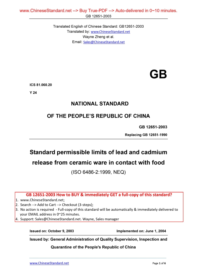 GB 12651-2003: Standard permissible limits of lead and cadmium release from ceramic ware in contact with food Delivery: 9 seconds. True-PDF full-copy in English & invoice will be downloaded + auto-delivered via email. See step-by-step procedure Status: Obsolete GB 12651: Historical versions