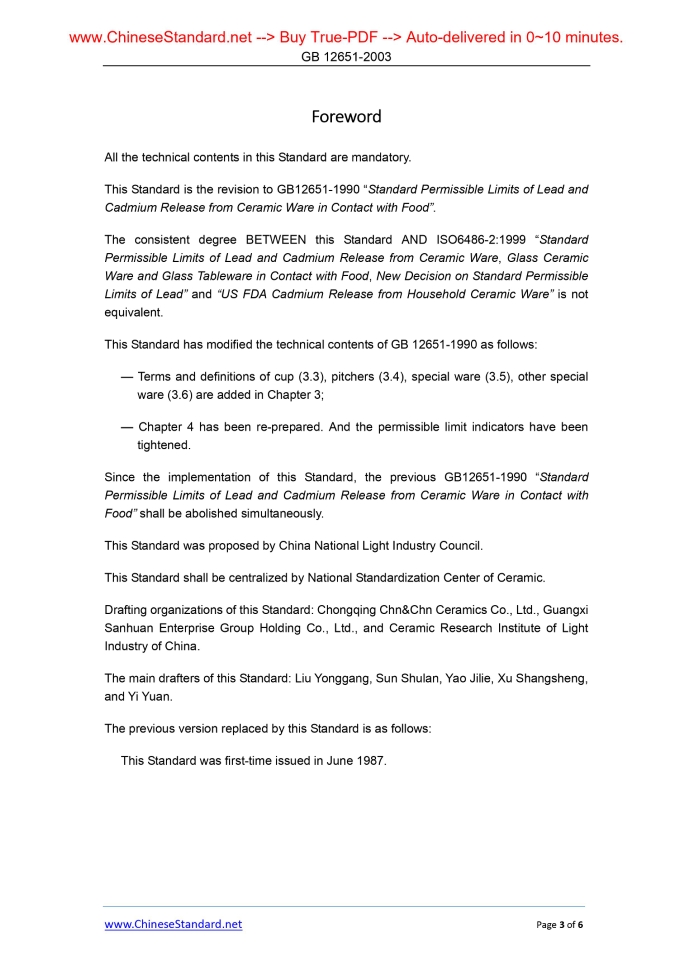 Similar standardsGB 12651-2003: Standard permissible limits of lead and cadmium release from ceramic ware in contact with food---This is an excerpt. Full copy of true-PDF in English version (including equations, symbols, images, flow-chart, tables, and figures etc.), auto-downloaded/delivered in 9 seconds, can be purchased online: https://www.ChineseStandard.net/PDF.aspx/GB12651-2003 GB ICS 81.060.20 Y 24 NATIONAL STANDARD OF THE PEOPLE’S REPUBLIC OF CHINA Replacing GB 12651-1990 Standard permissible limits of lead and cadmium release from ceramic ware in contact with food (ISO 6486-2.1999, NEQ) Issued on: OCTOBER 9, 2003 Implemented on: JUNE 1, 2004 Issued by. General Administration of Quality Supervision, Inspection and Quarantine of the People's Republic of China Table of ContentsForeword ... 3 1 Scope ... 4 2 Normative references ... 4 3 Terms and Definitions ... 4 4 Permissible limit ... 5ForewordAll the technical contents in this Standard are mandatory. This Standard is the revision to GB12651-1990 “Standard Permissible Limits of Lead and Cadmium Release from Ceramic Ware in Contact with Food”. The consistent degree BETWEEN this Standard AND ISO6486-2.1999 “Standard Permissible Limits of Lead and Cadmium Release from Ceramic Ware, Glass Ceramic Ware and Glass Tableware in Contact with Food, New Decision on Standard Permissible Limits of Lead” and “US FDA Cadmium Release from Household Ceramic Ware” is not equivalent. This Standard has modified the technical contents of GB 12651-1990 as follows. — Terms and definitions of cup (3.3), pitchers (3.4), special ware (3.5), other special ware (3.6) are added in Chapter 3; — Chapter 4 has been re-prepared. And the permissible limit indicators have been tightened. Since the implementation of this Standard, the previous GB12651-1990 “Standard Permissible Limits of Lead and Cadmium Release from Ceramic Ware in Contact with Food” shall be abolished simultaneously. This Standard was proposed by China National Light Industry Council. This Standard shall be centralized by National Standardization Center of Ceramic. Drafting organizations of this Standard. Chongqing Chn&Chn Ceramics Co., Ltd., Guangxi Sanhuan Enterprise Group Holding Co., Ltd., and Ceramic Research Institute of Light Industry of China. The main drafters of this Standard. Liu Yonggang, Sun Shulan, Yao Jilie, Xu Shangsheng, and Yi Yuan. The previous version replaced by this Standard is as follows. This Standard was first-time issued in June 1987. Standard permissible limits of lead and cadmium release from ceramic ware in contact with food1 ScopeThis Standard specifies the permissible limits of lead and cadmium release from ceramic ware in contact with food. This Standard applies to porcelain, stoneware, glazed and unglazed ceramic ware in contact with food, but excludes chinaware for food manufacturing industry, packaging and cooking. 2 Normative references The articles contained in the following documents have become part of this Standard when they are quoted herein. For the dated documents so quoted, all the modifications (excluding corrections) or revisions made thereafter shall not be applicable to this Standard. For the undated documents so quoted, the latest editions shall be applicable to this Standard. GB/T 3534 Standard testing methods for lead and cadmium release from domestic ceramic 3 Terms and Definitions For the purpose of this Standard, the following terms and definitions apply. 3.1 Flatware It refers to the ceramic ware of which the depth FROM the product’s water-level TO the inner lowest plane is less than or equal to 25mm. 3.2 Hollowware It refers to the ceramic ware of which the depth FROM the product’s water-level TO the inner lowest plane is more than 25mm. According to the capacity, the size of hollowware is specified as follows. 3.2.1 ......Source: Above contents are excerpted from the full-copy PDF -- translated/reviewed by: www.ChineseStandard.net / Wayne Zheng et al. Tips & Frequently Asked Questions:Question 1: How long will the true-PDF of English version of GB 12651-2003 be delivered?Answer: The full copy PDF of English version of GB 12651-2003 can be downloaded in 9 seconds, and it will also be emailed to you in 9 seconds (double mechanisms to ensure the delivery reliably), with PDF-invoice.Question 2: Can I share the purchased PDF of GB 12651-2003_English with my colleagues?Answer: Yes. The purchased PDF of GB 12651-2003_English will be deemed to be sold to your employer/organization who actually paid for it, including your colleagues and your employer's intranet.Question 3: Does the price include tax/VAT?Answer: Yes. Our tax invoice, downloaded/delivered in 9 seconds, includes all tax/VAT and complies with 100+ countries' tax regulations (tax exempted in 100+ countries) -- See Avoidance of Double Taxation Agreements (DTAs): List of DTAs signed between Singapore and 100+ countriesQuestion 4: Do you accept my currency other than USD?Answer: Yes. www.ChineseStandard.us -- GB 12651-2003 -- Click this link and select your country/currency to pay, the exact amount in your currency will be printed on the invoice. Full PDF will also be downloaded/emailed in 9 seconds.Question 5: Should I purchase the latest version GB 12651-2003?Answer: Yes. Unless special scenarios such as technical constraints or academic study, you should always prioritize to purchase the latest version GB 12651-2003 even if the enforcement date is in future. Complying with the latest version means that, by default, it also complies with all the earlier versions, technically.How to buy and download a true PDF of English version of GB 12651-2003?A step-by-step guide to download PDF of GB 12651-2003_EnglishStep 1: Visit website https://www.ChineseStandard.net (Pay in USD), or https://www.ChineseStandard.us (Pay in any currencies such as Euro, KRW, JPY, AUD).Step 2: Search keyword "GB 12651-2003". Step 3: Click "Add to Cart". If multiple PDFs are required, repeat st