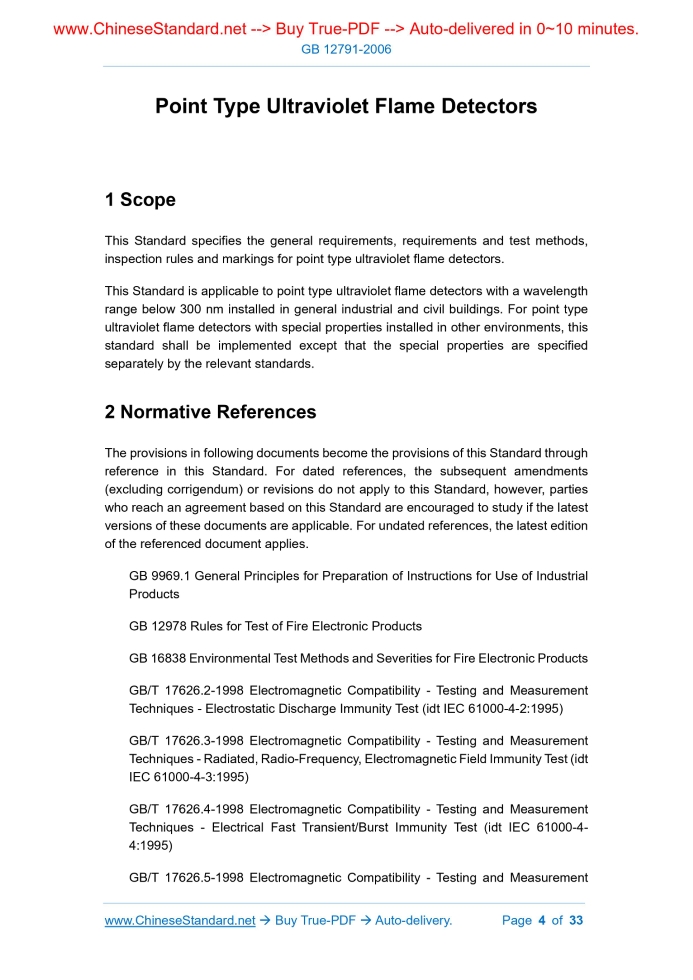 Similar standardsGB 12791-2006: Point type ultraviolet flame detectors---This is an excerpt. Full copy of true-PDF in English version (including equations, symbols, images, flow-chart, tables, and figures etc.), auto-downloaded/delivered in 9 seconds, can be purchased online: https://www.ChineseStandard.net/PDF.aspx/GB12791-2006NATIONAL STANDARD OF THE PEOPLE’S REPUBLIC OF CHINA ICS 13.220.20 C 81 Replacing GB 12791-1991 Point Type Ultraviolet Flame Detectors Issued on: JULY 17, 2006 Implemented on: APRIL 01, 2007 Issued by. General Administration of Quality Supervision, Inspection and Quarantine; Standardization Administration of PRC. Table of ContentsForeword... 3 1 Scope... 4 2 Normative References... 4 3 General Requirements... 5 4 Requirements and Test Methods... 7 5 Inspection Rules... 32 6 Markings... 33 Point Type Ultraviolet Flame Detectors1 ScopeThis Standard specifies the general requirements, requirements and test methods, inspection rules and markings for point type ultraviolet flame detectors. This Standard is applicable to point type ultraviolet flame detectors with a wavelength range below 300 nm installed in general industrial and civil buildings. For point type ultraviolet flame detectors with special properties installed in other environments, this standard shall be implemented except that the special properties are specified separately by the relevant standards.2 Normative ReferencesThe provisions in following documents become the provisions of this Standard through reference in this Standard. For dated references, the subsequent amendments (excluding corrigendum) or revisions do not apply to this Standard, however, parties who reach an agreement based on this Standard are encouraged to study if the latest versions of these documents are applicable. For undated references, the latest edition of the referenced document applies. GB 9969.1 General Principles for Preparation of Instructions for Use of Industrial Products GB 12978 Rules for Test of Fire Electronic Products GB 16838 Environmental Test Methods and Severities for Fire Electronic Products GB/T 17626.2-1998 Electromagnetic Compatibility - Testing and Measurement Techniques - Electrostatic Discharge Immunity Test (idt IEC 61000-4-2.1995) GB/T 17626.3-1998 Electromagnetic Compatibility - Testing and Measurement Techniques - Radiated, Radio-Frequency, Electromagnetic Field Immunity Test (idt IEC 61000-4-3.1995) GB/T 17626.4-1998 Electromagnetic Compatibility - Testing and Measurement Techniques - Electrical Fast Transient/Burst Immunity Test (idt IEC 61000-4- 4.1995) GB/T 17626.5-1998 Electromagnetic Compatibility - Testing and Measurement tools, ciphers or disconnection between probes and bases, and the like measures. b) When the manufacturer declares that a setting does not meet the requirements of this Standard, such setting shall only be implemented by means of special tools and ciphers; and it shall be clearly indicated on the detector or related documents that such setting cannot meet the requirements of this Standard. 3.6 Detachable detector When the probe of the detachable detector is separated from the base, it shall provide identification means for the control and indication equipment to send out fault signals. 3.7 Requirements for control software 3.7.1 General For detector that rely on software control and meet the requirements of this Standard, it shall meet the requirements of 3.7.2, 3.7.3, and 3,7.4. 3.7.2 Software files 3.7.2.1 The manufacturer shall submit software design information. The information shall have sufficient content to prove that the software design meets the requirements of this Standard and shall include at least the following. a) Functional description of main program (such as flow chart or structure diagram), including. --- Main description of each module and its function; --- The way in which the modules interact; --- All levels of the program; --- The way the software interacts with the detector hardware; --- The way the module is called, including the interrupt process. b) Memory address allocation (such as program, specific data and operation data). c) The unique identification of the software and its version. 3.7.2.2 If the inspection requires, the manufacturer shall be able to provide detailed design documents containing at least the following. a) Overview of the overall system configuration, including all software and hardware components. 4.1.1 Atmospheric conditions of the test Unless otherwise stated in the relevant provisions, all tests are conducted under the following atmospheric conditions. --- Temperature. 15°C ~ 35°C; --- Humidity. 25% RH ~ 75% RH; --- Atmospheric pressure. 86 kPa ~ 106 kPa. 4.1.2 Normal monitoring status of the test If the test method requires the detector to work under normal monitoring status, the sample shall be connected to the control and indication equipment provided by the manufacturer; when there are no special requirements in the relevant provisions, the working voltage of the detector should be guaranteed to be rated working voltage, and keep the working voltage stable during the test. NOTE. The test report of the detector shall indicate the type and manufacturer of the control and indication equipment that the detector is connected to during the test. 4.1.3 Installation of the detector The detector shall be installed according to the normal installation method specified by the manufacturer. If the instruction manual gives a variety of installation methods, the most unfavorable installation method shall be used in the test. 4.1.4 Tolerance Unless otherwise stated in the relevant provisions, the tolerance of each test data is ±5%; the deviation of environmental condition parameters shall meet the relevant provisions of GB 16838. 4.1.5 Test sample (hereinafter referred to as sample) 10 sets of detectors, which are numbered before the test. 4.1.6 Inspect before test 4.1.6.1 The sample shall be conducted the appearance inspection before
