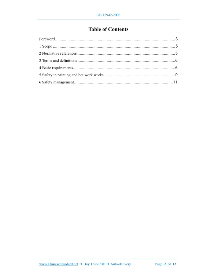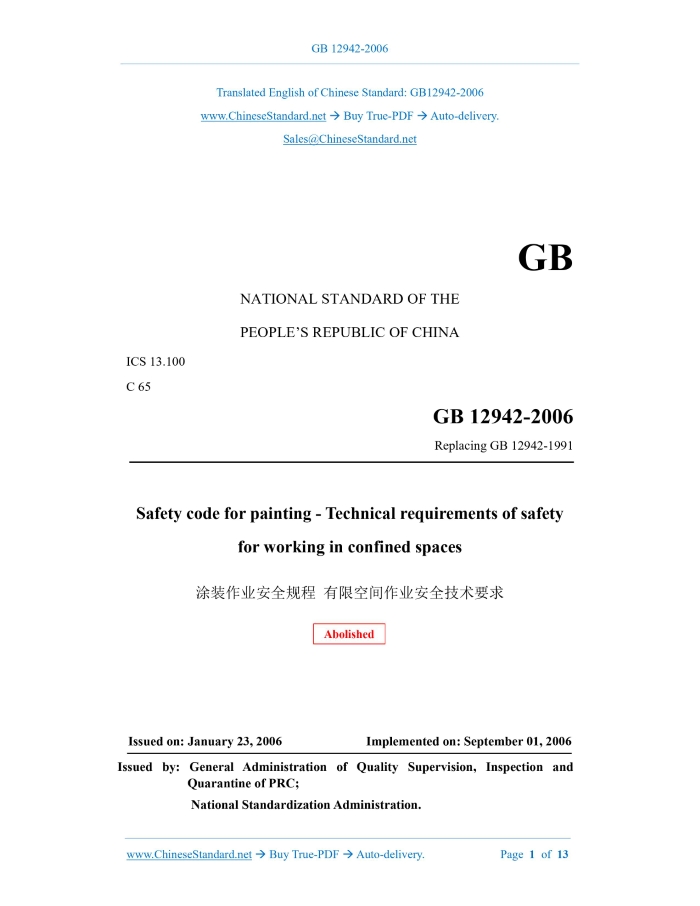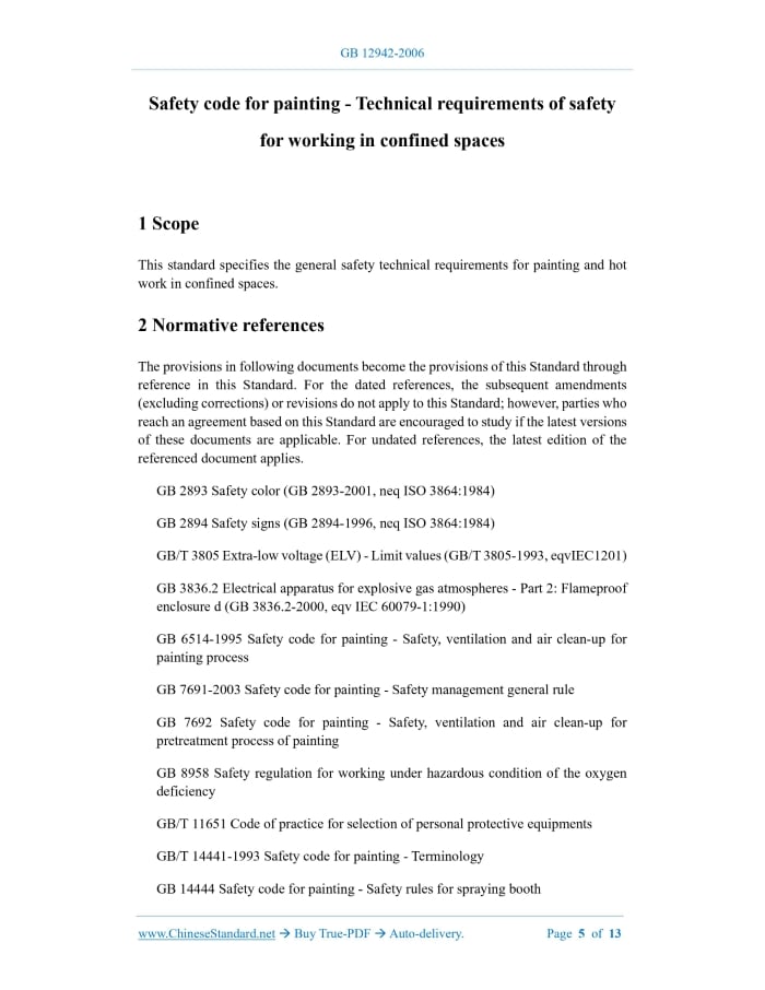Similar standardsGB 12942-2006: Safety code for painting -- Technical requirements of safety for working in confined spaces---This is an excerpt. Full copy of true-PDF in English version (including equations, symbols, images, flow-chart, tables, and figures etc.), auto-downloaded/delivered in 9 seconds, can be purchased online: https://www.ChineseStandard.net/PDF.aspx/GB12942-2006 GB NATIONAL STANDARD OF THE PEOPLE’S REPUBLIC OF CHINA ICS 13.100 C 65 Replacing GB 12942-1991 Safety code for painting - Technical requirements of safety for working in confined spaces ISSUED ON: JANUARY 23, 2006 IMPLEMENTED ON: SEPTEMBER 01, 2006 Issued by: General Administration of Quality Supervision, Inspection and Quarantine of PRC; National Standardization Administration. Abolished Table of ContentsForeword ... 3 1 Scope ... 5 2 Normative references ... 5 3 Terms and definitions ... 6 4 Basic requirements ... 6 5 Safety in painting and hot work works ... 9 6 Safety management ... 11 Safety code for painting - Technical requirements of safety for working in confined spaces1 ScopeThis standard specifies the general safety technical requirements for painting and hot work in confined spaces.2 Normative referencesThe provisions in following documents become the provisions of this Standard through reference in this Standard. For the dated references, the subsequent amendments (excluding corrections) or revisions do not apply to this Standard; however, parties who reach an agreement based on this Standard are encouraged to study if the latest versions of these documents are applicable. For undated references, the latest edition of the referenced document applies. GB 2893 Safety color (GB 2893-2001, neq ISO 3864:1984) GB 2894 Safety signs (GB 2894-1996, neq ISO 3864:1984) GB/T 3805 Extra-low voltage (ELV) - Limit values (GB/T 3805-1993, eqvIEC1201) GB 3836.2 Electrical apparatus for explosive gas atmospheres - Part 2: Flameproof enclosure d (GB 3836.2-2000, eqv IEC 60079-1:1990) GB 6514-1995 Safety code for painting - Safety, ventilation and air clean-up for painting process GB 7691-2003 Safety code for painting - Safety management general rule GB 7692 Safety code for painting - Safety, ventilation and air clean-up for pretreatment process of painting GB 8958 Safety regulation for working under hazardous condition of the oxygen deficiency GB/T 11651 Code of practice for selection of personal protective equipments GB/T 14441-1993 Safety code for painting - Terminology GB 14444 Safety code for painting - Safety rules for spraying booth 11651. 4.1.3 Disconnect the process pipelines leading into the confined space; it is strictly prohibited to block the valves leading to the atmosphere outside the confined space. 4.1.4 The confined space must be secure to prevent rollover, rolling, falling. When the container is manufactured and must be rotated due to confined space due to process requirements, the maximum rotation speed shall be limited. 4.1.5 Liquids and solid sediments in the confined space must be removed in a timely manner, OR other appropriate media must be used for cleaning and replacement; sufficient ventilation must be maintained to discharge dangerous and harmful gases out of the confined space and cool down at the same time, until safe work environments are achieved. 4.1.6 There shall be passages that are convenient for taking first aid measures and fire escapes around the exposed surface of the confined space. Confined spaces with deeper passages must have effective communication methods. 4.1.7 When working at high altitudes in a confined space, scaffolding must be set up and firmly fixed; workers must wear safety harness and safety helmets. 4.2 Occupational safety and hygiene 4.2.1 The oxygen content in the air must be monitored on-site. Under normal pressure conditions, the oxygen content in the air in a confined space shall be 19% ~ 23%. If the oxygen content in the air is lower than 19%, there shall be an alarm signal. 4.2.2 The concentration of flammable gases on site must be monitored. The concentration of flammable gases in the air in a confined space shall be less than 10% of the flammable limit or the lower explosive limit. For the inspection and repair of cargo oil tanks, fuel oil tanks, lubricating oil tanks of ships, as well as the inspection and repair of oil tanks, the concentration of flammable gases in the air in a confined space shall be less than 1% of the lower limit of flammable limit or lower limit of explosion limit. 4.2.3 When it is necessary to enter a confined space lacking oxygen for work, the regulations of GB 8958 shall be complied with. Mechanical ventilation must be used when working to avoid acute poisoning. 4.2.4 According to the working environment and hazardous substances, effective protective equipment for the head, eyes, skin, respiratory system shall be used in accordance with GB/T 11651. If conditions permit, personal respiratory systems that have been widely used abroad can be used or remote-controlled robots can be used. 4.2.5 Personnel who enter a confined space to engage in painting works must dress in strict accordance with the requirements of GB/T 11651. The personal protective equipment issued shall comply with the requirements of GB/T 11651. The personal protective equipment shall be kept centrally by the organization and inspected regularly, to ensure that its performance is effective. 4.2.6 When performing painting works in a confined space, mutual friction, impact, peeling between objects shall be avoided. It is not allowed to take off clothes, hats, gloves, shoes, etc. in the spray painting area. 4.3 Electrical equipment and lighting safety 4.3.1 It is strictly prohibited to use open flame lighting in confined spaces. 4.3.2 All electrical equipment and lighting facilities in the work area shall comply with the requirements of GB 3836.2, to achieve overall electrical explosion-proof. 4.3.3 Explosion-proof lighting fixtures shall be used; the voltage shal