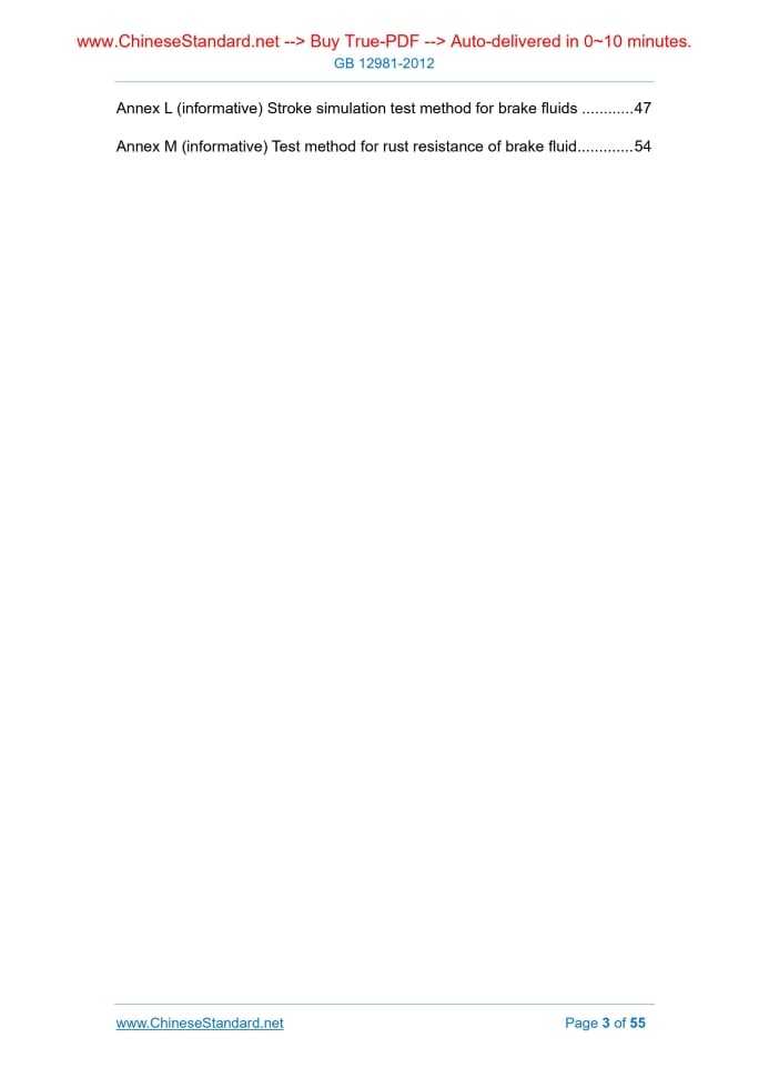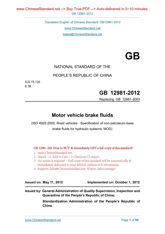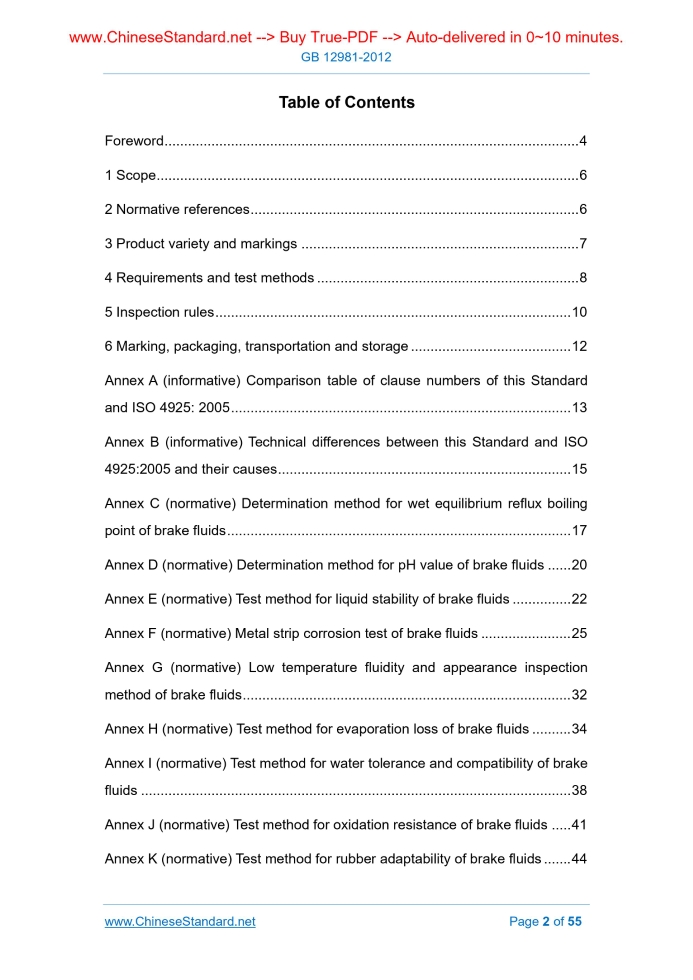 Similar standardsGB 12981-2012: Motor vehicle brake fluids---This is an excerpt. Full copy of true-PDF in English version (including equations, symbols, images, flow-chart, tables, and figures etc.), auto-downloaded/delivered in 9 seconds, can be purchased online: https://www.ChineseStandard.net/PDF.aspx/GB12981-2012GB NATIONAL STANDARD OF THE PEOPLE’S REPUBLIC OF CHINA ICS 75.120 E 39 Replacing GB 12981-2003 Motor vehicle brake fluids (ISO 4925.2005, Road vehicles - Specification of non-petroleum-base brake fluids for hydraulic systems, MOD) Issued on. MAY 11, 2012 Implemented on. OCTOBER 1, 2012 Issued by. General Administration of Quality Supervision, Inspection and Quarantine of the People’s Republic of China; Standardization Administration of the People’s Republic of China. Table of ContentsForeword... 4 1 Scope... 6 2 Normative references... 6 3 Product variety and markings... 7 4 Requirements and test methods... 8 5 Inspection rules... 10 6 Marking, packaging, transportation and storage... 12 Annex A (informative) Comparison table of clause numbers of this Standard and ISO 4925.2005... 13 Annex B (informative) Technical differences between this Standard and ISO 4925.2005 and their causes... 15 Annex C (normative) Determination method for wet equilibrium reflux boiling point of brake fluids... 17 Annex D (normative) Determination method for pH value of brake fluids... 20 Annex E (normative) Test method for liquid stability of brake fluids... 22 Annex F (normative) Metal strip corrosion test of brake fluids... 25 Annex G (normative) Low temperature fluidity and appearance inspection method of brake fluids... 32 Annex H (normative) Test method for evaporation loss of brake fluids... 34 Annex I (normative) Test method for water tolerance and compatibility of brake fluids... 38 Annex J (normative) Test method for oxidation resistance of brake fluids... 41 Annex K (normative) Test method for rubber adaptability of brake fluids... 44 Annex L (informative) Stroke simulation test method for brake fluids... 47 Annex M (informative) Test method for rust resistance of brake fluid... 54ForewordTable 1 of Clause 4 in this Standard is mandatory (except for the test method), the rest is recommended. This Standard is drafted in accordance with the rules given in GB/T 1.1-2009. This Standard replaces GB 12981-2003 “Motor vehicle brake fluids”; compared with GB 12981-2003, main technical changes are as follows. - ADD the content of warnings involving the use safety in this Standard; - CHANGE Clause 1 “Scope” of this Standard; - DELETE “Terms and definitions” in this Standard; MODIFY the heading of Clause 3 TO “Product classification and marking”, the corresponding contents are modified, too; - DELETE silicone brake fluids in Clause 3 of this Standard, that is, HZY5 contains only products corresponding to the international general DOT5.1; ADD HZY6 corresponding to class6 in ISO 4925.2005; ADD the content related to product markings; - The requirements and test methods in Clause 4 are listed in Table 1 and Table 2 respectively; in Table 1, the determination of pH value refers to the method in Annex D, not GB/T 7304; at the same time add Annex D “Determination method for pH value of brake fluids”; - In Table 1 of Clause 4, DELETE the hiding power figure used in the low- temperature fluidity and appearance, water tolerance and fluid compatibility items; in the rubber adaptation item, DELETE the test at 70 °C; ADD determination of volume increment of SBR cup; - In Table 2 of Clause 4, ADD the rust resistance item; MODIFY the stroke simulation test item TO the recommend item; - In Annex F, the formula for calculating the hardness change of the rubber cup is changed from ΔH = H2 - H1 to ΔH = H1 - H2; - ADD Test Method B in Annex H; - MODIFY the name of Annex I TO. test method for water tolerance and compatibility brake fluids; USE compatibility fluid’s national standard sample in the compatibility test. This Standard uses the re-drafting method to amend and adopt ISO 4925.2005 “Road vehicles - Specification of non-petroleum-base brake fluids for hydraulic systems” (English version). Compared with ISO 4925.2005, this Standard has more structural adjustments; a comparison table of clause numbers of this Standard and ISO 4925.2005 is listed in Annex A. There are technical differences between this Standard and ISO 4925.2005; a table of corresponding technical differences and their causes are given in Annex B. This Standard is proposed by National Technical Committee on Petroleum Products and Lubricants of Standardization Administration of China (SAC/TC 280). This Standard is under the jurisdiction of Sub-technical Committee on Synthetic Oil of National Technical Committee on Petroleum Products and Lubricants of Standardization Administration of China (SAC/TC 280/SC 5). Responsible drafting organizations of this Standard. China Petroleum & Chemical Corporation Lubricants Chongqing Branch, Ministry of Communications Highway Science Research Institute, China Standardization Association Automotive Maintenance Products Technology Promotion Committee, Technology Center of China FAW Group, Technology Research Institute of Dongfeng Motor Co., Fujian Laike Lubricating Oil Co., Ltd., Liaoning Rundi Fine Chemical Co., Ltd., PLA General Logistics Department Oil Research Institute, Zhejiang University Fangyuan Chemical Co., Ltd., Wuxi Petrochina Lubricating Grease Co., Ltd. Participating drafting organizations of this Standard. China FAW Group Tianjin Automobile Co., Shanghai Volkswagen Automobile Co., PLA General Logistics Department Military Transportation Research Institute, Zhangjiagang TEEC Automotive Chemicals Co., Ltd., Zhejiang University Fine Chemical Co., Ltd., Jiangyin Yida Chemical Co., Ltd. Main drafters of this Standard. Yan Zili, Zhang Yang, Guo Yiming, Zhang Shuhua, Dai Fumin, Li Chunhui, Liu Jinlong, Leng Guanjun, Shan Jingbo, Yang Xiaojun. The historical version of GB 12