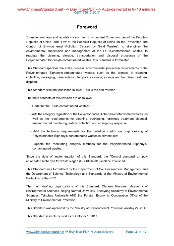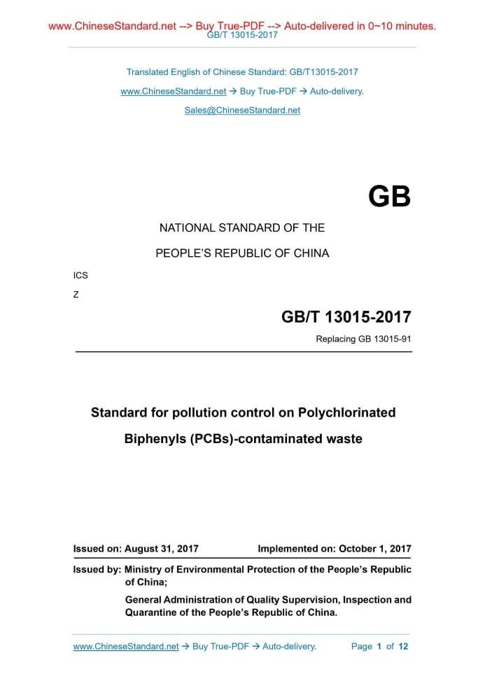 Similar standardsGB 13015-2017: Standard for pollution control on Polychlorinated Biphenyls(PCBs)-contaminated wastes---This is an excerpt. Full copy of true-PDF in English version (including equations, symbols, images, flow-chart, tables, and figures etc.), auto-downloaded/delivered in 9 seconds, can be purchased online: https://www.ChineseStandard.net/PDF.aspx/GB13015-2017 GB NATIONAL STANDARD OF THE PEOPLE’S REPUBLIC OF CHINA ICS Replacing GB 13015-91 Standard for pollution control on Polychlorinated Biphenyls (PCBs)-contaminated wastes Issued on: AUGUST 31, 2017 Implemented on: OCTOBER 1, 2017 Issued by. Ministry of Environmental Protection of the People’s Republic of China; General Administration of Quality Supervision, Inspection and Quarantine of the People’s Republic of China. Table of ContentsForeword. 3 1 Scope of application. 5 2 Normative references.. 5 3 Terms and definitions.. 6 4 Categories of PCBs-contaminated wastes. 8 5 Technical requirements for the harmless management of the PCBs- contaminated wastes.. 8 6 Pollution control requirements for the harmless disposal of PCBs- contaminated wastes.. 10 7 Environmental monitoring requirements during the harmless disposal of PCBs-contaminated wastes. 10 8 Safety protection and emergency response requirements. 11 9 Implementation and supervision.. 12ForewordTo implement laws and regulations such as “Environment Protection Law of the People's Republic of China” and “Law of the People’s Republic of China on the Prevention and Control of Environmental Pollution Caused by Solid Wastes”, to strengthen the environmental supervision and management of the PCBs-contaminated wastes, to regulate the cleaning, storage, transportation and disposal processes of the Polychlorinated Biphenyls-contaminated wastes, this Standard is formulated. This Standard specifies the entire process’ environmental protection requirements of the Polychlorinated Biphenyls-contaminated wastes, such as the process of cleaning, collection, packaging, transportation, temporary storage, storage and harmless treatment disposal. This Standard was first published in 1991.This is the first revision. The main contents of this revision are as follows. - Redefine the PCBs-contaminated wastes; - Add the category regulation of the Polychlorinated Biphenyls-contaminated wastes, as well as the requirements for cleaning, packaging, harmless treatment disposal, environmental monitoring, safety protection and emergency response; - Add the technical requirements for the pollution control on co-processing of Polychlorinated Biphenyls-contaminated wastes in cement kiln; - Update the monitoring analysis methods for the Polychlorinated Biphenyls- contaminated wastes. Since the date of implementation of this Standard, the "Control standard on poly chlorinated biphenyls for waste slags " (GB 13015-91) shall be abolished. This Standard was formulated by the Department of Soil Environment Management and the Department of Science, Technology and Standards of the Ministry of Environmental Protection of the PRC. The main drafting organizations of this Standard. Chinese Research Academy of Environmental Sciences, Beijing Normal University, Shenyang Academy of Environmental Sciences, Tsinghua University AND the Foreign Economic Cooperation Office of the Ministry of Environmental Protection. This Standard was approved by the Ministry of Environmental Protection on May 27, 2017. This Standard is implemented as of October 1, 2017. Standard for pollution control on Polychlorinated Biphenyls(PCBs)-contaminated wastes 1 Scope of application This Standard specifies the categories of Polychlorinated Biphenyls-contaminated wastes, as well as the entire process’ environmental protection requirements of the Polychlorinated Biphenyls-contaminated wastes, such as the process of cleaning, collection, packaging, transportation, temporary storage, storage and harmless treatment disposal. This Standard is applicable to the pollution control and supervision & management of the entire process of classification, harmless management and harmless disposal of Polychlorinated Biphenyls-contaminated wastes. For the wastes whose content of Polychlorinated Biphenyls is less than 50mg/kg, they shall be performed the harmless management according to general industrial solid wastes. 2 Normative references The following documents contain the provisions which, through reference in this Standard, become the provisions of this Standard. For undated reference documents, the latest versions apply to this Standard. GB 5085.3 Identification standards for hazardous wastes - Identification for extraction toxicity GB 5085.6 Identification standards for hazardous wastes - Identification for toxic substance content GB 8978 Integrated wastewater discharge standard GB 12463 General specifications for transport packages of dangerous goods GB 18484 Pollution control standard for hazardous wastes incineration GB 18597 Standard for pollution control on hazardous waste storage GB 18598 Standard for pollution control on the security landfill site for hazardous wastes GB 30485 Standard for pollution control on co-processing of solid wastes in cement kiln 4 Categories of PCBs-contaminated wastes The PCBs-contaminated wastes include the following seven categories. I. The PCBs-containing equipment not in service, or the sealed PCBs-containing equipment; II. Liquid Polychlorinated Biphenyls or the non-aqueous liquid wastes containing the Polychlorinated Biphenyls; III. The immersion wastewater at sealed point of the PCBs-contaminated wastes, and other cleaning wastewater; IV. PCBs-contaminated soil which is performed by the ectopic and harmless disposal; V. The original package when sealing the PCBs-containing equipment; VI. The original building materials when sealing the PCBs-containing equipment, such as the cement, rock, slag and brick; VII. Other wastes, substances and articles, which contains or are contaminated with the P