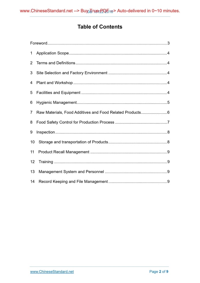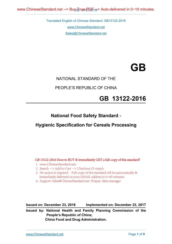 Similar standardsGB 13122-2016: Hygienic specifications of flour milling factory---This is an excerpt. Full copy of true-PDF in English version (including equations, symbols, images, flow-chart, tables, and figures etc.), auto-downloaded/delivered in 9 seconds, can be purchased online: https://www.ChineseStandard.net/PDF.aspx/GB13122-2016GB NATIONAL STANDARD OF THE PEOPLE’S REPUBLIC OF CHINA National Food Safety Standard - Hygienic Specification for Cereals Processing Issued on: DECEMBER 23, 2016 Implemented on: DECEMBER 23, 2017 Issued by. National Health and Family Planning Commission of the People’s Republic of China; China Food and Drug Administration. 3. No action is required - Full-copy of this standard will be automatically & immediately delivered to your EMAIL address in 0~60 minutes. Table of ContentsForeword ... 3 1 Application Scope ... 4 2 Terms and Definitions ... 4 3 Site Selection and Factory Environment ... 4 4 Plant and Workshop ... 4 5 Facilities and Equipment ... 4 6 Hygienic Management ... 5 7 Raw Materials, Food Additives and Food Related Products ... 6 8 Food Safety Control for Production Process ... 7 9 Inspection ... 8 10 Storage and transportation of Products ... 8 11 Product Recall Management ... 9 12 Training ... 9 13 Management System and Personnel ... 9 14 Record Keeping and File Management ... 9ForewordThis Standard replaces GB 13122-1991, Hygienic Specifications of Flour Milling Factory. Compared with GB 13122, the major changes of this Standard are as follows. -- the standard name is changed into “National Food Safety Standard – Hygienic Specification for Cereals Processing ”; -- the application scope is extended; -- the framework of standard clauses is modified; -- the specific requirements for product tracing and recall are added; -- the management requirements for records and documents are added. National Food Safety Standard - Hygienic Specification for Cereals Processing1 Application ScopeThis Standard specifies the basic requirements and management guidelines for sites, facilities and personnel during material purchase, processing, packaging, storage and transportation and others in the process of processing cereals into rice, wheat flour, corn ballast, corn flour and other primary products through physical methods such as machinery. This Standard applies to the processing of cereals into rice, wheat flour, corn ballast, corn flour and other primary products through physical methods such as machinery.2 Terms and DefinitionsFor the purposes of this document, the terms and definitions defined in GB 14881- 2013 apply. 2.1 Cereals The seeds of grass family herbaceous plants, such as rice, corn, sorghum, barley, highland barley and so on.3 Site Selection and Factory EnvironmentAs specified in Article 3 of GB 14881-2013.4 Plant and Workshop4.1 As specified in Article 4 of GB 14881-2013. 4.2 Floors which are used to stack and dry cereals, semi-finished products and finished products, shall not be paved with materials containing hazardous substances such as asphalt.5 Facilities and Equipment5.1 Facilities As specified in 5.1 of GB 14881-2013. 5.2 Equipment 5.2.1 As specified in 5.2 of GB 14881-2013. 5.2.2 Warehouses shall be provided with the equipment for cereals condition monitoring including cereals temperature and warehouse temperature, temperature- humidity regulation such as ventilation, cereals safe storage such as prevention and control of insect pests, rats and birds. 5.2.3 The outlets for dust emission shall be provided with dust control devices.6 Hygienic Management6.1 Management system As specified in 6.1 of GB 14881-2013. 6.2 Hygienic management of factory environment 6.2.1 Factory areas and areas adjacent to workshops shall be kept clean. Roads and floors within factory areas shall be maintained well without damages and prevented from dust and ponding water. 6.2.2 Keep the environment within factory areas clean and tidy and do not stack or store debris and unnecessary appliances and materials, to prevent pests generating. 6.2.3 Plants which are liable to produce pollen shall not be grown within the areas adjacent to workshops. 6.3 Hygienic management of plant and facilities 6.3.1 As specified in 6.2 of GB 14881-2013. 6.3.2 Measures (such as screen windows, air curtains, fences, moth-killing lamps and so on) shall be taken for production operation sites to prevent the intrusion of pests. 6.3.3 Workshop water storage tanks (towers and ponds) shall be cleaned periodically; the cleaning conditions shall be reported; those which requires necessary sterilization shall be certified for the effects of sterilization. 6.3.4 The water used to clean the equipment and tools in contact with products shall be as specified in GB 5749. 6.3.5 The detergents used to clean the equipment and tools in contact with products shall be as specified in GB 14930.1. 6.3.6 Maintenance shall be carried out periodically for the filtration system of 8.4 Physical pollution control As specified in 8.4 of GB 14881-2013. 8.5 Production process 8.5.1 Impurities and mouldy kernels shall be removed in the cleaning of raw materials to prevent impurities entering into subsequent procedures and causing product pollution. 8.5.2 Water used for production shall be as specified in GB 5749. 8.5.3 Effective measures shall be taken to prevent metals or other foreign materials coming into products. 8.5.4 During the production process, repairs of production equipment shall not be carried out on site. 8.5.5 Enhance daily maintenance of equipment and keep equipment clean. Correct operating procedures shall be carried out for the maintenance of equipment. The faults of equipment shall be removed on a timely basis to prevent influencing product quality and hygiene. Before production is started each time, check whether equipment is in the normal status. All production equipment shall be overhauled periodically and records of maintenance shall be taken. 8.6 Packaging 8.6.1 As specified in 8.