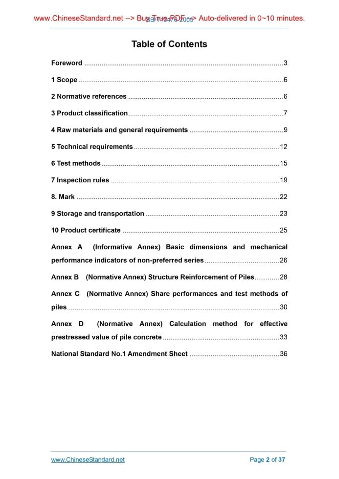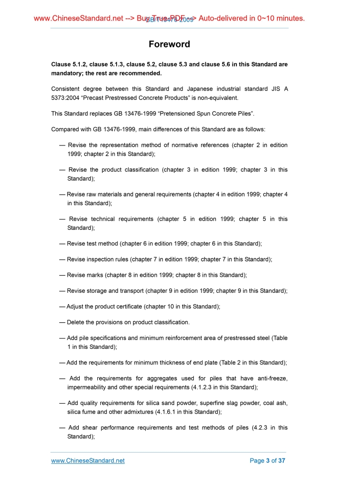 Similar standardsGB 13476-2009: [GB/T 13476-2009] Pretensioned spun concrete piles [including 2014 MODIFICATION 1]---This is an excerpt. Full copy of true-PDF in English version (including equations, symbols, images, flow-chart, tables, and figures etc.), auto-downloaded/delivered in 9 seconds, can be purchased online: https://www.ChineseStandard.net/PDF.aspx/GB13476-2009 GB NATIONAL STANDARD OF THE PEOPLE’S REPUBLIC OF CHINA ICS 91.100.30 Q 14 GB/T 13476-2009 Replacing GB/T 13476-1999 Pretensioned Spun Concrete Piles (Translator Note. Please note that there is an Amendment Sheet for this Standard) Issued on: MARCH 28, 2009 Implemented on: MARCH 01, 2010 Issued by. General Administration of Quality Supervision, Inspection and Quarantine of the People’s Republic of China; Standardization Administration of the People’s Republic of China. Table of ContentsForeword... 3 1 Scope... 6 2 Normative references... 6 3 Product classification... 7 4 Raw materials and general requirements... 9 5 Technical requirements... 12 6 Test methods... 15 7 Inspection rules... 19 8.Mark... 22 9 Storage and transportation... 23 10 Product certificate... 25 Annex A (Informative Annex) Basic dimensions and mechanical performance indicators of non-preferred series... 26 Annex B (Normative Annex) Structure Reinforcement of Piles... 28 Annex C (Normative Annex) Share performances and test methods of piles... 30 Annex D (Normative Annex) Calculation method for effective prestressed value of pile concrete... 33 National Standard No.1 Amendment Sheet... 36ForewordClause 5.1.2, clause 5.1.3, clause 5.2, clause 5.3 and clause 5.6 in this Standard are mandatory; the rest are recommended. Consistent degree between this Standard and Japanese industrial standard JIS A 5373.2004 “Precast Prestressed Concrete Products” is non-equivalent. This Standard replaces GB 13476-1999 “Pretensioned Spun Concrete Piles”. Compared with GB 13476-1999, main differences of this Standard are as follows. — Revise the representation method of normative references (chapter 2 in edition 1999; chapter 2 in this Standard); — Revise the product classification (chapter 3 in edition 1999; chapter 3 in this Standard); — Revise raw materials and general requirements (chapter 4 in edition 1999; chapter 4 in this Standard); — Revise technical requirements (chapter 5 in edition 1999; chapter 5 in this Standard); — Revise test method (chapter 6 in edition 1999; chapter 6 in this Standard); — Revise inspection rules (chapter 7 in edition 1999; chapter 7 in this Standard); — Revise marks (chapter 8 in edition 1999; chapter 8 in this Standard); — Revise storage and transport (chapter 9 in edition 1999; chapter 9 in this Standard); — Adjust the product certificate (chapter 10 in this Standard); — Delete the provisions on product classification. — Add pile specifications and minimum reinforcement area of prestressed steel (Table 1 in this Standard); — Add the requirements for minimum thickness of end plate (Table 2 in this Standard); — Add the requirements for aggregates used for piles that have anti-freeze, impermeability and other special requirements (4.1.2.3 in this Standard); — Add quality requirements for silica sand powder, superfine slag powder, coal ash, silica fume and other admixtures (4.1.6.1 in this Standard); — Add shear performance requirements and test methods of piles (4.2.3 in this Standard); Wang Chong, Yu Yuanbao, Wei Yiling, Wang Xinxiang, Xu Xiangyuan, Yu Yachao, He Yaohui, Lang Wengang, Zhou Zhaodi, Xu Xinghua, Zhang Jiechun, Zhang Yao, Huang Haiyan, Xie Xiaofeng, Xie Biao and Liao Zhenzhong. This Standard was first-time released in 1992 and first-time revised in 1999.This is the second revision. Pretensioned Spun Concrete Piles1 ScopeThis Standard specifies the pretensioned spun concrete piles (hereinafter referred to as piles) - classification, raw materials and general requirements, technical requirements, testing methods, inspection rules, marking, storage and transportation, product certificate, etc. This Standard applies to centrifugal shaping pretensioned concrete piles for industrial and civil buildings, ports, municipal works, bridges, railways, highways, water conservancy and other projects.2 Normative referencesThe articles contained in the following documents have become part of this document when they are quoted herein. For the dated documents so quoted, all subsequent modifications (including all corrections) or revisions made thereafter do not apply to this Standard. However, the parties who reach an agreement according to this Standard are encouraged to study whether the latest versions of these documents may be used. For the undated documents so quoted, the latest versions (including all modification sheets) apply to this document. GB 175 Common Portland cement GB/T 700 Carbon structural steels GB/T701 Hot rolled low carbon steel wire rods GB 1499.2 Steel for the reinforcement of concrete - Part 2.Hot rolled ribbed bars GB/T 1596-2005 Fly ash used for cement and concrete GB/T 5223.3-2005 Steel bars prestressed concrete GB 8076 Concrete admixtures GB/T 14684 Sand for building GB/T 14685 Pebble and crushed stone for building GB/T 18046-2008 Ground granulated blast furnace slag used for cement and concrete GB/T 18736-2002 Mineral admixtures for high strength and high performance concrete GB/T 50081 Standard for test method of mechanical properties on ordinary concrete GB 50164 Standard foe quality control of concrete GBJ 107 Standard for evaluation of concrete compressive strength JC/T 540 Cold-drawn low-carbon wire for concrete products JC/T 94 End plate for pretensioned spun concrete piles JC/T 950-2005 Ground silica sand used for pretensioned spun high-strength concrete piles JGJ 63 Standard of water for concrete3 Product classification3.1 Product class and code Piles are divided into prestressed concrete piles and prestressed high-strength concrete piles. The code of prestressed c