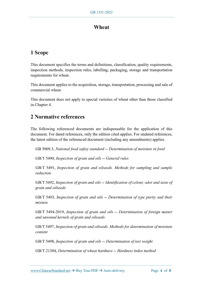 GB 1351-2023: Wheat---This is an excerpt. Full copy of true-PDF in English version (including equations, symbols, images, flow-chart, tables, and figures etc.), auto-downloaded/delivered in 9 seconds, can be purchased online: https://www.ChineseStandard.net/PDF.aspx/GB1351-2023GB NATIONAL STANDARD OF THE PEOPLE’S REPUBLIC OF CHINA ICS 67.060 CCS B 22 Replacing GB 1351-2008 Wheat ISSUED ON: MAY 23, 2023 IMPLEMENTED ON: DECEMBER 01, 2023 Issued by: State Administration for Market Regulation; Standardization Administration of the People's Republic of China. Table of ContentsForeword ... 3 1 Scope ... 4 2 Normative references ... 4 3 Terms and definitions ... 5 4 Classification ... 6 5 Quality requirements ... 7 6 Inspection methods ... 7 7 Inspection rules ... 7 8 Labelling ... 8 9 Packaging, storage and transportation ... 8 Wheat1 ScopeThis document specifies the terms and definitions, classification, quality requirements, inspection methods, inspection rules, labelling, packaging, storage and transportation requirements for wheat. This document applies to the acquisition, storage, transportation, processing and sale of commercial wheat. This document does not apply to special varieties of wheat other than those classified in Chapter 4.2 Normative referencesThe following referenced documents are indispensable for the application of this document. For dated references, only the edition cited applies. For undated references, the latest edition of the referenced document (including any amendments) applies. GB 5009.3, National food safety standard -- Determination of moisture in food GB/T 5490, Inspection of grain and oils -- General rules GB/T 5491, Inspection of grain and oilseeds. Methods for sampling and sample reduction GB/T 5492, Inspection of grain and oils -- Identification of colour, odor and taste of grain and oilseeds GB/T 5493, Inspection of grain and oils -- Determination of type purity and their mixture GB/T 5494-2019, Inspection of grain and oils -- Determination of foreign matter and unsound kernels of grain and oilseeds GB/T 5497, Inspection of grain and oilseeds. Methods for determination of moisture content GB/T 5498, Inspection of grain and oils -- Determination of test weight GB/T 21304, Determination of wheat hardness -- Hardness index method3 Terms and definitionsFor the purposes of this document, the following terms and definitions apply. 3.1 test weight The mass of wheat grains per unit volume. NOTE: Expressed in grams per liter (g/L). 3.2 defected kernel Wheat kernels that are damaged but still usable. NOTE 1: Including insect-bored kernels, diseased kernels, heat-damaged kernels, broken kernels, sprouted kernels and moldy kernels. NOTE 2: Insect-bored kernels are kernels that have been damaged by insects, with the embryo or endosperm damaged. NOTE 3: Diseased kernels (mottled kernels) refer to kernels with disease spots on the surface, which damage the embryo or endosperm; diseased kernels include black point kernels and fusarium damaged kernels. Black point kernels refer to kernels with obvious dark brown or black seed coats in the embryo or other parts, which damage the embryo or endosperm. Fusarium damaged kernels refer to kernels that are wrinkled, dull white, or have purple kernels, or have obvious pink moldy substances, with black ascocarps in between. NOTE 4: Heat-damaged kernels refer to kernels that have changed their normal color or been damaged due to heat generation or heat exposure caused by microorganisms or other reasons. NOTE 5: Broken kernels are kernels that are crushed, broken, or have damaged embryo or endosperm. NOTE 6: Sprouted kernels are kernels whose seed coat has ruptured at the embryonic part although the bud or rootlet has not yet broken through the seed coat, or whose bud or rootlet has broken through the seed coat but does not exceed the length of the kernel itself. NOTE 7: Mouldy kernels refer to kernels that are moldy. 3.3 impurities; useless material Other materials other than wheat, and wheat of no use value. NOTE 1: Including screenings, inorganic impurities and organic impurities. NOTE 2: Screenings refer to the material that passes through a sieve with a round hole of 1.5 mm in diameter. NOTE 3: Inorganic impurities refer to soil, sand, gravel, bricks and tiles and other inorganic substances. NOTE 4: Organic impurities refer to foreign grains, wheat of no use value and other organic substances other than wheat. NOTE 5: Wheat with no use value refers to grains that cannot be used as wheat raw materials, including: wheat that has completely changed color and deteriorated, wheat with sprouts longer than the length of the grain, wheat with nematode disease, wheat with bunt disease, etc. 3.4 color and brightness The colour and luster of a batch of wheat under specified conditions. 3.5 odor The smell of a batch of wheat under specified conditions. 3.6 wheat hardness The ability of wheat kernels to resist deformation and breakage under external forces. 3.7 wheat hardness index The wheat sample is crushed under specified conditions. The wheat hardness index refers to the mass fraction of the sample retained on the sieve. NOTE: Expressed by HI.4 ClassificationWheat is classified by kernel hardness and seed coat color as follows: a) Hard white wheat: wheat with a seed coat of not less than 90% white or yellowish- white and a wheat hardness index of not less than 60; b) Hard red wheat: wheat with a seed coat of not less than 90% dark red or reddish brown and a wheat hardness index of not less than 60; c) Soft white wheat: wheat with a seed coat of not less than 90% white or yellowish- white, and a wheat hardness index of not more than 45; d) Soft red wheat: wheat with a seed coat of not less than 90% dark red or reddish brown and a wheat hardness index of not more than 45; e) Mixed wheat: wheat that does not meet the requirements of a) to d). NOTE: Wheat with seed coats of purple, black, and other colors is a special variety of wheat. ....