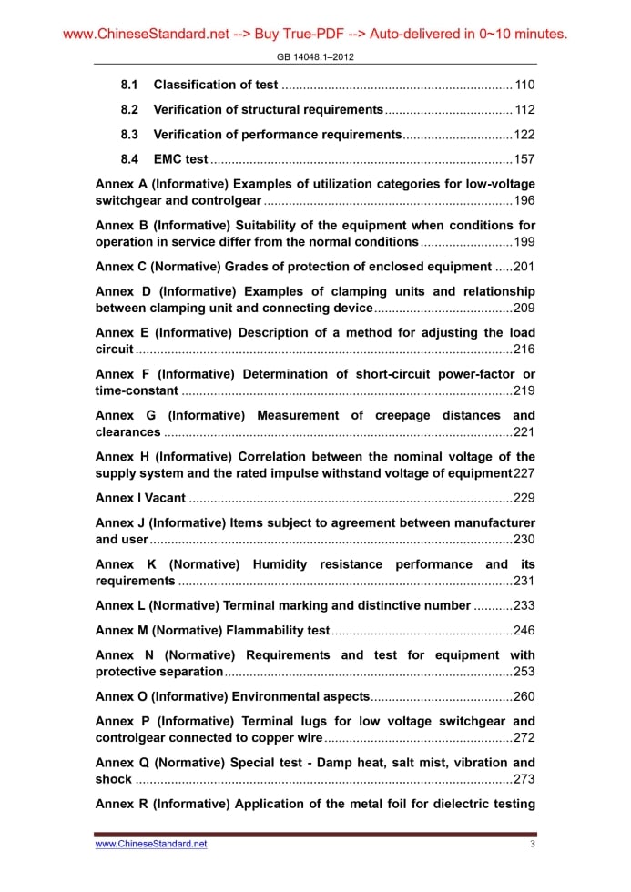 Similar standardsGB 14048.1-2012: [GB/T 14048.1-2012] Low-voltage switchgear and controlgear -- Part 1: General rules---This is an excerpt. Full copy of true-PDF in English version (including equations, symbols, images, flow-chart, tables, and figures etc.), auto-downloaded/delivered in 9 seconds, can be purchased online: https://www.ChineseStandard.net/PDF.aspx/GB14048.1-2012 ICS 29.130.01 K 30 NATIONAL STANDARD OF THE PEOPLE’S REPUBLIC OF CHINA Replace GB 14048.1–2006 Low-voltage switchgear and controlgear - Part 1.General rules (IEC 60947-1.2011, MOD) Issued on: DECEMBER 31, 2012 Implemented on: DECEMBER 01, 2013 Issued by. General Administration of Quality Supervision, Inspection and Quarantine of the People’s Republic of China; Standardization Administration of the People’s Republic of China Table of ContentsForeword... 5 1 Basic requirements... 10 1.1 Scope and objective... 12 1.2 Normative references... 13 2 Terms and definitions... 18 3 Classification... 61 4 Characteristics... 61 4.1 Briefing of characteristics... 62 4.2 Type of equipment... 62 4.3 Rated value and limiting value of the main circuit... 62 4.4 Utilization category... 72 4.5 Control circuits... 72 4.6 Auxiliary circuits... 74 4.7 Relays and releases... 74 4.8 Co-ordination with short-circuit protective devices (SCPD)... 74 4.9 Switching over-voltages... 75 5 Product information... 75 5.1 Nature of information... 75 5.2 Marking... 77 5.3 Instructions for installation, operation and maintenance... 78 6 Normal service, mounting and transport conditions... 79 6.1 Normal service conditions... 79 6.2 Conditions during transport and storage... 82 6.3 Mounting... 82 7 Structural and performance requirements... 83 7.1 Structural requirements... 83 7.2 Performance requirements... 95 7.3 Electromagnetic compatibility (EMC)... 107 8 Test... 110 8.1 Classification of test... 110 8.2 Verification of structural requirements... 112 8.3 Verification of performance requirements... 122 8.4 EMC test... 157 Annex A (Informative) Examples of utilization categories for low-voltage switchgear and controlgear... 196 Annex B (Informative) Suitability of the equipment when conditions for operation in service differ from the normal conditions... 199 Annex C (Normative) Grades of protection of enclosed equipment... 201 Annex D (Informative) Examples of clamping units and relationship between clamping unit and connecting device... 209 Annex E (Informative) Description of a method for adjusting the load circuit... 216 Annex F (Informative) Determination of short-circuit power-factor or time-constant... 219 Annex G (Informative) Measurement of creepage distances and clearances... 221 Annex H (Informative) Correlation between the nominal voltage of the supply system and the rated impulse withstand voltage of equipment 227 Annex I Vacant... 229 Annex J (Informative) Items subject to agreement between manufacturer and user... 230 Annex K (Normative) Humidity resistance performance and its requirements... 231 Annex L (Normative) Terminal marking and distinctive number... 233 Annex M (Normative) Flammability test... 246 Annex N (Normative) Requirements and test for equipment with protective separation... 253 Annex O (Informative) Environmental aspects... 260 Annex P (Informative) Terminal lugs for low voltage switchgear and controlgear connected to copper wire... 272 Annex Q (Normative) Special test - Damp heat, salt mist, vibration and shock... 273 Annex R (Informative) Application of the metal foil for dielectric testing on accessible parts during operation or adjustment... 280 Annex S (Normative) Digital inputs and outputs... 286 Annex T (Normative) Extended functions within electronic overload relays... 302 Annex U (Informative) Examples of control circuit configurations... 310 Reference Documents... 313 References and Original Chinese Documents... 315ForewordSub-clauses 7.1.2, 7.1.4, 7.1.7, 7.1.10, 7.2.3, 7.2.4 (excluding 7.2.4.3), 7.2.5, 7.2.7, 7.3, 8.2.1.1, 8.2.5, 8.3.3.4, 8.3.3.5, 8.3.3.6, 8.3.4, 8.4 and Annex K of this Part are mandatory. The rest sub-clauses are recommendatory. GB 14048 Low-voltage switchgear and controlgear series standards are divided into 18 parts. — GB 14048.1 Low-voltage switchgear and controlgear—Part 1.General rules — GB 14048.2 Low-voltage switchgear and controlgear - Part 2.Circuit-breakers — GB 14048.3 Low-voltage switchgear and controlgear - Part 3.Switches disconnectors switch-disconnectors and fuse-combination units — GB 14048.4 Low-voltage switchgear and controlgear—Part 4-1.Contactors and motor-starters—Electromechanical contactors and motor-starters(Including motor protector) — GB 14048.5 Low-voltage switchgear and controlgear - Part 5-1.Control circuit devices and switching element - Electromechanical control circuit devices — GB 14048.6 Low-voltage switchgear and controlgear - Part 4-2.Contactors and motor-starters AC semiconductor motor controllers and starters(including soft-starter) — GB 14048.7 Low-voltage switchgear and controlgear - Part 7-1.Ancillary equipment - Terminal blocks for copper conductors — GB 14048.8 Low-voltage switchgear and controlgear - Part 7-2.Ancillary equipment - Protective conductor terminal blocks for copper conductors — GB 14048.9 Low-voltage switchgear and controlgear - Section 6-2.Multiple function equipment control and protective switching devices (or equipment) (CPS) — GB 14048.10 Low-voltage switchgear and controlgear - Part 5-2.Control circuit devices and switching element - Proximity switches — GB 14048.11 Low-voltage switchgear and controlgear - Part 6-1.Multiple function equipment - Transfer switching equipment — GB 14048.12 Low-voltage switchgear and controlgear - Part 4-3.Contactors and motor-starters-AC semiconductor controllers and contactors for non-motor loads — GB 14048.13 Low-voltage switchgear and controlgear - Part 5-3.Control circuit devices and switching elements - Requirements for proximity devices with defined behav