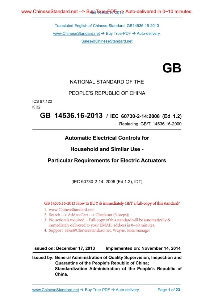 GB 14536.16-2013: [GB/T 14536.16-2013] Automatic electrical controls for household and similar use -- Particular requirements for electric actuators Delivery: 9 seconds. True-PDF full-copy in English & invoice will be downloaded + auto-delivered via email. See step-by-step procedure Status: Valid GB 14536.16: Historical versions