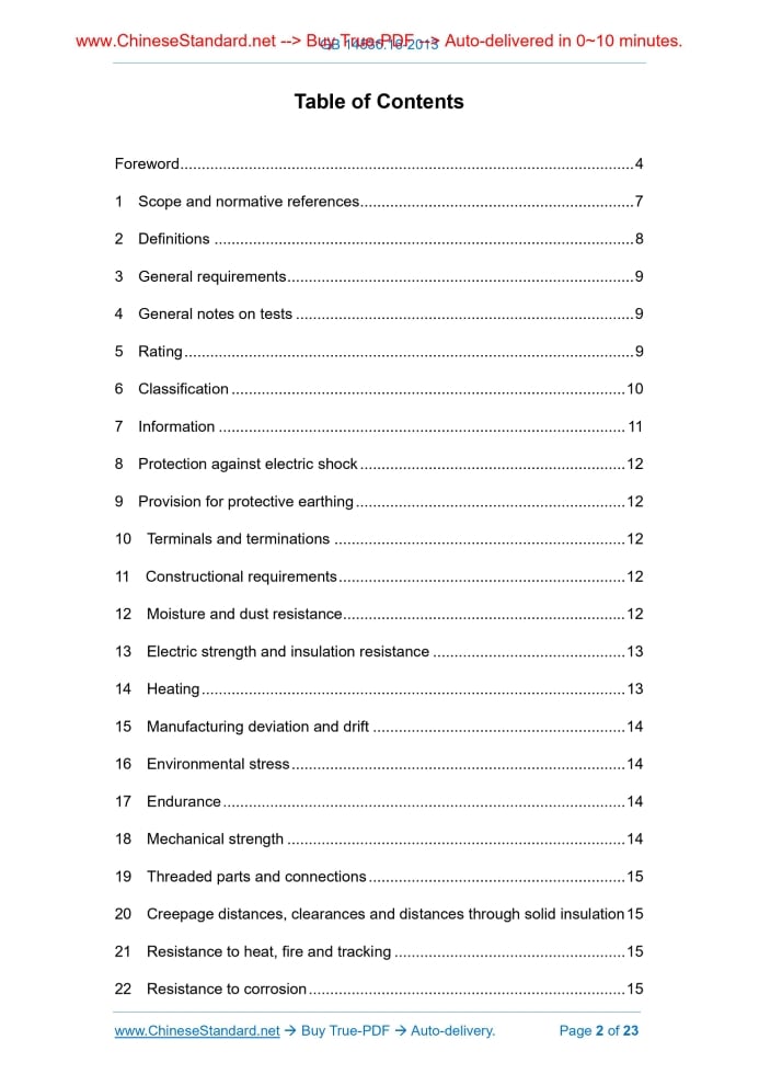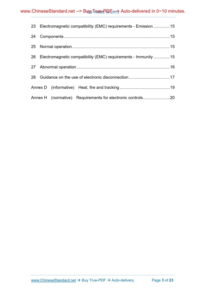 Similar standardsGB 14536.16-2013: [GB/T 14536.16-2013] Automatic electrical controls for household and similar use -- Particular requirements for electric actuators---This is an excerpt. Full copy of true-PDF in English version (including equations, symbols, images, flow-chart, tables, and figures etc.), auto-downloaded/delivered in 9 seconds, can be purchased online: https://www.ChineseStandard.net/PDF.aspx/GB14536.16-2013 GB NATIONAL STANDARD OF THE PEOPLE’S REPUBLIC OF CHINA ICS 97.120 K 32 GB 14536.16-2013 / IEC 60730-2-14.2008 (Ed 1.2) Replacing GB/T 14536.16-2000 Automatic Electrical Controls for Household and Similar Use - Particular Requirements for Electric Actuators [IEC 60730-2-14.2008 (Ed 1.2), IDT] Issued on: DECEMBER 17, 2013 Implemented on: NOVEMBER 14, 2014 Issued by. General Administration of Quality Supervision, Inspection and Quarantine of the People's Republic of China; Standardization Administration of the People's Republic of China. 3.No action is required - Full-copy of this standard will be automatically & immediately delivered to your EMAIL address in 0~60 minutes. Table of ContentsForeword... 4 1 Scope and normative references... 7 2 Definitions... 8 3 General requirements... 9 4 General notes on tests... 9 5 Rating... 9 6 Classification... 10 7 Information... 11 8 Protection against electric shock... 12 9 Provision for protective earthing... 12 10 Terminals and terminations... 12 11 Constructional requirements... 12 12 Moisture and dust resistance... 12 13 Electric strength and insulation resistance... 13 14 Heating... 13 15 Manufacturing deviation and drift... 14 16 Environmental stress... 14 17 Endurance... 14 18 Mechanical strength... 14 19 Threaded parts and connections... 15 20 Creepage distances, clearances and distances through solid insulation 15 21 Resistance to heat, fire and tracking... 15 22 Resistance to corrosion... 15 23 Electromagnetic compatibility (EMC) requirements - Emission... 15 24 Components... 15 25 Normal operation... 15 26 Electromagnetic compatibility (EMC) requirements - Immunity... 15 27 Abnormal operation... 16 28 Guidance on the use of electronic disconnection... 17 Annex D (informative) Heat, fire and tracking... 19 Annex H (normative) Requirements for electronic controls... 20ForewordAll the technical content of this Part is compulsory. GB 14536, Automatic Electrical Controls for Household and Similar Use, comprises two parts as follows. -- Part 1.General Requirements; -- Part 2.Particular Requirements. Particular Requirements consist of the parts as follows. -- GB 14536.3, Particular Requirements for Thermal Motor Protectors (IEC 60730- 2-2, IDT); -- GB 14536.4, Particular Requirements for Thermal Protectors for Ballasts for Tubular Fluorescent Lamps (IEC 60730-2-3, IDT); -- GB 14536.5, Particular Requirements for Thermal Motor Protectors for Motor- Compressors of Hermetic and Semi-hermetic Type (IEC 60730-2-4, IDT); -- GB 14536.6, Particular Requirements for Automatic Electrical Burner Control Systems (IEC 60730-2-5, IDT); -- GB 14536.7, Particular Requirements for Automatic Electrical Pressure Sensing Controls Including Mechanical Requirements (IEC 60730-2-6, IDT); -- GB 14536.8, Particular Requirements for Timers and Time Switches (IEC 60730- 2-7, IDT); -- GB 14536.9, Particular Requirements for Electrically Operated Water Valves Including Mechanical Requirements (IEC 60730-2-8, IDT); -- GB 14536.10, Particular Requirements for Temperature Sensing Controls (IEC 60730-2-9, IDT); -- GB 14536.11, Particular Requirements for Motor-Starting Relays (IEC 60730-2- 10, IDT) -- GB 14536.12, Particular Requirements for Energy Regulators (IEC 60730-2-11, IDT); -- GB 14536.13, Particular Requirements for Electrically Operated Door Locks (IEC 60730-2-12, IDT); -- GB 14536.15, Particular Requirements for Humidity Sensing Controls (IEC 60730-2-13, IDT); -- GB 14536.16, Particular Requirements for Electric Actuators (IEC 60730-2-14, IDT); -- GB 14536.17, Particular Requirements for Automatic Electrical Water Level Sensing Controls of the Float or Electrode-sensor Type Used in Boiler Applications (IEC 60730-2-15, IDT); -- GB 14536.18, Particular Requirements for Automatic Electrical Water Level Controls of the Float Type for Household and Similar Applications (IEC 60730-2- 16, IDT); -- GB 14536.19, Particular Requirements for Electrically Operated Gas Valves Including Mechanical Requirements (IEC 60730-2-17, IDT); -- GB 14536.20, Particular Requirements for Automatic Electric Water and Air Flow Sensing Controls Including Mechanical Requirements (IEC 60730-2-18, IDT); -- GB 14536.21, Particular requirements for electrically operated oil valves including mechanical requirements (IEC 60730-2-19, IDT); This Part is GB 14536.16.This Part shall be used in conjunction with GB 14536.1- 2008, Automatic Electrical Controls for Household and Similar Use - Part 1.General Requirements. This Part was drafted in accordance with the rules given in GB/T 1.1-2009. This Part replaces GB 14536.16-2000, Particular Requirements for Electric Actuators. The major changes of this Part compared with GB 14536.16-2000 are as follows. 1) IEC Foreword is deleted; 2) 6.1.1 of Clause 6 was “delete two explanatory paragraphs”; and not it is added with “AC controls”. 6.3.102 is the newly-added content; 3) 7.3.1 of Clause 7 is the newly-added content; 4) the newly added content applies to the figures in GB 14536.1; 5) the modifications of the requirements of Annex H. the newly-added content includes H.11, H.11.12, H.11.12.8, H.11.12.8.1, H.26.1, H.26.5.3, H.26.5.3.101, H.26.8, H.26.8.3, H.26.9.3, H.26.9.3.101, H.26.13.3, H.26.13.3.101, H.26.14, H.26.14.3, H.26.14.3.101, H.26.15.4; the deleted content includes H.26.4, H.26.5.4, H.26.5.4.101, H.26.7, H.26.9, H.26.9.101, H.26.11; and H.26.13 is changed from the former “conformity assessment” into the “test of influence of supply frequency variations”. This Part equivalently adopts International Electrotechnical