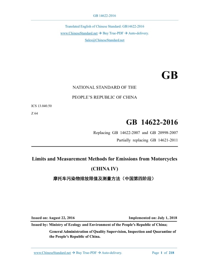 GB 14622-2016: Limits and measurement methods for the emissions of pollutants from motorcycles on the running mode (CHINA stage IV) Delivery: 9 seconds. True-PDF full-copy in English & invoice will be downloaded + auto-delivered via email. See step-by-step procedure Status: Valid GB 14622: Historical versions