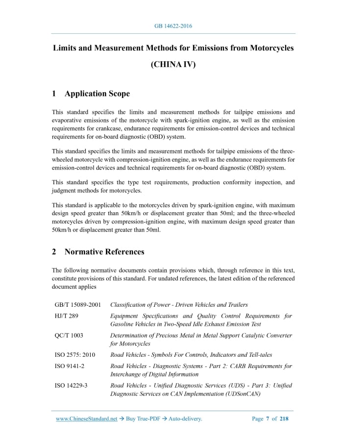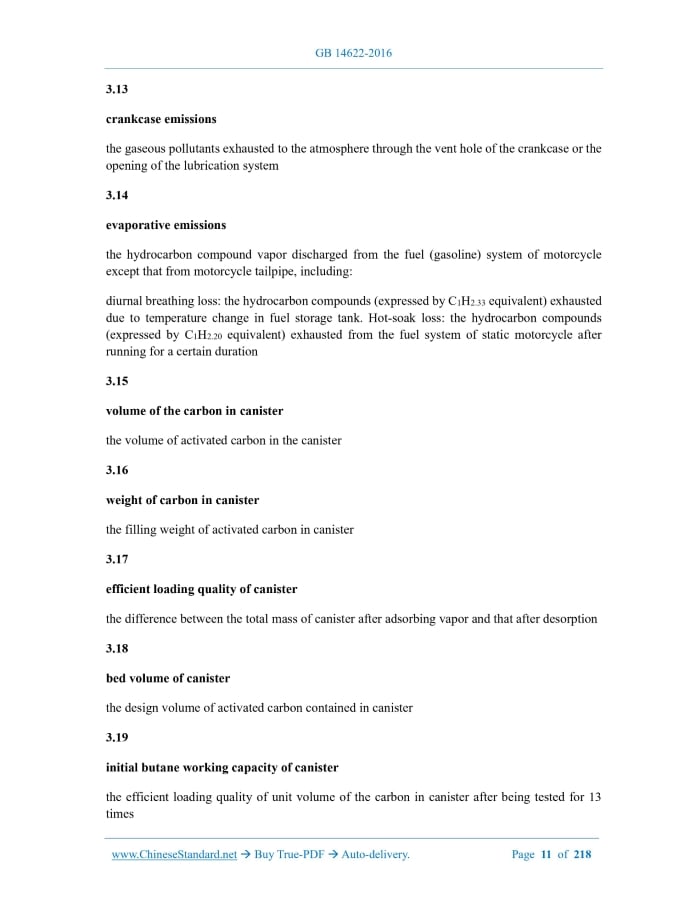 GB 14622-2016: Limits and measurement methods for the emissions of pollutants from motorcycles on the running mode (CHINA stage IV)---This is an excerpt. Full copy of true-PDF in English version (including equations, symbols, images, flow-chart, tables, and figures etc.), auto-downloaded/delivered in 9 seconds, can be purchased online: https://www.ChineseStandard.net/PDF.aspx/GB14622-2016 GB NATIONAL STANDARD OF THE PEOPLE’S REPUBLIC OF CHINA ICS 13.040.50 Z 64 Replacing GB 14622-2007 and GB 20998-2007 Partially replacing GB 14621-2011 Limits and Measurement Methods for Emissions from Motorcycles (CHINA IV) Issued on. AUGUST 22, 2016 Implemented on. JULY 1, 2018 Issued by. Ministry of Ecology and Environment of the People’s Republic of China; General Administration of Quality Supervision, Inspection and Quarantine of the People’s Republic of China. Announcement of the Ministry of Environmental Protection of the People's Republic of China 2016, No. 56 With a view to implementing Environmental Protection Law of the People's Republic of China, Law of the People's Republic of China on Prevention and Control of Water Pollution and Law of the People's Republic of China on Prevention and Control of Atmospheric Pollution, preventing and controlling pollution, protecting and improving ecological environment, safeguarding human health, five standards, including Limits and Measurement Methods for Exhaust Pollutants from Marine Engines (CHINA I, II) have been approved as national pollutant emission standards and jointly issued by the Ministry of Environmental Protection and the General Administration of Quality Supervision, Inspection and Quarantine of the People's Republic of China. The names and serial numbers of these standards are as follows. Table of ContentsForeword... 5 1 Application Scope... 7 2 Normative References... 7 3 Terms and Definitions... 8 4 Type Test and Test Information Disclosure... 13 5 General Requirements... 13 6 Type Test Requirements... 15 7 Production Conformity Inspection... 21 8 Motorcycle Type Extension... 26 9 In-service Compliance... 26 10 Standard Implementation... 26 Annex A (Normative) Relevant Information of Type Test... 27 Annex B (Normative) Type Test Result... 39 Annex C (Normative) Emission Test for Tailpipe Emissions after Cold Start at Normal Temperature (Type I test)... 42 Annex D (Normative) Test at Double Idling Speed or Test of Smoke Intensity at Free Acceleration (Type II Test)... 155 Annex E (Normative) Emission Test for Evaporative Emissions (Type IV Test)... 169 Annex F (Normative) Endurance Test of Emission-control Device (Type V Test)... 190 Annex G (Normative) On-board Diagnostic (OBD) System... 198 Annex H (Normative) Technical Requirements for Reference Fuels... 204 Annex I (Normative) Production Conformity Assurance Requirements... 210 Annex J (Normative) Type Extension Requirements... 2161 Application ScopeThis standard specifies the limits and measurement methods for tailpipe emissions and evaporative emissions of the motorcycle with spark-ignition engine, as well as the emission requirements for crankcase, endurance requirements for emission-control devices and technical requirements for on-board diagnostic (OBD) system. This standard specifies the limits and measurement methods for tailpipe emissions of the three- wheeled motorcycle with compression-ignition engine, as well as the endurance requirements for emission-control devices and technical requirements for on-board diagnostic (OBD) system. This standard specifies the type test requirements, production conformity inspection, and judgment methods for motorcycles. This standard is applicable to the motorcycles driven by spark-ignition engine, with maximum design speed greater than 50km/h or displacement greater than 50ml; and the three-wheeled motorcycles driven by compression-ignition engine, with maximum design speed greater than 50km/h or displacement greater than 50ml.2 Normative ReferencesThe following normative documents contain provisions which, through reference in this text, constitute provisions of this standard. For undated references, the latest edition of the referenced document applies GB/T 15089-2001 Classification of Power - Driven Vehicles and Trailers HJ/T 289 Equipment Specifications and Quality Control Requirements for Gasoline Vehicles in Two-Speed Idle Exhaust Emission Test QC/T 1003 Determination of Precious Metal in Metal Support Catalytic Converter for Motorcycles ISO 2575.2010 Road Vehicles - Symbols For Controls, Indicators and Tell-tales ISO 9141-2 Road Vehicles - Diagnostic Systems - Part 2.CARB Requirements for Interchange of Digital Information ISO 14229-3 Road Vehicles - Unified Diagnostic Services (UDS) - Part 3.Unified Diagnostic Services on CAN Implementation (UDSonCAN) ISO 14229-4 Road Vehicles - Unified Diagnostic Services (UDS) - Part 4.Unified Diagnostic Services on FlexRay Implementation (UDSonFR) ISO 14230-4 Road Vehicles - Diagnostic Systems - Keyword Protocol 2000 - Part 4. Requirements for Emission-related Systems ISO 15031-3 Road Vehicles - Communication between Vehicle and External Equipment for Emissions-related Diagnostics - Part 3.Diagnostic Connector and Related Electrical Circuits, Specification and Use ISO 15031-4.2014 Road Vehicles - Communication between Vehicle and External Equipment for Emissions-related Diagnostics - Part 4.External Test Equipment3 Terms and DefinitionsFor the purposes of this standard, the following terms and definitions apply. 3.1 motorcycle According to GB/T 15089-2001. Two-wheeled motorcycle (Type L3). if equipped with heat engine, its cylinder displacement shall exceed 50ml; or whichever driving mode is adopted, the maximum design speed shall exceed 50km/h. 3.2 type test the type approval test for new trial-manufactured product after completion of motorcycle type design, so as to verify whether the product meets the technical requirements of this standard 3.3 gas fuel liquefied petroleum gas (LPG) or nat