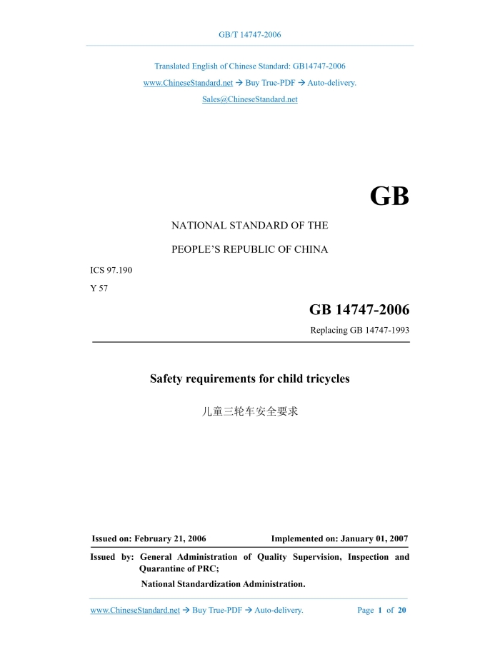 GB 14747-2006: Safety requirements for child tricycles Delivery: 9 seconds. True-PDF full-copy in English & invoice will be downloaded + auto-delivered via email. See step-by-step procedure Status: Valid GB 14747: Historical versions