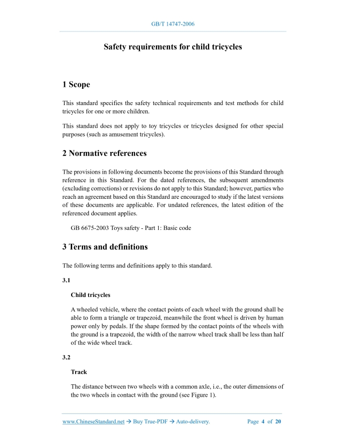 Similar standardsGB 14747-2006: Safety requirements for child tricycles---This is an excerpt. Full copy of true-PDF in English version (including equations, symbols, images, flow-chart, tables, and figures etc.), auto-downloaded/delivered in 9 seconds, can be purchased online: https://www.ChineseStandard.net/PDF.aspx/GB14747-2006GB NATIONAL STANDARD OF THE PEOPLE’S REPUBLIC OF CHINA ICS 97.190 Y 57 GB 14747-2006 Replacing GB 14747-1993 Safety requirements for child tricycles ISSUED ON: FEBRUARY 21, 2006 IMPLEMENTED ON: JANUARY 01, 2007 Issued by: General Administration of Quality Supervision, Inspection and Quarantine of PRC; National Standardization Administration. Table of ContentsForeword ... 3 1 Scope ... 4 2 Normative references ... 4 3 Terms and definitions ... 4 4 Technical requirements ... 7 4.1 Materials ... 7 4.2 Mechanical strength ... 8 4.3 Sharp edges, sharp ends, exposed protrusions, pinch points, small parts ... 8 4.4 Stability ... 9 4.5 Parts ... 10 4.6 Product signs and instructions for use ... 12 5 Test methods ... 14 5.1 General requirements ... 14 5.2 Test for specific migratable elements (see 4.1.1) ... 14 5.3 Combustion performance test (see 4.1.2) ... 14 5.4 Drop test (see 4.2, 4.5.4.2) ... 14 5.5 Sharp edge test (see 4.3.1) ... 15 5.6 Sharp end test (see 4.3.2) ... 15 5.7 Small parts test (see 4.3.5) ... 15 5.8 Driving stability test (see 4.4.1) ... 15 5.9 Forward tilting stability test (see 4.4.2.1) ... 16 5.10 Backward tilting stability test (see 4.4.2.2) ... 16 5.11 Handlebar riser strength test (see 4.5.3.2) ... 17 5.12 Handlebar riser clamp test (see 4.5.3.5) ... 18 5.13 Saddle adjustment clamping device test (see 4.5.4.2)... 18 5.14 Impact test (see 4.5.5) ... 19 5.15 Backrest structural firmness test (see 4.5.6) ... 19 5.16 Assist-push-rod strength test (see 4.5.7) ... 19 5.17 Test of pedal height above ground (see 4.5.8.2) ... 20 Safety requirements for child tricycles1 ScopeThis standard specifies the safety technical requirements and test methods for child tricycles for one or more children. This standard does not apply to toy tricycles or tricycles designed for other special purposes (such as amusement tricycles).2 Normative referencesThe provisions in following documents become the provisions of this Standard through reference in this Standard. For the dated references, the subsequent amendments (excluding corrections) or revisions do not apply to this Standard; however, parties who reach an agreement based on this Standard are encouraged to study if the latest versions of these documents are applicable. For undated references, the latest edition of the referenced document applies. GB 6675-2003 Toys safety - Part 1: Basic code3 Terms and definitionsThe following terms and definitions apply to this standard. 3.1 Child tricycles A wheeled vehicle, where the contact points of each wheel with the ground shall be able to form a triangle or trapezoid, meanwhile the front wheel is driven by human power only by pedals. If the shape formed by the contact points of the wheels with the ground is a trapezoid, the width of the narrow wheel track shall be less than half of the wide wheel track. 3.2 Track The distance between two wheels with a common axle, i.e., the outer dimensions of the two wheels in contact with the ground (see Figure 1). Analysis result correction value = 120 - 120 × 30% = 120 - 36 = 84 (mg/kg). This figure is considered to meet the requirements of this standard (the maximum limit of migratable lead in Table 1 is 90 mg/kg). 4.1.2 Combustion performance It is prohibited to use flammable materials in the parts of child tricycles. When tested according to 5.3 (combustion performance test), it shall meet the relevant requirements of Appendix B (combustion performance) of GB 6675-2003. 4.2 Mechanical strength No part of the child tricycle shall fracture or have visible cracks under normal use and foreseeable abnormal use, and after testing according to 5.4 (drop test). 4.3 Sharp edges, sharp ends, exposed protrusions, pinch points, small parts 4.3.1 Sharp edges When tested according to 5.5 (sharp edge test), there shall be no accessible dangerous sharp edges on the child tricycle. 4.3.2 Sharp ends When tested according to 5.6 (sharp end test), there shall be no accessible dangerous sharp ends on the child tricycle. 4.3.3 Exposed protrusions There shall be no exposed protrusions in the zones A and B as shown in Figure 3. When the child tricycle is tested in accordance with 5.9 (forward tilting stability test), it shall not overturn forward. 4.4.2.2 Backward tilting stability When the child tricycle is tested in accordance with 5.10 (backward tilting stability test), it shall not overturn backward. 4.5 Parts 4.5.1 Connecting fasteners All bolts, screws, nuts, etc. used for connection or fastening shall not fracture, loosen, have visible cracks or lose their proper function, when tested according to the requirements of this standard. 4.5.2 Protective cap The protective cap used to protect the exposed protrusions shall be able to withstand a tensile force of 70 N, without falling off. 4.5.3 Operating system 4.5.3.1 Riser insertion depth mark If the handlebar riser is an adjustable structure, there shall be a permanent mark or ring on the riser to clearly indicate the minimum insertion depth of the riser into the front fork assembly. The mark shall not damage the strength of the riser; the minimum insertion depth from the end of the riser shall not be less than 2.5 times the riser diameter; the stem shall maintain its proper strength within a length of at least one tube diameter below the minimum insertion depth mark. 4.5.3.2 Strength of handlebar riser The handlebar riser shall be tested according to 5.11 (test of crossbar strength) and shall not fracture. 4.5.3.3 Crossbar The crossbar shall be symmetrical at both ends with the longitudinal centerline of the child tricycle. When the crossbar is at the highest position and the saddle is at the lowest p