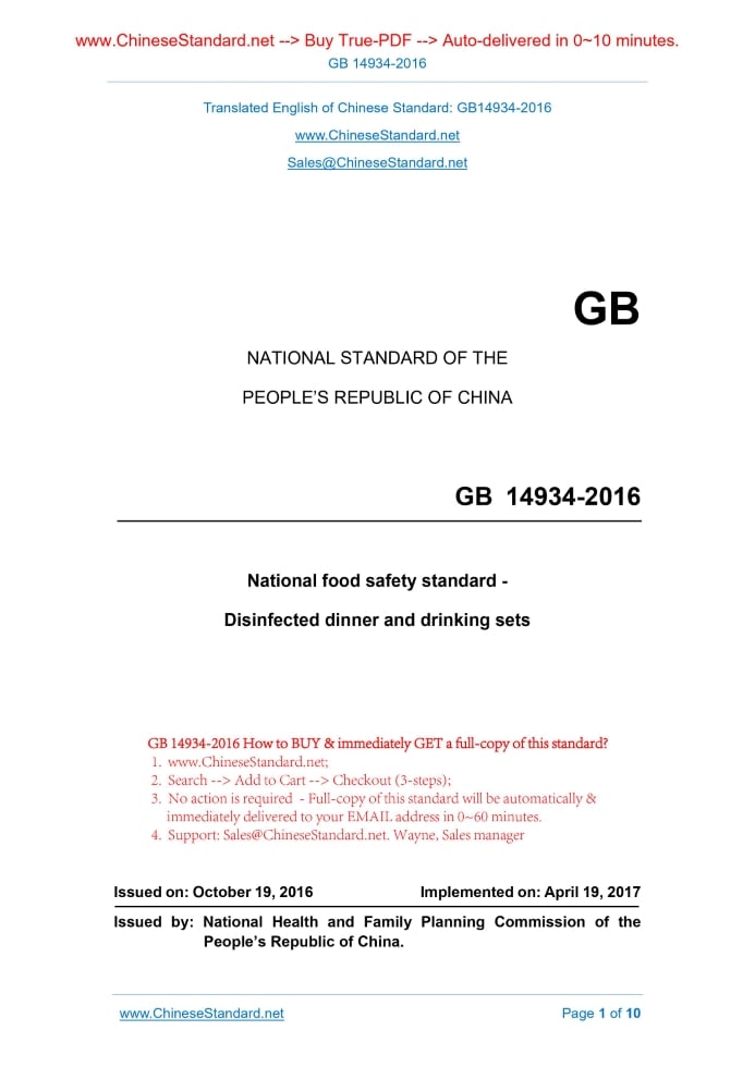 GB NATIONAL STANDARD OF THE PEOPLE’S REPUBLIC OF CHINA National food safety standard - Disinfected dinner and drinking sets Issued on. OCTOBER 19, 2016 Implemented on. APRIL 19, 2017 Issued by. National Health and Family Planning Commission of the People’s Republic of China.