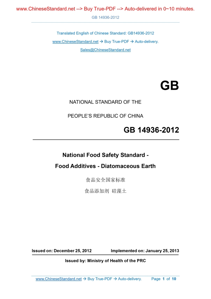 GB 14936-2012: National food safety standard - Food additives - Diatomaceous Earth Delivery: 9 seconds. True-PDF full-copy in English & invoice will be downloaded + auto-delivered via email. See step-by-step procedure Status: Valid GB 14936: Historical versions