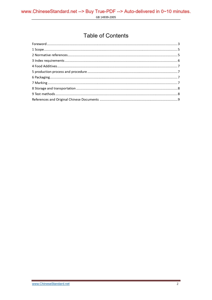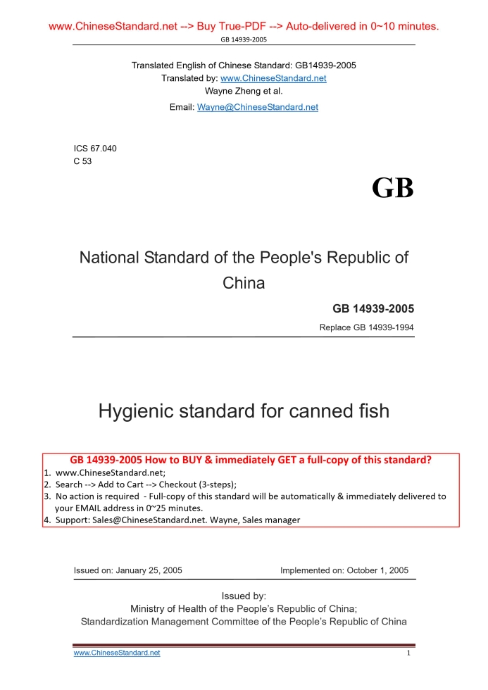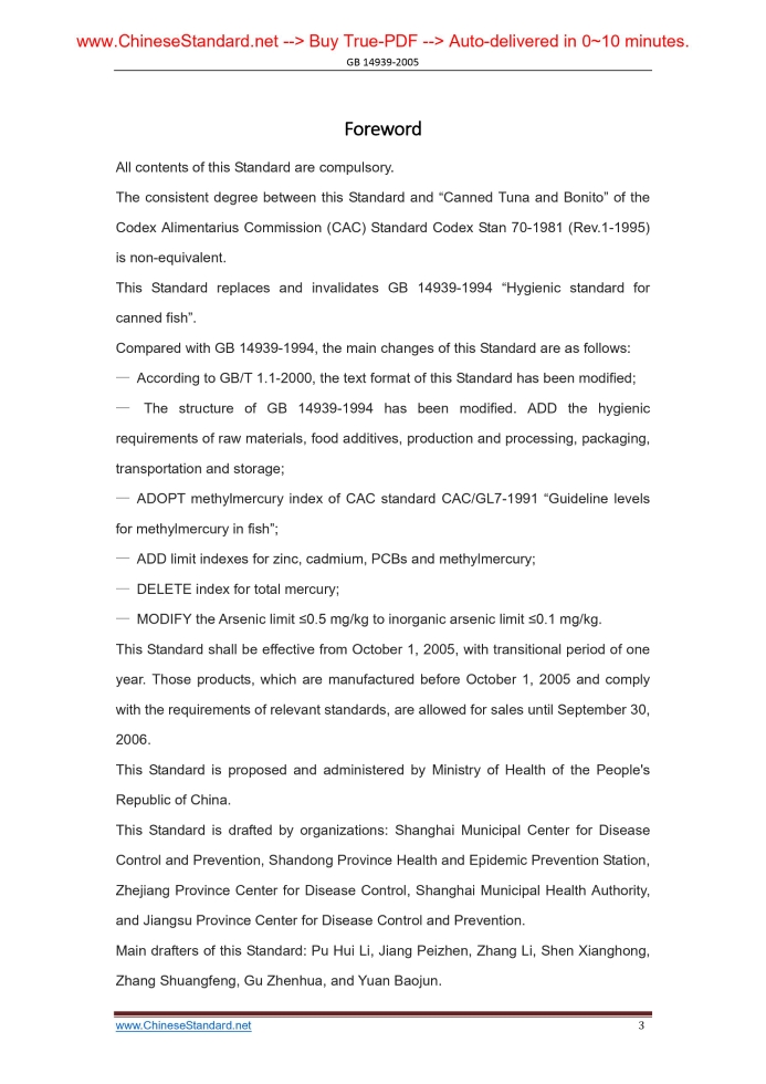 Similar standardsGB 14939-2005: Hygienic standard for canned fish [Replaced by GB 7098-2015]---This is an excerpt. Full copy of true-PDF in English version (including equations, symbols, images, flow-chart, tables, and figures etc.), auto-downloaded/delivered in 9 seconds, can be purchased online: https://www.ChineseStandard.net/PDF.aspx/GB14939-2005ICS 67.040 C 53 GB National Standard of the People's Republic of China Replace GB 14939-1994 Hygienic standard for canned fish Issued on: JANUARY 25, 2005 Implemented on: OCTOBER 1, 2005 Issued by. Ministry of Health of the People’s Republic of China; Standardization Management Committee of the People’s Republic of China Table of ContentsForeword ... 3 1 Scope ... 5 2 Normative references ... 5 3 Index requirements ... 6 4 Food Additives ... 7 5 production process and procedure ... 7 6 Packaging ... 7 7 Marking ... 7 8 Storage and transportation ... 8 9 Test methods ... 8 References and Original Chinese Documents ... 9ForewordAll contents of this Standard are compulsory. The consistent degree between this Standard and “Canned Tuna and Bonito” of the Codex Alimentarius Commission (CAC) Standard Codex Stan 70-1981 (Rev.1-1995) is non-equivalent. This Standard replaces and invalidates GB 14939-1994 “Hygienic standard for canned fish”. Compared with GB 14939-1994, the main changes of this Standard are as follows. — According to GB/T 1.1-2000, the text format of this Standard has been modified; — The structure of GB 14939-1994 has been modified. ADD the hygienic requirements of raw materials, food additives, production and processing, packaging, transportation and storage; — ADOPT methylmercury index of CAC standard CAC/GL7-1991 “Guideline levels for methylmercury in fish”; — ADD limit indexes for zinc, cadmium, PCBs and methylmercury; — DELETE index for total mercury; — MODIFY the Arsenic limit ≤0.5 mg/kg to inorganic arsenic limit ≤0.1 mg/kg. This Standard shall be effective from October 1, 2005, with transitional period of one year. Those products, which are manufactured before October 1, 2005 and comply with the requirements of relevant standards, are allowed for sales until September 30, 2006. This Standard is proposed and administered by Ministry of Health of the People's Republic of China. This Standard is drafted by organizations. Shanghai Municipal Center for Disease Control and Prevention, Shandong Province Health and Epidemic Prevention Station, Zhejiang Province Center for Disease Control, Shanghai Municipal Health Authority, and Jiangsu Province Center for Disease Control and Prevention. Main drafters of this Standard. Pu Hui Li, Jiang Peizhen, Zhang Li, Shen Xianghong, Zhang Shuangfeng, Gu Zhenhua, and Yuan Baojun. The previous edition of standard which is replaced by this Standard. GB 14939-1994. Hygienic standard for canned fish1 ScopeThis standard specifies the Canned fish’s hygienic requirements of hygienic indexes, inspection methods, food additives, production and processing, labeling, packaging, storage and transportation. This Standard is applicable to the canned fish, with certain degree of vacuum, which is manufactured from fresh (frozen) fish through procedure of treatment, sorting, trimming, processing, canning (including tin cans, glass jars, composite film bags or container with other packaging material), sealing, sterilizing and cooling.2 Normative referencesThe following normative documents contain provisions which, through reference in the text, constitute provisions of this Standard. For dated reference, subsequent amendments or revisions (excluding contents of corrigenda) do not apply. However, parties who enter into agreement based on this Standard are encouraged to investigate the possibility of applying the most recent editions of the standards indicated below. For undated references, the latest edition of the normative document referred to applies. GB 2733 Hygienic standard for fresh and frozen marine products of animal origin GB 2760 National food safety standards - food additives using a standard GB/T 4789.26 Microbiological examination of food hygiene-Examination of commercial sterilization of canned food GB/T 5009.11 Determination of T-2 toxin in cereals GB/T 5009.12 Determination of lead in foods GB/T 5009.14 Determination of zinc in foods GB/T 5009.15 Determination of cadmium in foods GB/T 5009.16 Determination of tin in foods GB/T 5009.17 Determination of total mercury and organic-mercury in foods8 Storage and transportation8.1 Storage Products shall be stored at a dry, ventilated place. It is prohibited to store together with toxic, harmful or smelly commodities. 8.2 Transportation Transportation tools shall be clean, it shall avoid intense vibration during transportation. It is prohibited to transport together with toxic, harmful or smelly commodities.9 Test methods9.1 Sensory inspection TAKE the sample size or the minimum amount which is sufficient for sensory inspection, PLACE the contents-matter in a white dish, sensory EXAMINE it under natural light. 9.2 Physical examination 9 2 1 Lead. according to the method specified in GB/T 5009.12. 9.2.2 Zinc. according to the method specified in GB/T 5009.14. 9.2.3 Cadmium. according to the method specified in GB/T 5009.15. 9.2.4 Tin. according to the method specified in GB/T 5009.16. 9.2.5 Methylmercury. according to the method specified in GB/T 5009.17. 9.2.6 Benzo(a)pyrene. according to the method specified in GB/T 5009.27. 9.2.7 Histamine. according to the method specified in GB/T 5009.45. 9.2.8 Inorganic arsenic. according to the method specified in GB/T 5009.11. 9.2.9 PCBs. according to the method specified in GB/T 5009.190. 9.3 Microbiological examination TEST according to the method specified in GB/T 4789.26. References and Original Chinese Documents [1] GB 14939-2005 Hygienic standard for canned fish. [2] GB 2733-2005 Hygienic standard for fresh and frozen marine products of animal origin. [3] GB 2760 National food s