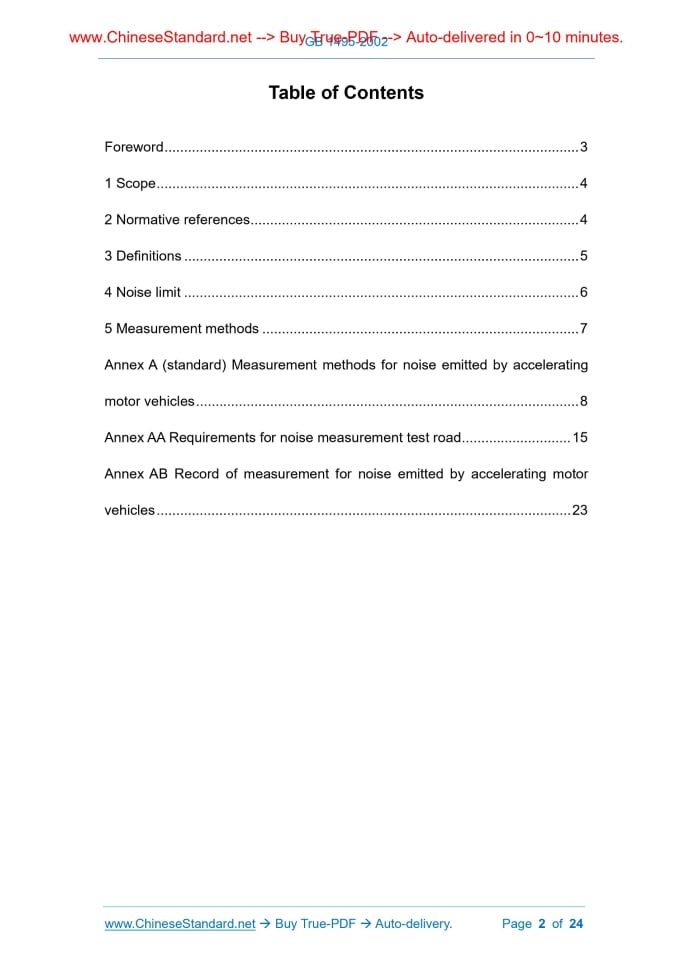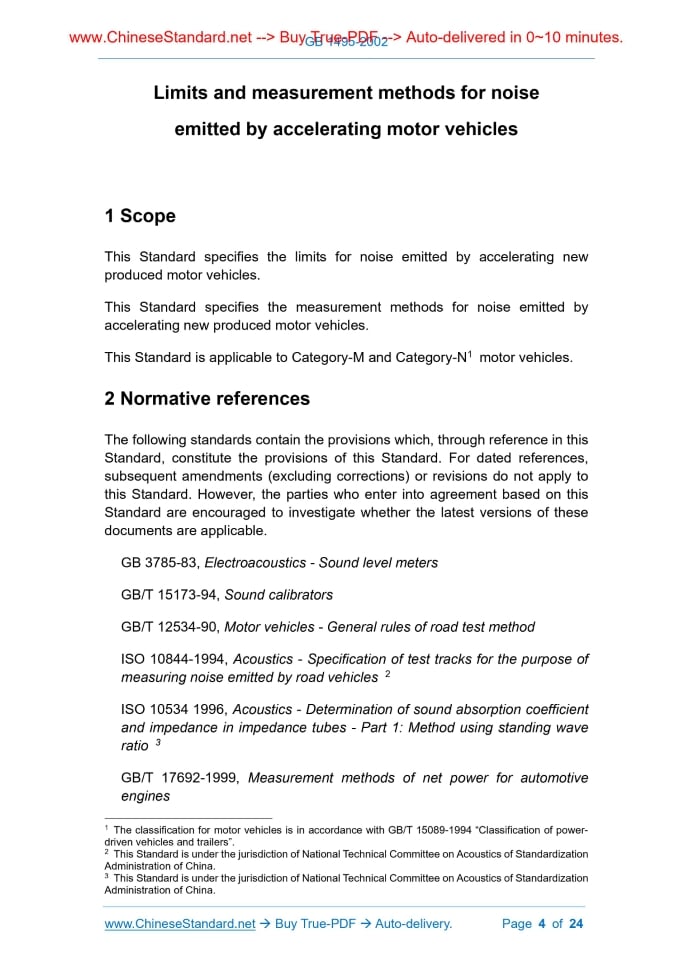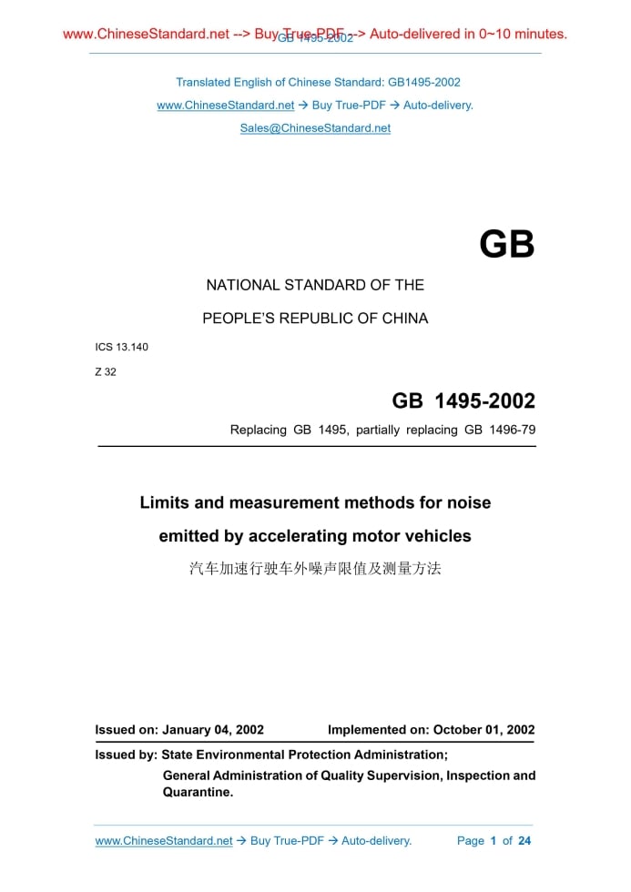 Similar standardsGB 1495-2002: Limits and measurement methods for noise emitted by accelerating motor vehicles---This is an excerpt. Full copy of true-PDF in English version (including equations, symbols, images, flow-chart, tables, and figures etc.), auto-downloaded/delivered in 9 seconds, can be purchased online: https://www.ChineseStandard.net/PDF.aspx/GB1495-2002GB NATIONAL STANDARD OF THE PEOPLE’S REPUBLIC OF CHINA ICS 13.140 Z 32 Replacing GB 1495, partially replacing GB 1496-79 Limits and measurement methods for noise emitted by accelerating motor vehicles Issued on. JANUARY 04, 2002 Implemented on. OCTOBER 01, 2002 Issued by. State Environmental Protection Administration; General Administration of Quality Supervision, Inspection and Quarantine. Table of ContentsForeword... 3 1 Scope... 4 2 Normative references... 4 3 Definitions... 5 4 Noise limit... 6 5 Measurement methods... 7 Annex A (standard) Measurement methods for noise emitted by accelerating motor vehicles... 8 Annex AA Requirements for noise measurement test road... 15 Annex AB Record of measurement for noise emitted by accelerating motor vehicles... 23ForewordThis Standard was formulated in accordance with Law of the People's Republic of China on Prevention and Control of Pollution from Environmental Noise. This Standard referred to United Nations Economic Commission for Europe Regulation ECE Reg. No. 51 “Uniform provisions concerning the approval of motor vehicles having at least four wheels with regard to their noise emissions” and was based on the actual situation of China's automotive products. The noise limit of this Standard replaces the car noise limit in GB 1495-79. On the noise measurement methods, in technical contents, this Standard referred to Annex 3 of United Nations Economic Commission for Europe Regulation ECE Reg. No. 51/02 (1997) “Uniform provisions concerning the approval of motor vehicles having at least four wheels with regard to their noise emissions” and corresponding content in the International standard ISO 362.1998 “Acoustics -- Measurement of noise emitted by accelerating road vehicles -- Engineering method”. The requirements for test road in this Standard equivalently adopted ISO 10844.1994 “Acoustics -- Specification of test tracks for the purpose of measuring noise emitted by road vehicles”. It shall be implemented since January 1, 2005. This Standard shall be implemented in two time periods according to the auto exit-factory dat. This Standard was proposed by State Environmental Protection Administration, Science and Technology Standard Department. The drafting organizations of this Standard. Beijing Labor Protection Science Research Institute, China Automotive Technology and Research Center. This Standard was approved by State Environmental Protection Administration on November 22, 2001. This Standard shall be interpreted by State Environmental Protection Administration. Limits and measurement methods for noise emitted by accelerating motor vehicles1 ScopeThis Standard specifies the limits for noise emitted by accelerating new produced motor vehicles. This Standard specifies the measurement methods for noise emitted by accelerating new produced motor vehicles. This Standard is applicable to Category-M and Category-N1 motor vehicles.2 Normative referencesThe following standards contain the provisions which, through reference in this Standard, constitute the provisions of this Standard. For dated references, subsequent amendments (excluding corrections) or revisions do not apply to this Standard. However, the parties who enter into agreement based on this Standard are encouraged to investigate whether the latest versions of these documents are applicable. GB 3785-83, Electroacoustics - Sound level meters GB/T 15173-94, Sound calibrators GB/T 12534-90, Motor vehicles - General rules of road test method ISO 10844-1994, Acoustics - Specification of test tracks for the purpose of measuring noise emitted by road vehicles 2 ISO 10534 1996, Acoustics - Determination of sound absorption coefficient and impedance in impedance tubes - Part 1.Method using standing wave ratio 3 GB/T 17692-1999, Measurement methods of net power for automotive engines3 DefinitionsFor the purposes of this document, the following definitions apply. 3.1 Motor vehicle’s category In terms of noise outside the motor vehicle, a category of motor vehicle refers to a category of motor vehicles that have no difference in the following main aspects. 3.1.1 Body shape or structural material (especially the engine compartment and its sound insulation material). 3.1.4 Drive train, gear number and its speed ratio. 3.1.5 Noise reduction system or components as defined in 3.2 and 3.3 below. 3.2 Noise reduction system Noise reduction system refers to the complete set of components necessary to limit the motor vehicle and its exhaust noise. When the noise reduction component’s designations or trademarks in the system are different, or the size and shape of the components, material properties, assembly, working principle are different, or the number of intake/exhaust mufflers is different, the system shall be regarded as different types of noise reduction systems. 3.3 Noise reduction system components The noise reduction system component refers to one of the individual components that constitute the noise reduction system, such as the exhaust pipe, the expansion chamber, the muffler, etc. It is considered a component of the noise reduction system when the presence of the air filter is essential to ensure that the specified noise limits are met.4 Noise limitWhen the vehicle accelerates, the maximum noise level outside the vehicle shall not exceed the limits specified in Table 1.5 Measurement methodsThe measurements for noise emitted by accelerating motor vehicles shall be performed according to Annex A.Annex A(Normative) Measurement methods for noise emitted by accelerating motor vehicles A.1 Measuring instruments A.1.1