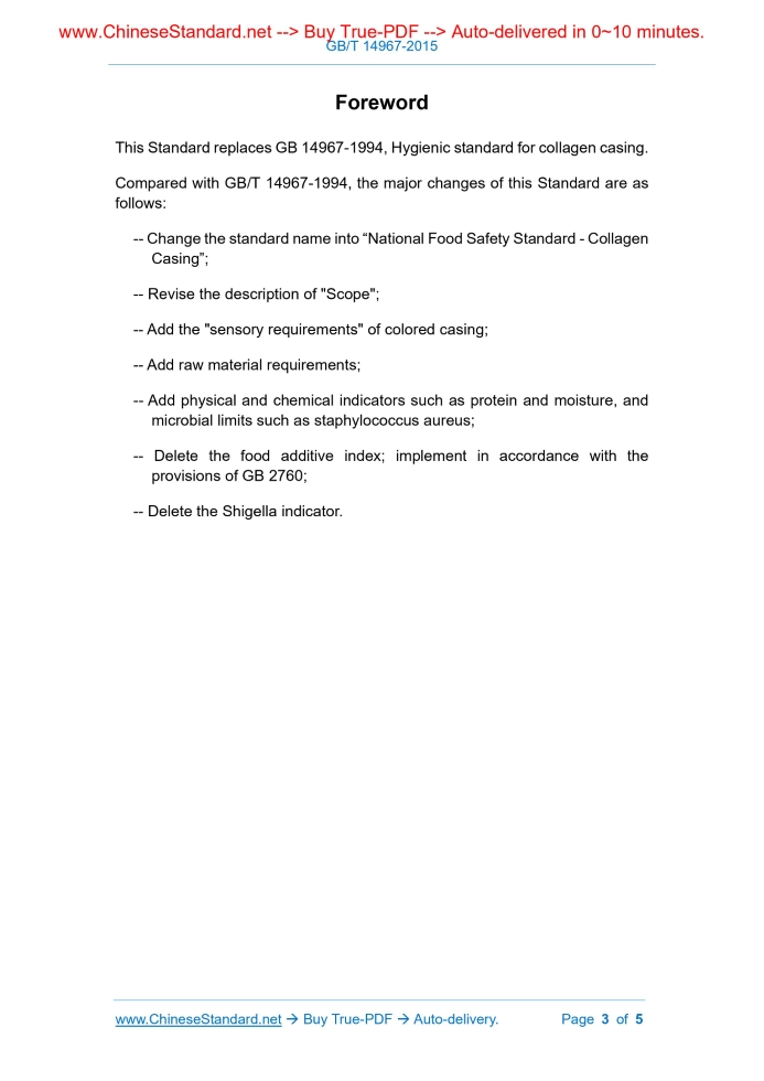 Similar standardsGB 14967-2015: National Food Safety Standard -- Collagen casings---This is an excerpt. Full copy of true-PDF in English version (including equations, symbols, images, flow-chart, tables, and figures etc.), auto-downloaded/delivered in 9 seconds, can be purchased online: https://www.ChineseStandard.net/PDF.aspx/GB14967-2015NATIONAL STANDARD OF THE PEOPLE’S REPUBLIC OF CHINA National Food Safety Standard - Collagen Casing ISSUED ON: SEPTEMBER 22, 2015 IMPLEMENTED ON: SEPTEMBER 22, 2016 Issued by: National Health and Family Planning Commission of the People’s Republic of China Table of ContentsForeword ... 3 1 Scope ... 4 2 Technical requirements ... 4ForewordThis Standard replaces GB 14967-1994, Hygienic standard for collagen casing. Compared with GB/T 14967-1994, the major changes of this Standard are as follows: -- Change the standard name into “National Food Safety Standard - Collagen Casing”; -- Revise the description of "Scope"; -- Add the "sensory requirements" of colored casing; -- Add raw material requirements; -- Add physical and chemical indicators such as protein and moisture, and microbial limits such as staphylococcus aureus; -- Delete the food additive index; implement in accordance with the provisions of GB 2760; -- Delete the Shigella indicator. National Food Safety Standard - Collagen Casing1 ScopeThis Standard is applicable to edible artificial casing for making Chinese and western sausages. It uses the collagen fiber of pig and cowhide dermis as raw materials; it is added with auxiliary materials and made into collagen “bump” through chemical and mechanical processing; it is then made by processes such as extrusion, inflation, drying, heating and shaping.2 Technical requirements2.1 Raw material requirements The dermis layer of fresh skin of pig and cattle after depilation treatment that passes the quarantine inspection. It is forbidden to use the leather from the tannery. 2.2 Sensory requirements 2.2.1 Shape It is seamlessly tubular with no holes and no adhesion. 2.2.2 Color The primary-color casing is grayish white to light brown, without other colored patches, or mildew spots; the colored casing shall have the corresponding color of the coloring agent and no other colored patches. 2.2.3 Smell It has the characteristic smell of collagen and no odor. 2.3 Physical-chemical indicators Physical-chemical indicators shall be in accordance with Table 1. ......Source: Above contents are excerpted from the full-copy PDF -- translated/reviewed by: www.ChineseStandard.net / Wayne Zheng et al. Tips & Frequently Asked Questions:Question 1: How long will the true-PDF of English version of GB 14967-2015 be delivered?Answer: The full copy PDF of English version of GB 14967-2015 can be downloaded in 9 seconds, and it will also be emailed to you in 9 seconds (double mechanisms to ensure the delivery reliably), with PDF-invoice.Question 2: Can I share the purchased PDF of GB 14967-2015_English with my colleagues?Answer: Yes. The purchased PDF of GB 14967-2015_English will be deemed to be sold to your employer/organization who actually paid for it, including your colleagues and your employer's intranet.Question 3: Does the price include tax/VAT?Answer: Yes. Our tax invoice, downloaded/delivered in 9 seconds, includes all tax/VAT and complies with 100+ countries' tax regulations (tax exempted in 100+ countries) -- See Avoidance of Double Taxation Agreements (DTAs): List of DTAs signed between Singapore and 100+ countriesQuestion 4: Do you accept my currency other than USD?Answer: Yes. www.ChineseStandard.us -- GB 14967-2015 -- Click this link and select your country/currency to pay, the exact amount in your currency will be printed on the invoice. Full PDF will also be downloaded/emailed in 9 seconds.Question 5: Should I purchase the latest version GB 14967-2015?Answer: Yes. Unless special scenarios such as technical constraints or academic study, you should always prioritize to purchase the latest version GB 14967-2015 even if the enforcement date is in future. Complying with the latest version means that, by default, it also complies with all the earlier versions, technically.How to buy and download a true PDF of English version of GB 14967-2015?A step-by-step guide to download PDF of GB 14967-2015_EnglishStep 1: Visit website https://www.ChineseStandard.net (Pay in USD), or https://www.ChineseStandard.us (Pay in any currencies such as Euro, KRW, JPY, AUD).Step 2: Search keyword "GB 14967-2015". Step 3: Click "Add to Cart". If multiple PDFs are required, repeat steps 2 and 3 to add up to 12 PDFs to cart. Step 4: Select payment option (Via payment agents Stripe or PayPal). Step 5: Customize Tax Invoice -- Fill up your email etc. Step 6: Click "Checkout". Step 7: Make payment by credit card, PayPal, Google Pay etc. After the payment is completed and in 9 seconds, you will receive 2 emails attached with the purchased PDFs and PDF-invoice, respectively. Step 8: Optional -- Go to download PDF. Step 9: Optional -- Click Open/Download PDF to download PDFs and invoice. See screenshots for above steps: Steps 1~3 Steps 4~6 Step 7 Step 8 Step 9 |