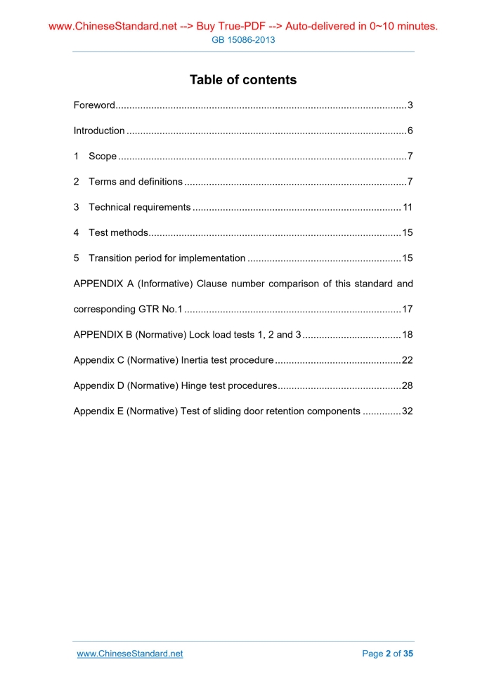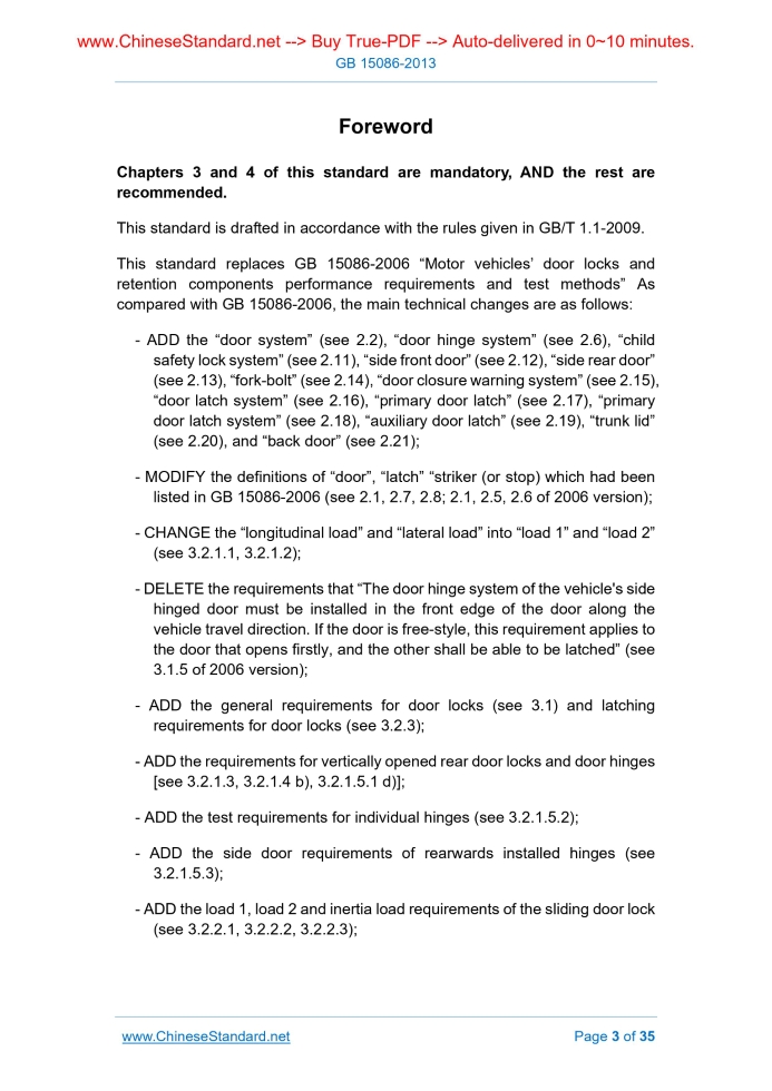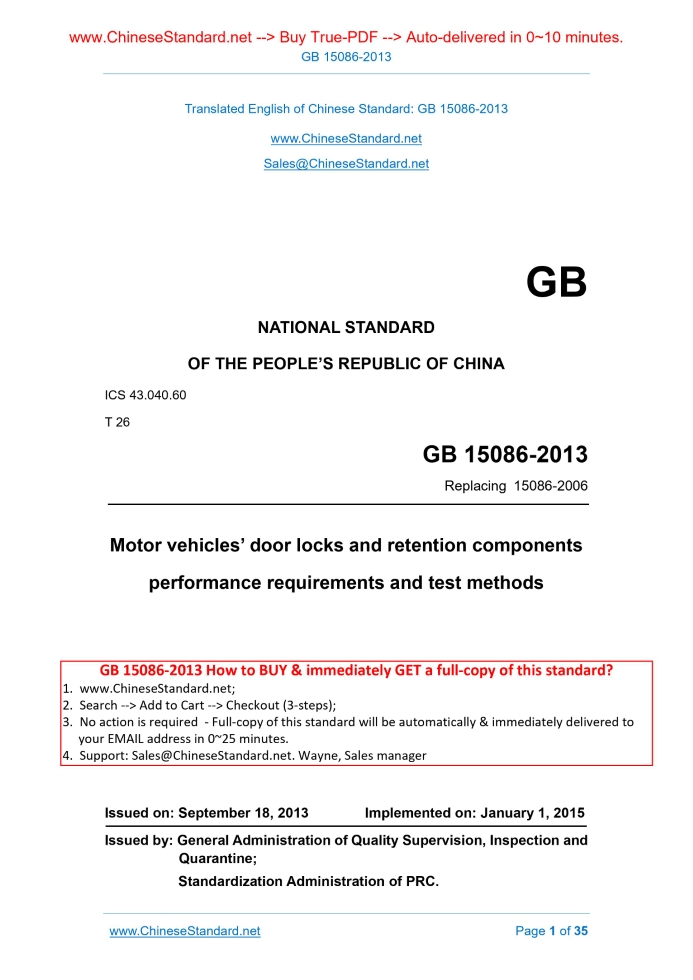 GB 15086-2013: Motor vehicle door locks and retention components performance requirements and test methods---This is an excerpt. Full copy of true-PDF in English version (including equations, symbols, images, flow-chart, tables, and figures etc.), auto-downloaded/delivered in 9 seconds, can be purchased online: https://www.ChineseStandard.net/PDF.aspx/GB15086-2013 GB NATIONAL STANDARD ICS 43.040.60 T 26 Replacing 15086-2006 Motor vehicles’ door locks and retention components performance requirements and test methods Issued on. SEPTEMBER 18, 2013 Implemented on. JANUARY 1, 2015 Issued by. General Administration of Quality Supervision, Inspection and Quarantine; Standardization Administration of PRC. Table of ContentsForeword... 3 Introduction... 6 1 Scope... 7 2 Terms and definitions... 7 3 Technical requirements... 11 4 Test methods... 15 5 Transition period for implementation... 15 APPENDIX A (Informative) Clause number comparison of this standard and corresponding GTR No.1... 17 APPENDIX B (Normative) Lock load tests 1, 2 and 3... 18 Appendix C (Normative) Inertia test procedure... 22 Appendix D (Normative) Hinge test procedures... 28 Appendix E (Normative) Test of sliding door retention components... 321 ScopeThis standard specifies the terms and definitions, technical requirements and test methods for vehicle door locks and door retention components, including latches, hinges and other supports. This standard applies to the door lock and door retention components of the side door (including sliding doors) or back door for the category M1 and N1 vehicles for passenger access.2 Terms and definitionsThe following terms and definitions apply to this document. 2.1 Doors It refers to the hinged door and sliding door used at the vehicle side or back which can be opened and closed for entry and exit of the occupant. It does not include folding doors, roll-up doors and simple doors easy to be installed and removed. 2.2 Door system It includes door, latch, striker (or stop), door hinge, and guide rail and sliding door assembly, as well as the other retention components which are located on the door or around the door frame. The double door system includes two doors. 2.3 Door lock It refers to the mechanism used to lock the door, which includes latch, striker (or stop), internal and external control mechanism, and internal and external latching mechanism. 2.8 Striker (or stop) It refers to the parts engaging with the latch in order to make the door at the secondary latched position or fully latched position 2.9 Fully latched position It refers to the engagement position of the latch and striker (or stop) when the door is fully closed. 2.10 Secondary latched position It refers to the engagement position of the latch and striker (or stop) when the door is not fully closed.3 Technical requirements3.1 General requirements 3.1.1 Each articulated door system shall be fitted with at least one primary door latch system. 3.2 Performance requirements 3.2.1 Articulated door lock and door hinge 3.2.1.1 Load 1 When the latch and strike (or stop) assembly of each primary latch system is at secondary latched position, if applying 4500 N load perpendicular to the latch surface, it shall not be disengaged; when the latch and strike (or stop) assembly of each primary door latch system and auxiliary door latch system are at the fully latched position, if applying 11000 N load along the same direction, it shall not be disengaged. 3.2.1.3 Load 3 (only for rear door locks opened vertically) As for the rear door lock opened vertically, at least one primary door latch system shall, in addition to complying with the requirements of 3.2.1.1 and 3.2.1.2, not be disengaged from the fully latched position if applying 9000 N load along the direction orthogonal to the direction of application of load 1 and load 2. 3.2.1.4 Inertial loads Each primary door latch system and auxiliary door latch system shall comply with the dynamic requirements of a) and/or b) of the following inertial load requirements, OR comply with the calculation requirements of c). Inertial load requirements. 3.2.1.5 Door hinges 3.2.1.5.1 Each door hinge system shall be capable of withstanding the performance requirements of the following door hinge systems. a) Supports the door; 3.2.1.5.2 If the entire door hinge system is not tested and only a single hinge in a door hinge system is tested, the hinge shall be loaded in proportion to the total number of hinges in the door hinge system. 3.2.1.5.3 As for the side door with a rear-mounted hinge and which can be operated independently of other doors, it shall comply with all of the following rear-mounted hinge rear side door requirements. 3.2.2 Sliding door locks and retention components 3.2.2.1 Load 1 When at least one door latch system is at the fully latched position, if applying 11000 N load perpendicular to the latch surface of the latch and strike (or stop) assembly of the door latch system, it shall not be disengaged; when the latch and strike (or stop) assembly of the primary door latch system is at the secondary latched position, if applying 4500 N load along the same direction, it shall not be disengaged. 3.2.2.3 Inertial loads The sliding door latch shall, in addition to complying with the requirements of 3.2.2.1 and 3.2.2.2, also comply with the dynamic requirements of a) or the calculation requirements of b) in the following inertial load requirements. Inertial load requirements. 3.2.2.4 Sliding door retention components 3.2.2.4.1 As for the sliding door guide rail and sliding door assembly or other supporting method, when it is at the fully latched and closed position, respectively APPLY 9000N outwards transverse force onto the opposite sides of the door (18000 N in total), the sliding door guide rail and sliding door assembly or other supporting components shall not be disengaged from the door frame. 3.2.2.4.2 When performing the test of 3.2.2.4.1, if any one of the following conditions occurs