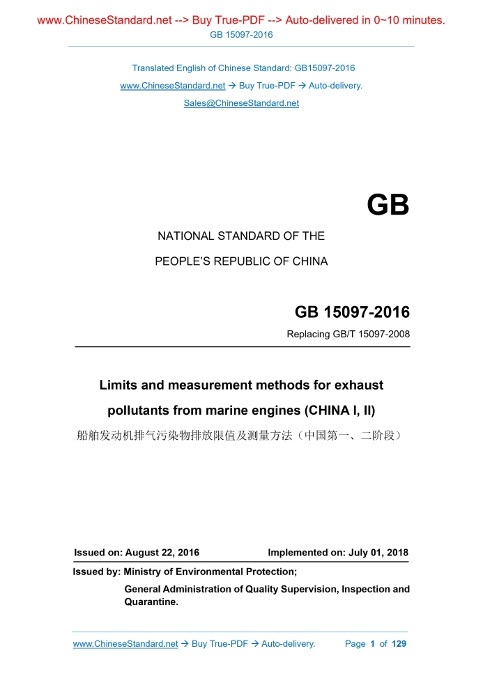 GB 15097-2016: Limits and measurement methods for exhaust pollutants from marine engines (CHINA I, II) Delivery: 9 seconds. True-PDF full-copy in English & invoice will be downloaded + auto-delivered via email. See step-by-step procedure Status: Valid GB 15097: Historical versions