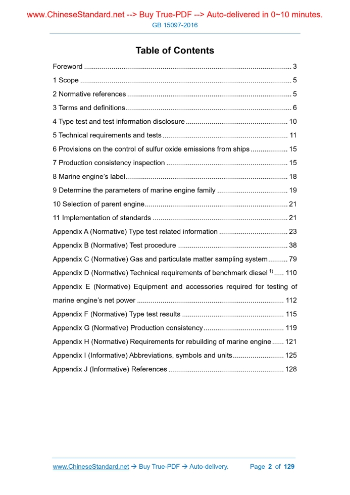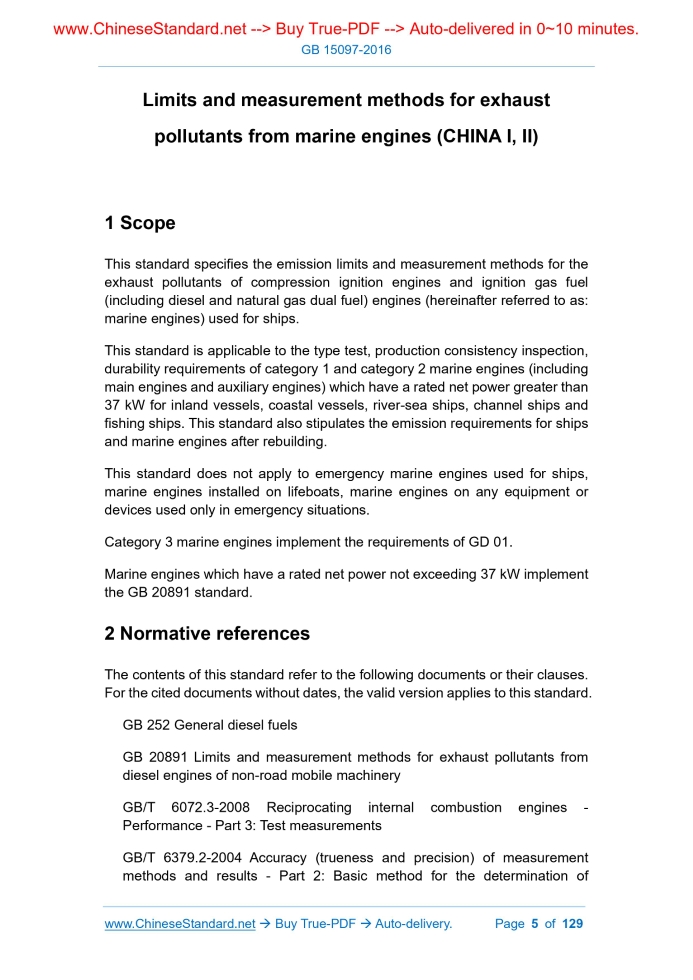 GB 15097-2016: Limits and measurement methods for exhaust pollutants from marine engines (CHINA I, II)---This is an excerpt. Full copy of true-PDF in English version (including equations, symbols, images, flow-chart, tables, and figures etc.), auto-downloaded/delivered in 9 seconds, can be purchased online: https://www.ChineseStandard.net/PDF.aspx/GB15097-2016 NATIONAL STANDARD OF THE PEOPLE’S REPUBLIC OF CHINA Replacing GB/T 15097-2008 Limits and measurement methods for exhaust pollutants from marine engines (CHINA I, II) Issued on. AUGUST 22, 2016 Implemented on. JULY 01, 2018 Issued by. Ministry of Environmental Protection; General Administration of Quality Supervision, Inspection and Quarantine. Table of ContentsForeword... 3 1 Scope... 5 2 Normative references... 5 3 Terms and definitions... 6 4 Type test and test information disclosure... 10 5 Technical requirements and tests... 11 6 Provisions on the control of sulfur oxide emissions from ships... 15 7 Production consistency inspection... 15 8 Marine engine’s label... 18 9 Determine the parameters of marine engine family... 19 10 Selection of parent engine... 21 11 Implementation of standards... 21 Appendix A (Normative) Type test related information... 23 Appendix B (Normative) Test procedure... 38 Appendix C (Normative) Gas and particulate matter sampling system... 79 Appendix D (Normative) Technical requirements of benchmark diesel 1)... 110 Appendix E (Normative) Equipment and accessories required for testing of marine engine’s net power... 112 Appendix F (Normative) Type test results... 115 Appendix G (Normative) Production consistency... 119 Appendix H (Normative) Requirements for rebuilding of marine engine... 121 Appendix I (Informative) Abbreviations, symbols and units... 125 Appendix J (Informative) References... 1281 ScopeThis standard specifies the emission limits and measurement methods for the exhaust pollutants of compression ignition engines and ignition gas fuel (including diesel and natural gas dual fuel) engines (hereinafter referred to as. marine engines) used for ships. This standard is applicable to the type test, production consistency inspection, durability requirements of category 1 and category 2 marine engines (including main engines and auxiliary engines) which have a rated net power greater than 37 kW for inland vessels, coastal vessels, river-sea ships, channel ships and fishing ships. This standard also stipulates the emission requirements for ships and marine engines after rebuilding. This standard does not apply to emergency marine engines used for ships, marine engines installed on lifeboats, marine engines on any equipment or devices used only in emergency situations. Category 3 marine engines implement the requirements of GD 01. Marine engines which have a rated net power not exceeding 37 kW implement the GB 20891 standard.2 Normative referencesThe contents of this standard refer to the following documents or their clauses. For the cited documents without dates, the valid version applies to this standard. GB 252 General diesel fuels GB 20891 Limits and measurement methods for exhaust pollutants from diesel engines of non-road mobile machinery GB/T 6072.3-2008 Reciprocating internal combustion engines - Performance - Part 3.Test measurements GB/T 6379.2-2004 Accuracy (trueness and precision) of measurement methods and results - Part 2.Basic method for the determination of repeatability and reproducibility of a standard measurement method GB/T 21404-2008 Internal combustion engine - Determination and method for the measurement of engine power - General requirements GD 01 Guide for testing and inspection of NOx emission from marine diesel engine3 Terms and definitionsThe following terms and definitions apply to this standard. 3.1 Inland vessel Vessels sailing on rivers and lakes. 3.2 Coaster vessel Vessels sailing between coastal ports. 3.3 River-sea ship Ship sailing in coastal waters and river channels. 3.4 Channel ship A ship sailing in the waters across the channels or between islands. 3.5 Fishing ship Refers to ships engaged in fishing production and ships belonging to the aquaculture system serving fishing production, including. fishing ships, breeding vessels, aquatic transportation and sales vessels, refrigerated processing vessels, fishing oil vessels, fishing supply vessels, fishing guidance vessels, fisheries scientific research survey vessels, fisheries teaching practice ship, fishing port engineering ship, fishing tug, fishing transportation ship, fishing barge, fishing administration ship, fishing supervision ship, etc. 3.6 Category 1 marine engine Marine engines which have a rated net power greater than or equal to 37 kW and a single cylinder displacement of less than 5 L.4 Type test and test information disclosure4.1 Type of marine engine within the scope of application of this standard shall be subject to type test in accordance with the requirements of this standard. 4.2 Information disclosure requirements 4.3 Prototype and fuel for type test 4.3.1 A marine engine that conforms to the characteristics of the "marine engine type" (or "parent engine") described in Appendix A shall be submitted to the testing agency responsible for type test, to complete the test content specified in this standard. 4.3.2 The fuel requirements for type test are as follows. 4.4 Exemption for type test For marine engines with special purposes such as export, exhibition, rescue, emergency, matching test, etc., it may submit an application to the competent department to be exempted from type test. The information submitted to the competent authority shall include model, power, manufacturer, use, emission standard stage reached, quantity and production date.5 Technical requirements and tests5.1 General The manufacturer shall take technical measures to ensure that the marine engine's emission control system operates normally under the normal working conditions and within the specified service life; the
