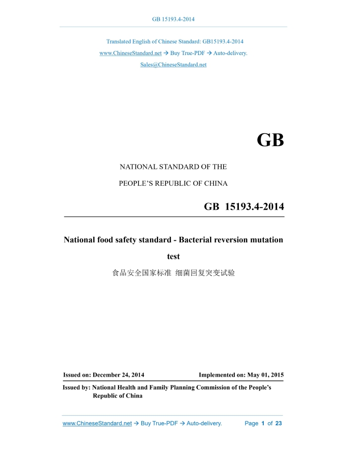 GB 15193.4-2014: National food safety standard - Bacterial reversion mutation test Delivery: 9 seconds. True-PDF full-copy in English & invoice will be downloaded + auto-delivered via email. See step-by-step procedure Status: Valid GB 15193.4: Historical versions