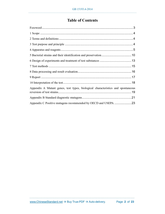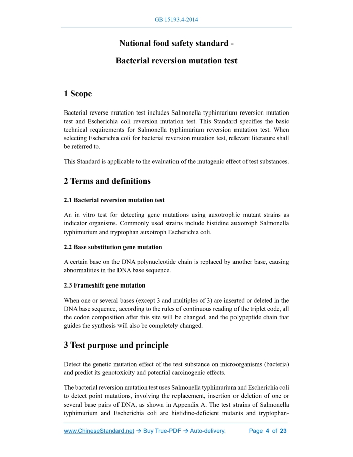 Similar standardsGB 15193.4-2014: National food safety standard - Bacterial reversion mutation test---This is an excerpt. Full copy of true-PDF in English version (including equations, symbols, images, flow-chart, tables, and figures etc.), auto-downloaded/delivered in 9 seconds, can be purchased online: https://www.ChineseStandard.net/PDF.aspx/GB15193.4-2014GB NATIONAL STANDARD OF THE PEOPLE’S REPUBLIC OF CHINA National food safety standard - Bacterial reversion mutation test ISSUED ON: DECEMBER 24, 2014 IMPLEMENTED ON: MAY 01, 2015 Issued by: National Health and Family Planning Commission of the People’s Republic of China Table of ContentsForeword ... 3 1 Scope ... 4 2 Terms and definitions ... 4 3 Test purpose and principle ... 4 4 Apparatus and reagents ... 5 5 Bacterial strains and their identification and preservation ... 10 6 Design of experiments and treatment of test substances ... 13 7 Test methods ... 15 8 Data processing and result evaluation ... 16 9 Report ... 17 10 Interpretation of the test ... 18 Appendix A Mutant genes, test types, biological characteristics and spontaneous reversion of test strains ... 19 Appendix B Standard diagnostic mutagens ... 21 Appendix C Positive mutagens recommended by OECD and USEPA ... 23 National food safety standard - Bacterial reversion mutation test1 ScopeBacterial reverse mutation test includes Salmonella typhimurium reversion mutation test and Escherichia coli reversion mutation test. This Standard specifies the basic technical requirements for Salmonella typhimurium reversion mutation test. When selecting Escherichia coli for bacterial reversion mutation test, relevant literature shall be referred to. This Standard is applicable to the evaluation of the mutagenic effect of test substances.2 Terms and definitions2.1 Bacterial reversion mutation test An in vitro test for detecting gene mutations using auxotrophic mutant strains as indicator organisms. Commonly used strains include histidine auxotroph Salmonella typhimurium and tryptophan auxotroph Escherichia coli. 2.2 Base substitution gene mutation A certain base on the DNA polynucleotide chain is replaced by another base, causing abnormalities in the DNA base sequence. 2.3 Frameshift gene mutation When one or several bases (except 3 and multiples of 3) are inserted or deleted in the DNA base sequence, according to the rules of continuous reading of the triplet code, all the codon composition after this site will be changed, and the polypeptide chain that guides the synthesis will also be completely changed.3 Test purpose and principleDetect the genetic mutation effect of the test substance on microorganisms (bacteria) and predict its genotoxicity and potential carcinogenic effects. The bacterial reversion mutation test uses Salmonella typhimurium and Escherichia coli to detect point mutations, involving the replacement, insertion or deletion of one or several base pairs of DNA, as shown in Appendix A. The test strains of Salmonella typhimurium and Escherichia coli are histidine-deficient mutants and tryptophan- 80 ℃, prepare plates at a rate of 25 mL per plate (relative to a 90 mm plate). After condensation and solidification, place the plates upside down in a 37 ℃ incubator for 24 h for use. 4.2.3.2 Phosphate stock solution (Vogel-Bonner minimal medium E, 50 times) Sodium ammonium hydrogen phosphate (NaNH4HPO4·4H2O) 17.5 g Citric acid (C6H8O7·H2O) 10.0 g Dipotassium hydrogen phosphate (K2HPO4) 50.0 g Magnesium sulfate (MgSO4·7H2O) 1.0 g Add distilled water to 100 mL to dissolve, and sterilize at 0.103 MPa for 20 minutes. Note: After the other reagents are completely dissolved, slowly put the magnesium sulfate into it to continue dissolving, otherwise it will easily precipitate. 4.2.3.3 40% glucose solution Add distilled water to 40.0 g of glucose to 100 mL, and sterilize at 0.055 MPa for 20 minutes. 4.2.3.4 1.5% agar medium Add 6.0 g of agar powder into a 400 mL conical flask; add distilled water to 400 mL; after melting, sterilize at 0.103 MPa for 20 min. 4.2.4 Top culture medium Heat to melt the top agar, add 10 mL of histidine-biotin solution (0.5 mmol/L) to every 100 mL of top agar. Mix well; divide into 4 flasks; sterilize at 0.103 MPa for 20 min. Melt and divide into small test tubes, 2 mL per tube; keep warm in a 45 ℃ water bath. Prepare top agar and histidine-biotin solution (0.5 mmol/L) as follows. 4.2.4.1 Top agar Add distilled water to 3.0 g of agar powder and 2.5 g of sodium chloride to 500 mL; sterilize at 0.103 MPa for 20 min. 4.2.4.2 Histidine-biotin solution (0.5 mmol/L) (for mutagenesis test) Add 250 mL of distilled water to 30.5 mg of D-biotin (relative molecular mass 244) and 19.4 mg of L-histidine (relative molecular mass 155); sterilize at 0.103 MPa for 20 min. 4.2.5 Special reagents and culture media 4.2.5.1 0.8% ampicillin solution (for strain identification, prepared aseptically) Use sodium hydroxide solution (0.02 mol/L) to dilute 40 mg of ampicillin to 5 mL; store it in a refrigerator at 4 °C for later use. 4.2.5.2 0.1% crystal violet solution (for strain identification) Dissolve 100 mg of crystal violet in sterile water to 100 mL. 4.2.5.3 L-histidine solution and D-biotin solution (0.5 mmol/L) (for strain identification) Respectively dissolve 0.404 3 g of L-histidine and 12.2 mg of D-biotin in distilled water to 100 mL; sterilize at 0.103 MPa for 20 min; store in a 4 °C refrigerator for later use. 4.2.5.4 0.8% tetracycline solution (for tetracycline resistance test and ampicillin- tetracycline plate) Use hydrochloric acid buffer (0.02 mol/L) to dilute 40 mg of tetracycline to 5 mL; store in a 4 °C refrigerator. 4.2.5.5 Ampicillin plate (used as the master plate for TA97, TA98, and TA100 strains) and ampicillin-tetracycline plate (used as the master plate for TA102 strain) Each 1 000 mL consists of the following ingredients: Bottom culture medium 980 mL Histidine aqueous solution (0.404 3 g/100 mL) 10 mL Biotin (0.5 mmol/L) 6 mL 0.8% ampicil