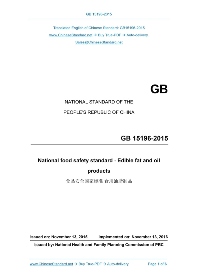 GB 15196-2015: National Food Safety Standard -- Edible Fat and Oil Products Delivery: 9 seconds. True-PDF full-copy in English & invoice will be downloaded + auto-delivered via email. See step-by-step procedure Status: Valid GB 15196: Historical versions