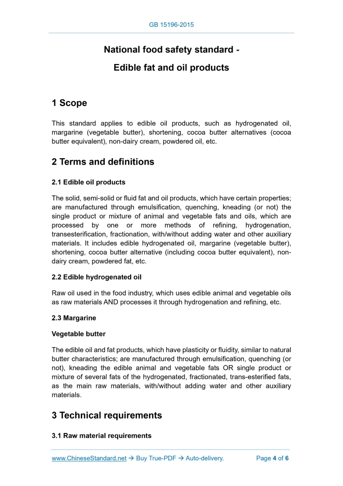 Similar standardsGB 15196-2015: National Food Safety Standard -- Edible Fat and Oil Products---This is an excerpt. Full copy of true-PDF in English version (including equations, symbols, images, flow-chart, tables, and figures etc.), auto-downloaded/delivered in 9 seconds, can be purchased online: https://www.ChineseStandard.net/PDF.aspx/GB15196-2015GB NATIONAL STANDARD OF THE PEOPLE’S REPUBLIC OF CHINA National food safety standard - Edible fat and oil products Issued on. NOVEMBER 13, 2015 Implemented on. NOVEMBER 13, 2016 Issued by. National Health and Family Planning Commission of PRC Table of ContentsForeword... 3 1 Scope... 4 2 Terms and definitions... 4 3 Technical requirements... 4 4 Others... 6ForewordThis standard replaces GB 17402-2003 "Hygienic standard for edible hydrogenated oil" and GB 15196-2003 "Hygienic standard for margarine". Compared with GB 17402-2003 and GB 15196-2003, the main changes of this standard are as follows. - CHANGE the standard name into "National food safety standard - Edible fat and oil products"; - MODIFY the scope; - MODIFY the terms and definitions; - MODIFY the sensory requirements; - MODIFY the physical and chemical indicators; - ADD the requirements for the use of nutrition fortifiers; - ADD the requirements on the marking of trans fatty acids. National food safety standard - Edible fat and oil products1 ScopeThis standard applies to edible oil products, such as hydrogenated oil, margarine (vegetable butter), shortening, cocoa butter alternatives (cocoa butter equivalent), non-dairy cream, powdered oil, etc.2 Terms and definitions2.1 Edible oil products The solid, semi-solid or fluid fat and oil products, which have certain properties; are manufactured through emulsification, quenching, kneading (or not) the single product or mixture of animal and vegetable fats and oils, which are processed by one or more methods of refining, hydrogenation, 2.2 Edible hydrogenated oil Raw oil used in the food industry, which uses edible animal and vegetable oils as raw materials AND processes it through hydrogenation and refining, etc. 2.3 Margarine Vegetable butter The edible oil and fat products, which have plasticity or fluidity, similar to natural butter characteristics; are manufactured through emulsification, quenching (or not),3 Technical requirements3.1 Raw material requirements 3.2 Sensory requirements Sensory requirements shall meet the requirements of Table 1. 3.3 Physical and chemical indicators The physical and chemical indicators shall meet the requirements of Table 2. 3.6 Food additives and food nutrition fortifiers 3.6.1 The use of food additives shall comply with the provisions of GBv2760.4 OthersFor the edible fat and oil products, which are processed by the hydrogenation process, they be marked with the content of trans fatty acids. ......Source: Above contents are excerpted from the full-copy PDF -- translated/reviewed by: www.ChineseStandard.net / Wayne Zheng et al. Tips & Frequently Asked Questions:Question 1: How long will the true-PDF of English version of GB 15196-2015 be delivered?Answer: The full copy PDF of English version of GB 15196-2015 can be downloaded in 9 seconds, and it will also be emailed to you in 9 seconds (double mechanisms to ensure the delivery reliably), with PDF-invoice.Question 2: Can I share the purchased PDF of GB 15196-2015_English with my colleagues?Answer: Yes. The purchased PDF of GB 15196-2015_English will be deemed to be sold to your employer/organization who actually paid for it, including your colleagues and your employer's intranet.Question 3: Does the price include tax/VAT?Answer: Yes. Our tax invoice, downloaded/delivered in 9 seconds, includes all tax/VAT and complies with 100+ countries' tax regulations (tax exempted in 100+ countries) -- See Avoidance of Double Taxation Agreements (DTAs): List of DTAs signed between Singapore and 100+ countriesQuestion 4: Do you accept my currency other than USD?Answer: Yes. www.ChineseStandard.us -- GB 15196-2015 -- Click this link and select your country/currency to pay, the exact amount in your currency will be printed on the invoice. Full PDF will also be downloaded/emailed in 9 seconds.Question 5: Should I purchase the latest version GB 15196-2015?Answer: Yes. Unless special scenarios such as technical constraints or academic study, you should always prioritize to purchase the latest version GB 15196-2015 even if the enforcement date is in future. Complying with the latest version means that, by default, it also complies with all the earlier versions, technically.How to buy and download a true PDF of English version of GB 15196-2015?A step-by-step guide to download PDF of GB 15196-2015_EnglishStep 1: Visit website https://www.ChineseStandard.net (Pay in USD), or https://www.ChineseStandard.us (Pay in any currencies such as Euro, KRW, JPY, AUD).Step 2: Search keyword "GB 15196-2015". Step 3: Click "Add to Cart". If multiple PDFs are required, repeat steps 2 and 3 to add up to 12 PDFs to cart. Step 4: Select payment option (Via payment agents Stripe or PayPal). Step 5: Customize Tax Invoice -- Fill up your email etc. Step 6: Click "Checkout". Step 7: Make payment by credit card, PayPal, Google Pay etc. After the payment is completed and in 9 seconds, you will receive 2 emails attached with the purchased PDFs and PDF-invoice, respectively. Step 8: Optional -- Go to download PDF. Step 9: Optional -- Click Open/Download PDF to download PDFs and invoice. See screenshots for above steps: Steps 1~3 Steps 4~6 Step 7 Step 8 Step 9 |