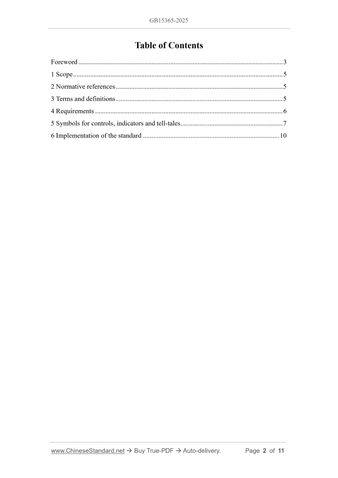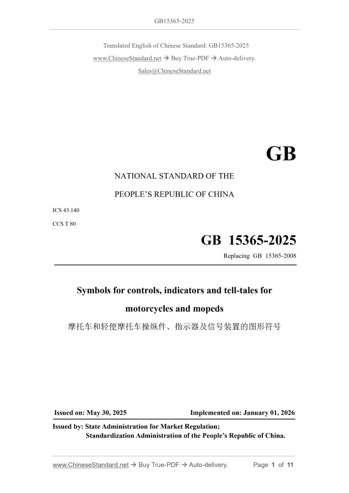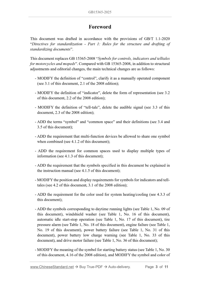 Similar standardsGB 15365-2025: Symbols for controls, indicators and tell-tales for motorcycles and mopeds---This is an excerpt. Full copy of true-PDF in English version (including equations, symbols, images, flow-chart, tables, and figures etc.), auto-downloaded/delivered in 9 seconds, can be purchased online: https://www.ChineseStandard.net/PDF.aspx/GB15365-2025GB NATIONAL STANDARD OF THE PEOPLE’S REPUBLIC OF CHINA ICS 43.140 CCS T 80 Replacing GB 15365-2008 Symbols for controls, indicators and tell-tales for motorcycles and mopeds Issued on: MAY 30, 2025 Implemented on: JANUARY 01, 2026 Issued by. State Administration for Market Regulation; Standardization Administration of the People’s Republic of China. Table of ContentsForeword... 3 1 Scope... 5 2 Normative references... 5 3 Terms and definitions... 5 4 Requirements... 6 5 Symbols for controls, indicators and tell-tales... 7 6 Implementation of the standard... 10ForewordThis document was drafted in accordance with the provisions of GB/T 1.1-2020 “Directives for standardization - Part 1.Rules for the structure and drafting of standardizing documents”. This document replaces GB 15365-2008 “Symbols for controls, indicators and telltales for motorcycles and mopeds”. Compared with GB 15365-2008, in addition to structural adjustments and editorial changes, the main technical changes are as follows. - MODIFY the definition of “control”, clarify it as a manually operated component (see 3.1 of this document, 2.1 of the 2008 edition); - MODIFY the definition of “indicator”, delete the form of representation (see 3.2 of this document, 2.2 of the 2008 edition); - MODIFY the definition of “tell-tale”, delete the audible signal (see 3.3 of this document, 2.3 of the 2008 edition); - ADD the terms “symbol” and “common space” and their definitions (see 3.4 and 3.5 of this document); - ADD the requirement that multi-function devices be allowed to share one symbol when combined (see 4.1.2 of this document); - ADD the requirement for common spaces used to display multiple types of information (see 4.1.3 of this document); - ADD the requirement that the symbols specified in this document be explained in the instruction manual (see 4.1.5 of this document); - MODIFY the position and display requirements for symbols for indicators and tell- tales (see 4.2 of this document, 3.1 of the 2008 edition); - ADD the requirement for the color used for system heating/cooling (see 4.3.3 of this document); - ADD the symbols corresponding to daytime running lights (see Table 1, No. 09 of this document), windshield washer (see Table 1, No. 16 of this document), automatic idle start-stop operation (see Table 1, No. 17 of this document), tire pressure alarm (see Table 1, No. 18 of this document), engine failure (see Table 1, No. 19 of this document), power battery failure (see Table 1, No. 31 of this document), power battery low charge warning (see Table 1, No. 33 of this document), and drive motor failure (see Table 1, No. 36 of this document); - MODIFY the meaning of the symbol for starting battery status (see Table 1, No. 30 of this document, 4.16 of the 2008 edition), and MODIFY the symbol and color of Symbols for controls, indicators and tell-tales for motorcycles and mopeds1 ScopeThis document specifies the general requirements, position requirements and color requirements for symbols for controls, indicators and tell-tales for motorcycles and mopeds. This document applies to indicators and tell-tales on the instrument panel, and controls located near the driver mounted on motorcycles and mopeds (hereinafter referred to as “motorcycles”).2 Normative referencesThis document has no normative references.3 Terms and definitionsFor the purpose of this document, the following terms and definitions apply. 3.1 control A component manually operated by the driver to change the operating status or function of a device on a motorcycle. 3.2 indicator A device that displays the function or operating status of a motorcycle or its components. NOTE. This may include scale values, digital displays, etc. 3.3 tell-tale A light signal that, when illuminated, indicates the activation of a device on a motorcycle, or the normal or inoperative function of a motorcycle or its components, or a functional malfunction. 3.4 symbol A visual graphic used to identify controls, indicators and tell-tales. 3.5 common space An area where two or more corresponding symbols for indicators or tell-tales or other information may be displayed asynchronously.4 Requirements4.1 General requirements 4.1.1 Symbols for controls and tell-tales shall have a clear contrast with the background color to ensure visibility. The coating (plating) shall be permanently durable and shall not be easily removed by fingers. 4.1.2 When controls, indicators or tell-tales with the same function are combined, they may share one symbol. 4.1.3 Common spaces used to display multiple information shall meet the following requirements. a) When two or more tell-tales are activated, the information shall be automatically repeated in sequence, or the driver may select which information to view; b) Tell-tales indicating anti-lock braking system failure, high beam or turn signal lights shall not be displayed in a same common space; c) If any of the tell-tales indicating anti-lock braking system failure, high beam or turn signal lights are displayed in a common space, their activation sequence shall take precedence over any other information; d) Once activated, the anti-lock braking system failure, high beam, turn signal lights, and other red tell-tales listed in Table 1 shall not be automatically deactivated; e) Unless otherwise specified in a specific (other) standard, there are no color requirements for tell-tales when they appear in a common space. 4.1.4 If a motorcycle is equipped with controls, indicators and tell-tales other than those listed in Clause 5, the corresponding symbols may not be displaye