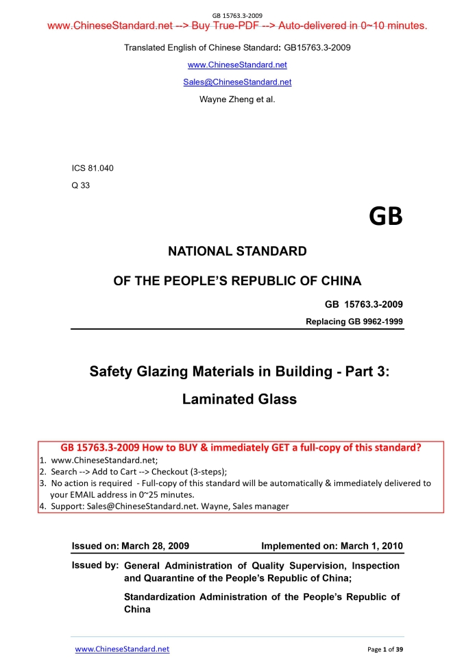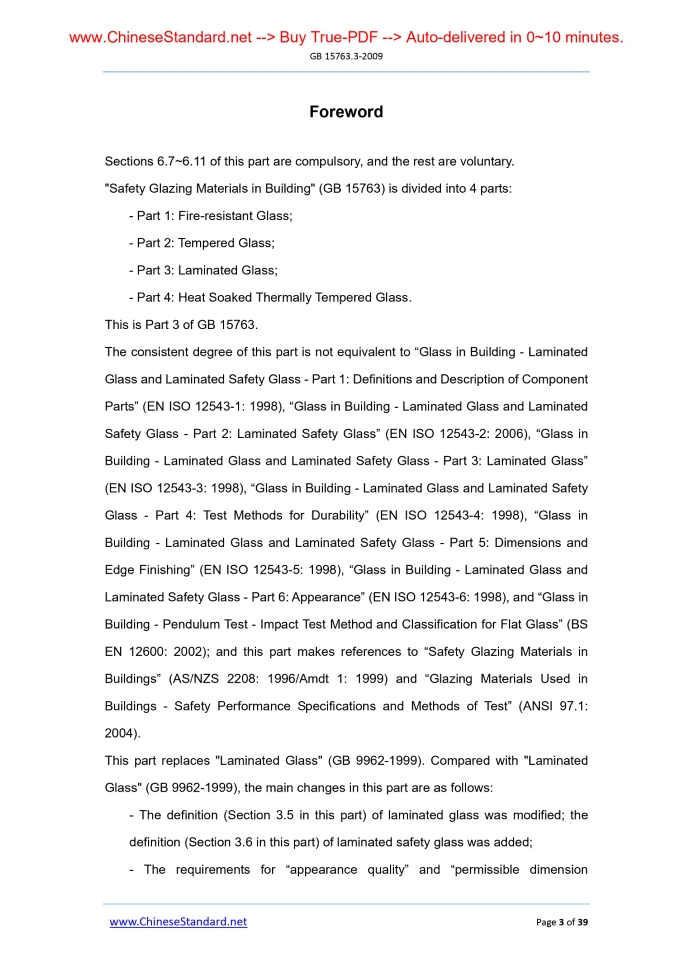 GB 15763.3-2009: Safety glazing materials in building -- Part 3: Laminated glass Delivery: 9 seconds. True-PDF full-copy in English & invoice will be downloaded + auto-delivered via email. See step-by-step procedure Status: Valid