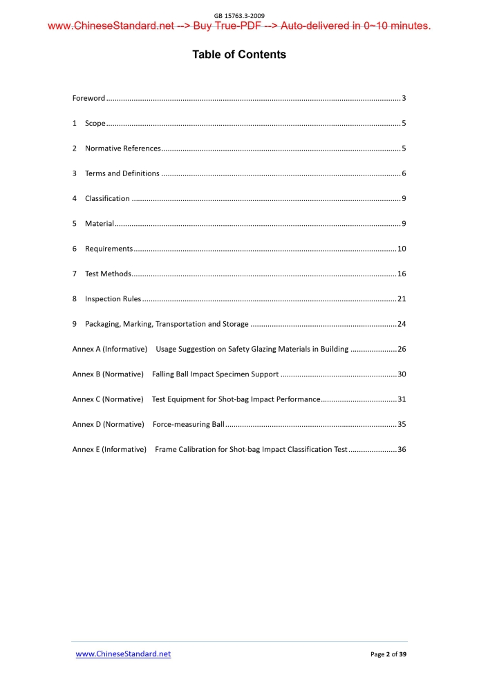 Similar standardsGB 15763.3-2009: Safety glazing materials in building -- Part 3: Laminated glass---This is an excerpt. Full copy of true-PDF in English version (including equations, symbols, images, flow-chart, tables, and figures etc.), auto-downloaded/delivered in 9 seconds, can be purchased online: https://www.ChineseStandard.net/PDF.aspx/GB15763.3-2009ICS 81.040 Q 33 GB NATIONAL STANDARD Replacing GB 9962-1999 Safety Glazing Materials in Building - Part 3. Laminated Glass Issued on: MARCH 28, 2009 Implemented on. MARCH 1, 2010 Issued by. General Administration of Quality Supervision, Inspection and Quarantine of the People’s Republic of China; Standardization Administration of the People’s Republic of China Table of ContentsForeword... 3 1 Scope... 5 2 Normative References... 5 3 Terms and Definitions... 6 4 Classification... 9 5 Material... 9 6 Requirements... 10 7 Test Methods... 16 8 Inspection Rules... 21 9 Packaging, Marking, Transportation and Storage... 24 Annex A (Informative) Usage Suggestion on Safety Glazing Materials in Building... 26 Annex B (Normative) Falling Ball Impact Specimen Support... 30 Annex C (Normative) Test Equipment for Shot‐bag Impact Performance... 31 Annex D (Normative) Force‐measuring Ball... 35 Annex E (Informative) Frame Calibration for Shot‐bag Impact Classification Test... 361 ScopeThis part specifies the terms and definitions, classification, material, requirements, test methods and inspection rules of laminated glass in building. This part is applicable to the laminated glass in building.2 Normative ReferencesThe articles contained in the following documents have become part of this standard when they are quoted herein. For the dated documents so quoted, all the modifications (excluding corrections) or revisions made thereafter shall not be applicable to this Standard. For the undated documents so quoted, the latest editions shall be applicable to this Standard. GB/T 308 Rolling Bearings - Steel Balls GB/T 531 Rubber, Vulcanized - Determination of Shore A Hardness GB/T 1216 External Micrometer GB/T 5137.2-2002 Test Methods of Safety Glazing Materials Used on Road Vehicles – Part 2.Optical Properties Tests GB/T 5137.3-2002 Test Methods of Safety Glazing Materials Used on Road Vehicles - Part3.Radiation, High Temperature, Humidity, Fire and Simulated Weathering Resistance Tests GB/T 9056 Metal Ruler GB 15763.2-2005 Safety Glazing Materials in Building - Part 2.Tempered Glass3 Terms and DefinitionsFor the purpose of this standard, the following terms and definitions apply. 3.1 Interlayer The material with separation and adhesive effects used between glass and/or plastic of two layers, which makes the laminated glass be provided with performance such as impact resistance, solar control and sound insulation. 3.2 Ionoplast interlayer The interlayer material that may be firmly bonded to the glass with a small amount of metal salts, and ethylene-methacrylic acid copolymer as the main material. 3.3 PVB interlayer The interlayer material with polyvinyl butyral as the main material. 3.4 EVA interlayer The interlayer material with ethylene-polyvinyl acetate copolymer as the main material. 3.5 Laminated glass The general name of composite material with glass-glass and/or glass-plastic structures separated by interlayer and bonded together through treatment. The glass member with glass-glass structure separated by the interlayer and bonded together through treatment is common and mostly used.4 Classification4.1 Classification by shape. 4.2 Classification by shot-bag impact performance.5 MaterialThe laminated glass consists of the combination of glass, plastic and interlayer materials. The materials adopted shall meet the requirements of relevant national standards, professional standards, technical conditions or order documents. 5.1 Glass Float glass, ordinary flat glass, patterned glass, polished wired glass, wired patterned glass, etc. may be selected. 5.2 Plastic Polycarbonate, polyurethane and polyacrylate may be selected. The plastic may be colorless, colored or coated; transparent or translucent. 5.3 Interlayer Materials with different types, components, mechanical and optical performance may be selected, such as ionoplast interlayer, PVB interlayer and EVA interlayer.6 RequirementsThe judgment of performance requirements and test methods for the laminated glass shall be in accordance with the relevant requirements specified in Table 1. 6.1.1.2 Linear defects in visible area Quantity of linear defects in visible area shall meet the requirements of Table 3. 6.1.2 Defects in edge area For the edge area of laminated glass with frames, the spot defects with diameter less than or equal to 5mm are permissible; if the spot defects are bubbles, the total area of bubbles shall not be greater than 5% of edge area. 6.1.3 Vents The defect is not permissible. 6.1.4 Chip The length or width shall not exceed the thickness of glass. 6.1.5 Delamination The defect is not permissible. 6.1.6 Creases and streaks due to interlayer inhomogeneity The defect is not permissible. 6.2 Permissible deviation in dimension 6.2.1 Permissible deviation in length and width The permissible deviation in length and width of final laminated glass shall meet the requirements of Table 4. 6.3 Degree of curvature Degree of curvature of the plane laminated glass is inspected in accordance with Section 7.5; for the arch plane, it shall not exceed 0.3%; for the wave plane, it shall not exceed 0.2%.Where the non-mineral glass is used as sheet material, the degree of curvature is jointly determined by the Supplier and the Demander. 6.4 Visible light transmittance Visible light transmittance of the laminated glass is inspected according to Section 7.5 and jointly determined by the Supplier and the Demander. 6.5 Visible light reflectance Visible light reflectance of the laminated glass is tested according to Section 7.6 and jointly determined by the Supplier and the Demander. 6.6 Wind load r