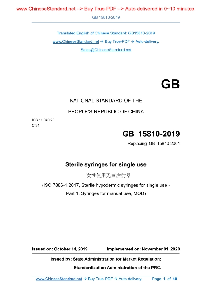GB 15810-2019: Sterile syringes for single use Delivery: 9 seconds. True-PDF full-copy in English & invoice will be downloaded + auto-delivered via email. See step-by-step procedure Status: Valid GB 15810: Historical versions