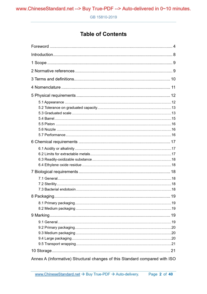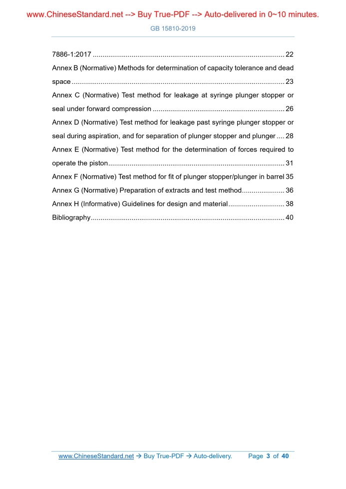 Similar standardsGB 15810-2019: Sterile syringes for single use---This is an excerpt. Full copy of true-PDF in English version (including equations, symbols, images, flow-chart, tables, and figures etc.), auto-downloaded/delivered in 9 seconds, can be purchased online: https://www.ChineseStandard.net/PDF.aspx/GB15810-2019NATIONAL STANDARD OF THE PEOPLE’S REPUBLIC OF CHINA ICS 11.040.20 C 31 Replacing GB 15810-2001 Sterile syringes for single use (ISO 7886-1.2017, Sterile hypodermic syringes for single use - Part 1.Syringes for manual use, MOD) Issued on. OCTOBER 14, 2019 Implemented on. NOVEMBER 01, 2020 Issued by. State Administration for Market Regulation; Standardization Administration of the PRC. Table of ContentsForeword... 4 Introduction... 8 1 Scope... 9 2 Normative references... 9 3 Terms and definitions... 10 4 Nomenclature... 11 5 Physical requirements... 12 5.1 Appearance... 12 5.2 Tolerance on graduated capacity... 13 5.3 Graduated scale... 13 5.4 Barrel... 15 5.5 Piston... 16 5.6 Nozzle... 16 5.7 Performance... 16 6 Chemical requirements... 17 6.1 Acidity or alkalinity... 17 6.2 Limits for extractable metals... 17 6.3 Readily-oxidizable substance... 18 6.4 Ethylene oxide residue... 18 7 Biological requirements... 18 7.1 General... 18 7.2 Sterility... 18 7.3 Bacterial endotoxin... 18 8 Packaging... 19 8.1 Primary packaging... 19 8.2 Medium packaging... 19 9 Marking... 19 9.1 General... 19 9.2 Primary packaging... 20 9.3 Medium packaging... 20 9.4 Large packaging... 20 9.5 Transport wrapping... 21 10 Storage... 21 Annex A (Informative) Structural changes of this Standard compared with ISO 7886-1.2017... 22 Annex B (Normative) Methods for determination of capacity tolerance and dead space... 23 Annex C (Normative) Test method for leakage at syringe plunger stopper or seal under forward compression... 26 Annex D (Normative) Test method for leakage past syringe plunger stopper or seal during aspiration, and for separation of plunger stopper and plunger... 28 Annex E (Normative) Test method for the determination of forces required to operate the piston... 31 Annex F (Normative) Test method for fit of plunger stopper/plunger in barrel 35 Annex G (Normative) Preparation of extracts and test method... 36 Annex H (Informative) Guidelines for design and material... 38 Bibliography... 40ForewordThe full technical content of this Standard is mandatory. This Standard is drafted in accordance with the rules given in GB/T 1.1-2009. This Standard replaces GB 15810-2001 “Sterile hypodermic syringes for single use”. Compared with GB 15810-2001, the main technical changes of this Standard are as follows. - Modify the “Scope” (see Clause 1; Clause 1 of the 2001 edition); - ADD the definitions of “two-piece syringe”, “three-piece syringe”, “dead space”, “piston”, “barrel flanges”, “needle cap or shield”, and “plunger” (see 3.6, 3.7, 3.11, 3.12, 3.13, and 3.14); - Modify Figure 1 and its name (see Figure 1; Figure 1 of the 2001 edition); - Modify the requirement for lubricant (see 5.1.4; 5.1.4 of the 2001 edition); - Modify the requirement for “Push-button spacing” (see 5.5.1; 5.5.1 of the 2001 edition); - Delete “Rubber plunger stoppers shall be free of rubber thread, rubber scraps, foreign impurities, and frost and shall comply with the provisions of YY/T 0243.Plunger stoppers made of other materials shall meet the requirements of corresponding standards” (5.8.1 of the 2001 edition); - ADD “Fit of plunger stopper/plunger in barrel” (see 5.7.4); - Delete “The syringe shall be pyrogen-free” (see 5.12.2 of the 2001 edition); - Delete “Hemolysis. no hemolytic reaction in the syringe” (see 5.12.3 of the 2001 edition); - Delete “Acute systemic toxicity. Syringes shall be free of acute systemic toxicity” (see 5.12.4 of the 2001 edition); - Delete the “Test methods” (see Clause 6 of the 2001 edition); - Modify the requirements for “Primary packaging” and add the requirements for primary packaging materials and needle packaging forms (see 8.1; 7.1 of the 2001 edition); - ADD “Structural changes of this Standard compared with ISO 7886-1.2017” (see Annex A); - ADD “Methods for determination of capacity tolerance and dead space” (see Annex B); - ADD “Test method for leakage at syringe plunger stopper or seal under forward compression” (see Annex C); - ADD “Test method for leakage past syringe plunger stopper or seal during aspiration, and for separation of plunger stopper and plunger” (see Annex D); - Modify “Test method for the determination of forces required to operate the piston” (see Annex E); - ADD “Test method for fit of plunger stopper/plunger in barrel” (see Annex F); - ADD “Preparation of extracts and test method” (see Annex G); - Combine “Biological evaluation” and “Material guide” into “Guidelines for design and material” and modify them (see Annex H; Annex D and Annex E of the 2001 edition); - Delete “Hemolysis test” (see Annex B of the 2001 edition); - Delete “Inspection rules” (see Annex C of the 2001 edition). This Standard uses the redraft law to modify and adopt ISO 7886-1.2017 “Sterile hypodermic syringes for single use - Part 1.Syringes for manual use”. This Standard, compared with ISO 7886-1.2017, has more adjustments in structure. Annex A gives the table for comparison of clause-subclause numbers of this Standard and ISO 7886-1.2017. The technical differences between this Standard and ISO 7886-1.2017 and their reasons are as follows. - As for the normative references, this Standard has adjusted the technical differences, to adapt to the technical conditions of China. The adjustments are reflected in Clause 2 “Normative references”. The specific adjustments are as follows. Replace ISO 15223-1.2016 with YY/T 0466.1 identical to the international standard; Delete ISO 23908; Delete ISO 80369-7; ADD reference to GB/T 1962.1 (see 5.6.1); ADD reference to GB/T 1962.2 (
