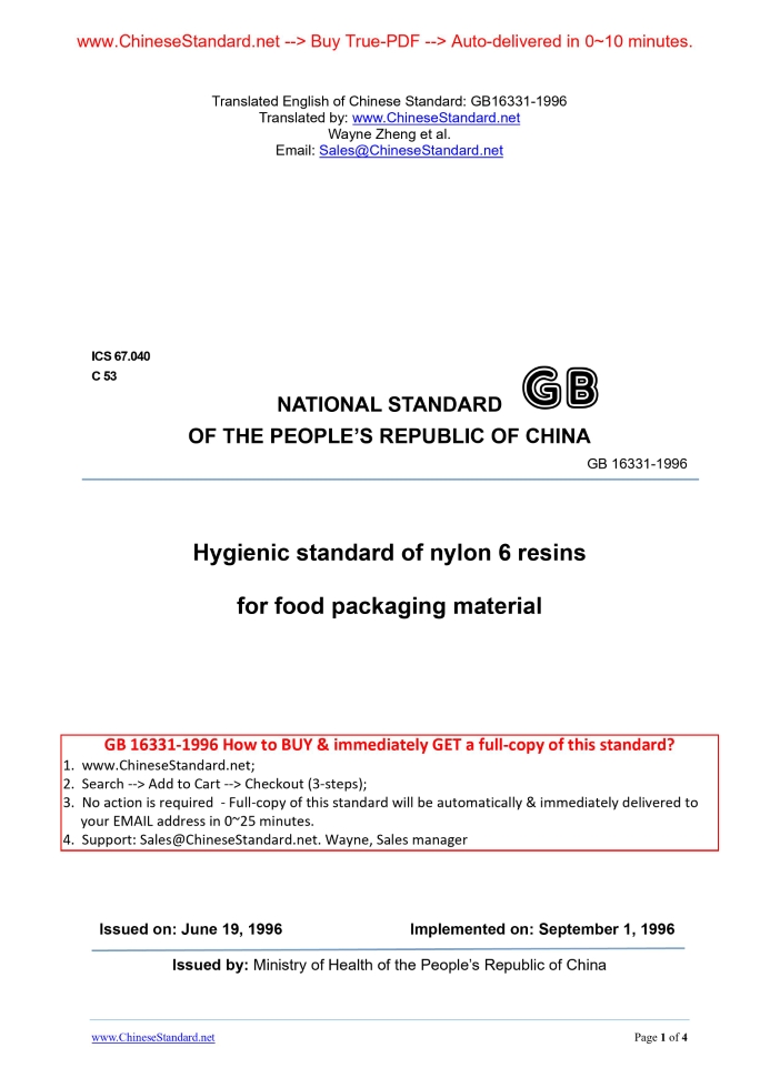 GB 16331-1996: Hygienic standard of nylon 6 resins for food packaging material Delivery: 9 seconds. True-PDF full-copy in English & invoice will be downloaded + auto-delivered via email. See step-by-step procedure Status: Obsolete