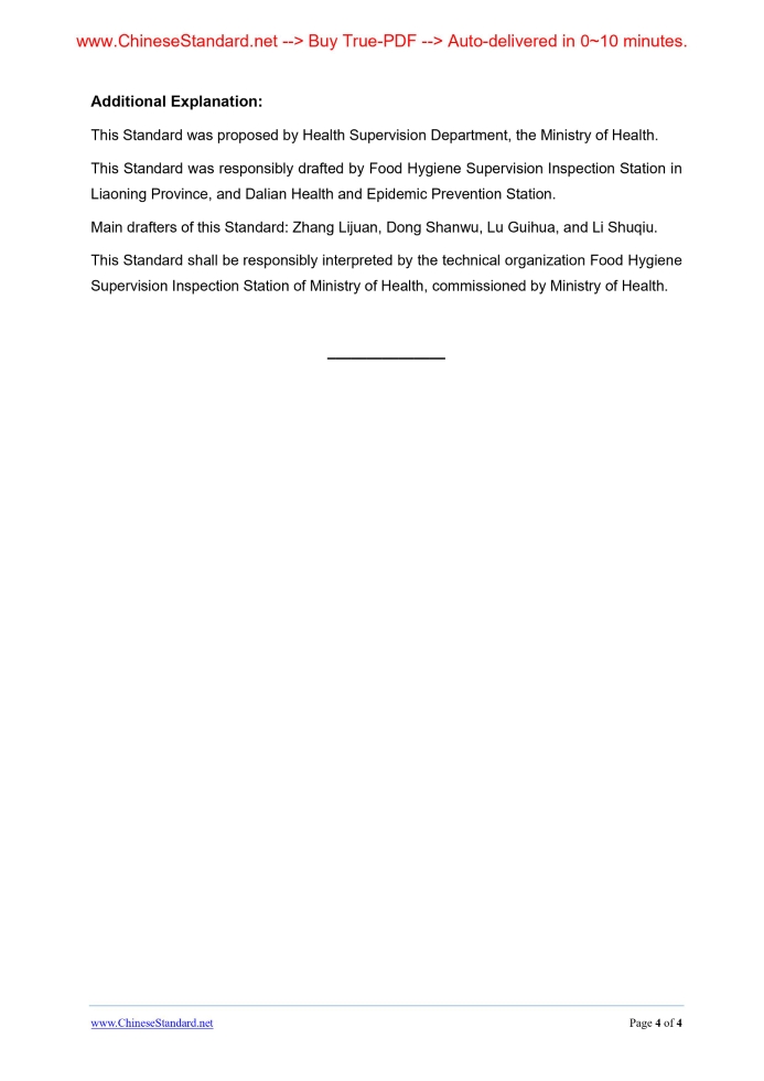 Similar standardsGB 16331-1996: Hygienic standard of nylon 6 resins for food packaging material---This is an excerpt. Full copy of true-PDF in English version (including equations, symbols, images, flow-chart, tables, and figures etc.), auto-downloaded/delivered in 9 seconds, can be purchased online: https://www.ChineseStandard.net/PDF.aspx/GB16331-1996ICS 67.040 C 53 NATIONAL STANDARD Hygienic standard of nylon 6 resins for food packaging material Issued on. JUNE 19, 1996 Implemented on. SEPTEMBER 1, 1996 Issued by. Ministry of Health of the People’s Republic of China GB Table of Contents1 Main contents and application scope... 3 2 Reference standard... 3 3 Hygienic requirements... 3 4 Test methods... 3 Hygienic standard of nylon 6 resins for food packaging material1 Main contents and application scopeThis Standard specifies the hygienic requirements and test methods of nylon 6 resin for food packaging material. This Standard is applicable to the nylon 6 resin which is used for manufacturing food containers, packaging materials, and food industry equipment and devices.2 Reference standardGB/T 14966 Determination of caprolactam in nylon 6 resin and its products.3 Hygienic requirements3.1 Sensory Index They shall be colorless and transparent particles, without odor, and without foreign substance.4 Test methodsThe test method of caprolactam shall be performed according to the method of GB/T 14966. Additional Explanation. This Standard was proposed by Health Supervision Department, the Ministry of Health. This Standard was responsibly drafted by Food Hygiene Supervision Inspection Station in Liaoning Province, and Dalian Health and Epidemic Prevention Station. ......Source: Above contents are excerpted from the full-copy PDF -- translated/reviewed by: www.ChineseStandard.net / Wayne Zheng et al. Tips & Frequently Asked Questions:Question 1: How long will the true-PDF of English version of GB 16331-1996 be delivered?Answer: The full copy PDF of English version of GB 16331-1996 can be downloaded in 9 seconds, and it will also be emailed to you in 9 seconds (double mechanisms to ensure the delivery reliably), with PDF-invoice.Question 2: Can I share the purchased PDF of GB 16331-1996_English with my colleagues?Answer: Yes. The purchased PDF of GB 16331-1996_English will be deemed to be sold to your employer/organization who actually paid for it, including your colleagues and your employer's intranet.Question 3: Does the price include tax/VAT?Answer: Yes. Our tax invoice, downloaded/delivered in 9 seconds, includes all tax/VAT and complies with 100+ countries' tax regulations (tax exempted in 100+ countries) -- See Avoidance of Double Taxation Agreements (DTAs): List of DTAs signed between Singapore and 100+ countriesQuestion 4: Do you accept my currency other than USD?Answer: Yes. www.ChineseStandard.us -- GB 16331-1996 -- Click this link and select your country/currency to pay, the exact amount in your currency will be printed on the invoice. Full PDF will also be downloaded/emailed in 9 seconds.How to buy and download a true PDF of English version of GB 16331-1996?A step-by-step guide to download PDF of GB 16331-1996_EnglishStep 1: Visit website https://www.ChineseStandard.net (Pay in USD), or https://www.ChineseStandard.us (Pay in any currencies such as Euro, KRW, JPY, AUD).Step 2: Search keyword "GB 16331-1996". Step 3: Click "Add to Cart". If multiple PDFs are required, repeat steps 2 and 3 to add up to 12 PDFs to cart. Step 4: Select payment option (Via payment agents Stripe or PayPal). Step 5: Customize Tax Invoice -- Fill up your email etc. Step 6: Click "Checkout". Step 7: Make payment by credit card, PayPal, Google Pay etc. After the payment is completed and in 9 seconds, you will receive 2 emails attached with the purchased PDFs and PDF-invoice, respectively. Step 8: Optional -- Go to download PDF. Step 9: Optional -- Click Open/Download PDF to download PDFs and invoice. See screenshots for above steps: Steps 1~3 Steps 4~6 Step 7 Step 8 Step 9 |