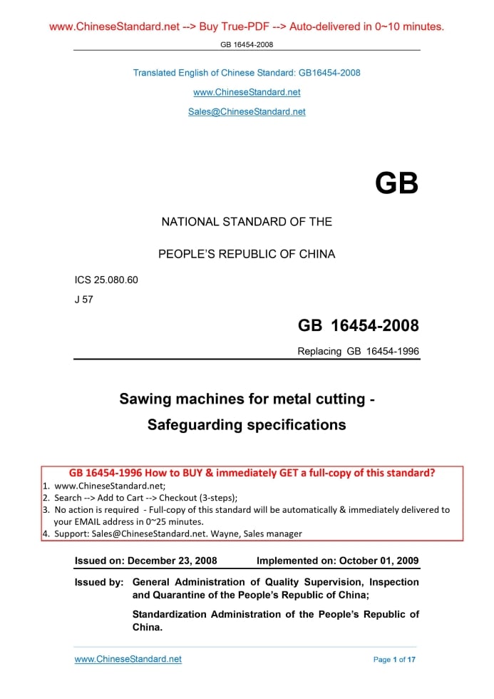 GB 16454-2008: Sawing machines for metal cutting -- Safeguarding specifications Delivery: 9 seconds. True-PDF full-copy in English & invoice will be downloaded + auto-delivered via email. See step-by-step procedure Status: Valid GB 16454: Historical versions