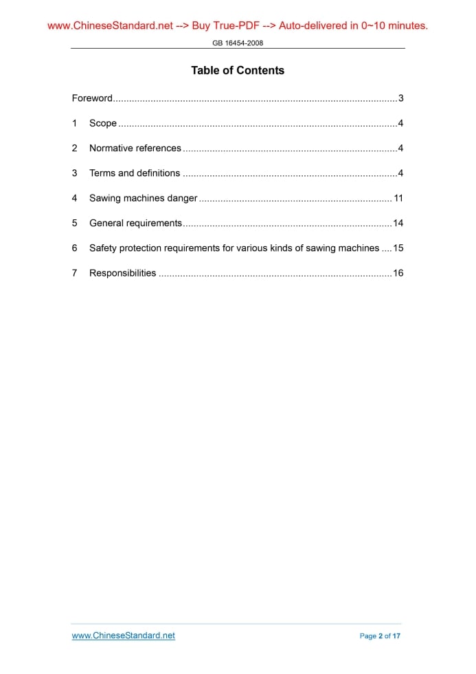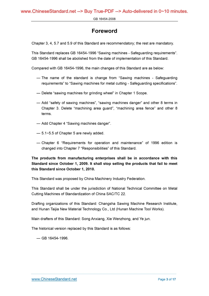 Similar standardsGB 16454-2008: Sawing machines for metal cutting -- Safeguarding specifications---This is an excerpt. Full copy of true-PDF in English version (including equations, symbols, images, flow-chart, tables, and figures etc.), auto-downloaded/delivered in 9 seconds, can be purchased online: https://www.ChineseStandard.net/PDF.aspx/GB16454-2008GB NATIONAL STANDARD OF THE PEOPLE’S REPUBLIC OF CHINA ICS 25.080.60 J 57 Replacing GB 16454-1996 Sawing machines for metal cutting - Safeguarding specifications Issued on: DECEMBER 23, 2008 Implemented on: OCTOBER 01, 2009 Issued by. General Administration of Quality Supervision, Inspection and Quarantine of the People’s Republic of China; Standardization Administration of the People’s Republic of China. Table of ContentsForeword... 3 1 Scope... 4 2 Normative references... 4 3 Terms and definitions... 4 4 Sawing machines danger... 11 5 General requirements... 14 6 Safety protection requirements for various kinds of sawing machines... 15 7 Responsibilities... 16ForewordChapter 3, 4, 5.7 and 5.9 of this Standard are recommendatory; the rest are mandatory. This Standard replaces GB 16454-1996 “Sawing machines - Safeguarding requirements”. GB 16454-1996 shall be abolished from the date of implementation of this Standard. Compared with GB 16454-1996, the main changes of this Standard are as below. — The name of the standard is change from “Sawing machines - Safeguarding requirements” to “Sawing machines for metal cutting - Safeguarding specifications”. — Delete “sawing machines for grinding wheel” in Chapter 1 Scope. — Add “safety of sawing machines”, “sawing machines danger” and other 8 terms in Chapter 3.Delete “machining area guard”, “machining area fence” and other 8 terms. — Add Chapter 4 “Sawing machines danger”. — 5.1~5.5 of Chapter 5 are newly added. — Chapter 6 “Requirements for operation and maintenance” of 1996 edition is changed into Chapter 7 “Responsibilities” of this Standard. The products from manufacturing enterprises shall be in accordance with this Standard since October 1, 2009.It shall stop selling the products that fail to meet this Standard since October 1, 2010. This Standard was proposed by China Machinery Industry Federation. This Standard shall be under the jurisdiction of National Technical Committee on Metal Cutting Machines of Standardization of China SAC/TC 22. Drafting organizations of this Standard. Changsha Sawing Machine Research Institute, and Hunan Taijia New Material Technology Co., Ltd (Hunan Machine Tool Works). Main drafters of this Standard. Song Anxiang, Xie Wenzhong, and Ye jun. The historical version replaced by this Standard is as follows. — GB 16454-1996. Sawing machines for metal cutting - Safeguarding specifications1 ScopeThis Standard aims at the major dangers of metal sawing machines and specifies the basic safety requirements and/or measures to eliminate the dangers and reduce the risks. This Standard is applicable to horizontal band, vertical band, circular and horizontal hack sawing machines for general purposes (hereinafter abbreviated as sawing machines).2 Normative referencesThe articles contained in the following documents have become part of this Standard when they are quoted herein. For the dated documents so quoted, all the modifications (excluding corrections) or revisions made thereafter shall not be applicable to this Standard. For the undated documents so quoted, the latest editions shall be applicable to this Standard. GB 5226.1 Safety of Machinery – Electrical equipment of machines Part 1.General technical specifications (GB 5226.1-2002, IEC 60204-1.2000, IDT) GB/T 15706.1-2007 Safety of Machinery – Basic concepts and general principles for design Part 1.Basic terms and methods (ISO 12100-1.2003, IDT) GB/T 15706.2 Safety of Machinery – Basic concepts and general principles for design Part2.Technical principles (GB/T 15706.2-2007, ISO 12100-2.2003, IDT) GB 15760 Metal Sawing Machines – General safeguarding specifications GB/T 16769 Metal Sawing Machines – Methods for measuring noise SPL GB/T 16856.1 Safety of Machinery – Risk evaluation Part 1.Principles (GB/T 16856.1-2008, ISO 14121-1.2007, IDT)3 Terms and definitionsThe following terms and definitions, and those established in GB/T 15706.1 and GB 15760 apply to this Standard. 3.14 Sawing machines danger4.1 Danger analysis and risk evaluation shall be conducted on sawing machines in accordance with the provisions of Chapter 5 of GB/T 15706.1-2007 and GB/T 16856.1. Identify and evaluate the dangers of sawing machines. Note. for the dangers not involved in this Standard, safety measures shall be taken in accordance with relevant provisions of GB/T 15706.2. 4.2 During danger analysis, special attention shall be paid on the dangers caused by the operators and other personnel’s misuse, including. — operating period of sawing machines; — adjustment, cleaning and maintenance periods of sawing machines. 4.3 Major dangers of sawing machines 4.3.1 Mechanical danger 4.3.1.1 The danger of squeezing or cutting caused during clamping the work-piece or changing the cutting tools. 4.3.1.2 The danger of squeezing between saw frame and operating vise, saw frame and working bench, saw frame and upright rod, saw blades box and operating vise or upright rod, saw arm and operating vise. 4.3.1.3 When saw frame, operating vise, saw blades box, saw arm and other parts are lifted or shifted, the danger of cutting or squeezing between these parts and positioning surface. 4.3.1.4 The sharp edges, sharp points and openings among components of sawing machines that may cause cutting dangers to operators. 4.3.1.5 If the operators touch the working cutting tools with hands, it may cause cutting dangers. 4.3.1.6 When the operators operate machines manually (such as during loading, disassembling work-piece or measuring), if they are close to rotating cutting tools, it may cause wi