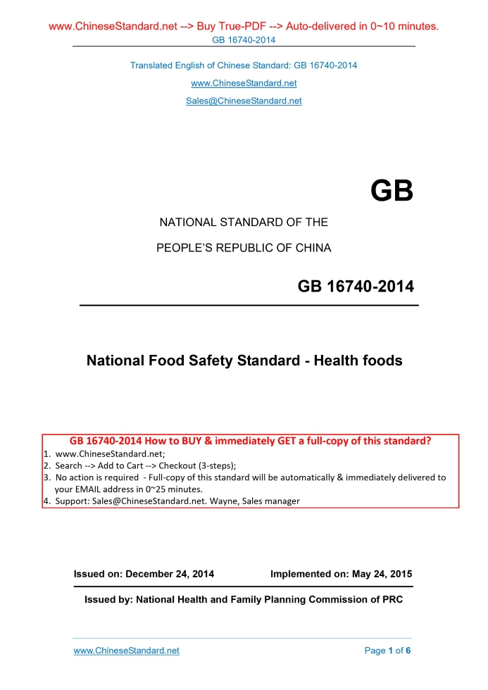 GB 16740-2014: National Food Safety Standard -- Health foods Delivery: 9 seconds. True-PDF full-copy in English & invoice will be downloaded + auto-delivered via email. See step-by-step procedure Status: Valid GB 16740: Historical versions