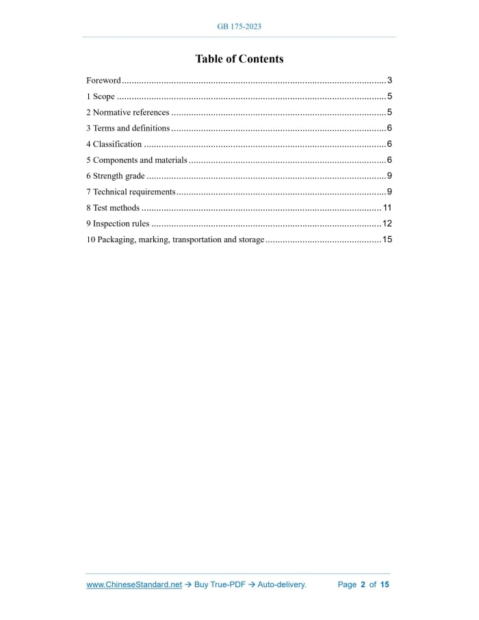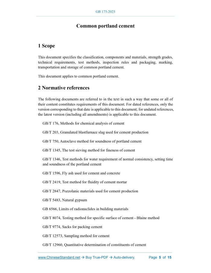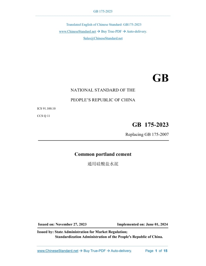 GB 175-2023: Common Portland cement---This is an excerpt. Full copy of true-PDF in English version (including equations, symbols, images, flow-chart, tables, and figures etc.), auto-downloaded/delivered in 9 seconds, can be purchased online: https://www.ChineseStandard.net/PDF.aspx/GB175-2023GB NATIONAL STANDARD OF THE PEOPLE’S REPUBLIC OF CHINA ICS 91.100.10 CCS Q 11 Replacing GB 175-2007 Common portland cement Issued on. NOVEMBER 27, 2023 Implemented on. JUNE 01, 2024 Issued by. State Administration for Market Regulation; Standardization Administration of the People’s Republic of China. Table of ContentsForeword... 3 1 Scope... 5 2 Normative references... 5 3 Terms and definitions... 6 4 Classification... 6 5 Components and materials... 6 6 Strength grade... 9 7 Technical requirements... 9 8 Test methods... 11 9 Inspection rules... 12 10 Packaging, marking, transportation and storage... 15ForewordThis document is drafted in accordance with the rules provided in GB/T 1.1-2020 Directives for standardization - Part 1.Rules for the structure and drafting of standardizing documents. This document replaces GB 175-2007 Common portland cements; compared with GB 175-2007, in addition to structural adjustments and editorial changes, the main technical changes are as follows. a) Change the provisions on cement components (see 5.1; 5.1 of the 2007 edition); b) Delete the provisions on natural gypsum of “grade II and above” (see 5.2.2.1 of the 2007 edition); c) Change the technical requirements for granulated blastfurnace slag or granulated blastfurnace slag powder, fly ash, and pozzolanic materials (see 5.2.3, 5.2.4 and 5.2.5; 5.2.3 of the 2007 edition); d) Delete the provisions on “active mixed materials” and “inactive mixed materials” (see 5.2.3 and 5.2.4 of the 2007 edition); e) Change the requirements for limestone and sandstone, and add the inspection method for methylene blue value (see 5.2.6; 5.2.4 of the 2007 edition); f) Delete the “kiln dust” material (see 5.2.5 of the 2007 edition); g) Delete the strength grades of 32.5 and 32.5R for composite portland cement (see 6.3 of the 2007 edition); h) Add the limit and determination method of water-soluble chromium (VI) (see 7.2 and 8.3); i) Change the regulations on alkali content (see 7.3; 7.2 of the 2007 edition); j) Add the requirements for qualified autoclave for soundness and list it as a type inspection item (see 7.4.2.2 and 9.2.2); k) Change the 3-day compression strength index of cement of each strength grade (see 7.4.3; 7.3.3 of the 2007 edition); l) Change the fineness requirements (see 7.4.4; 7.3.4 of the 2007 edition); m) Add limits and determination method of cement radionuclides (see 7.5 and 8.9); n) Change the requirements for component determination (see 8.1; 8.1 of the 2007 edition); o) Delete the provisions on production capacity below 10×104 t in “Numbering and sampling” (see 9.1 of the 2007 edition); p) Change the ex-factory inspection items (see 9.2.1; 9.3 of the 2007 edition); q) Add type inspection, as well as requirements for inspection frequency and determination rules (see 9.2.2, 9.3.2); r) Add requirements for product quality certification materials (see 9.4); s) Change the regulations on inspection report (see 9.5; 9.5 of the 2007 edition); t) Change the regulations on acceptance basis (see 9.6.1; 9.6.1 of the 2007 edition); u) Change the regulations on the inspection agency when quality disputes occur (see 9.6.2, 9.6.3; 9.6.2, 9.6.3 of the 2007 edition); v) Change the regulations on packaging (see 10.1; 10.1 of the 2007 edition). Please note that some of the contents of this document may involve patents. The issuing organization of this document is not responsible for identifying patents. This document is proposed and managed by the Ministry of Industry and Information Technology of the People’s Republic of China. The previous versions of this document and the documents which are replaced by this document are as follows. -- First published as GB 175-1956 in 1956, first revised in 1962, second revised in 1977, third revised in 1985, fourth revised in 1992, and fifth revised in 1999; -- In the sixth revision in 2007, it incorporated the contents of GB 1344-1999 Portland blastfurnace-slag cement, portland pozzolana cement and portland fly- ash cement and GB 12958-1999 Composite portland cement (The previous versions of GB 1344-1999 are. GB 1344-1956, GB 1344-1962, GB 1344-1977, GB 1344-1985, GB 1344-1992; the previous versions of GB 12958-1999 are. GB 12958-1981, GB 12958-1991); -- This is the seventh revision. Common portland cement1 ScopeThis document specifies the classification, components and materials, strength grades, technical requirements, test methods, inspection rules and packaging, marking, transportation and storage of common portland cement. This document applies to common portland cement.2 Normative referencesThe following documents are referred to in the text in such a way that some or all of their content constitutes requirements of this document. For dated references, only the version corresponding to that date is applicable to this document; for undated references, the latest version (including all amendments) is applicable to this document. GB/T 176, Methods for chemical analysis of cement GB/T 203, Granulated blastfurnace slag used for cement production GB/T 750, Autoclave method for soundness of portland cement GB/T 1345, The test sieving method for fineness of cement GB/T 1346, Test methods for water requirement of normal consistency, setting time and soundness of the portland cement GB/T 1596, Fly ash used for cement and concrete GB/T 2419, Test method for fluidity of cement mortar GB/T 2847, Pozzolanic materials used for cement production3 Terms and definitionsNo terms and definitions need to be defined in this document.4 ClassificationCommon portland cement is divided into portland cement, ordinary portland cement, blastfurnace-slag portland cement, fly ash portland 