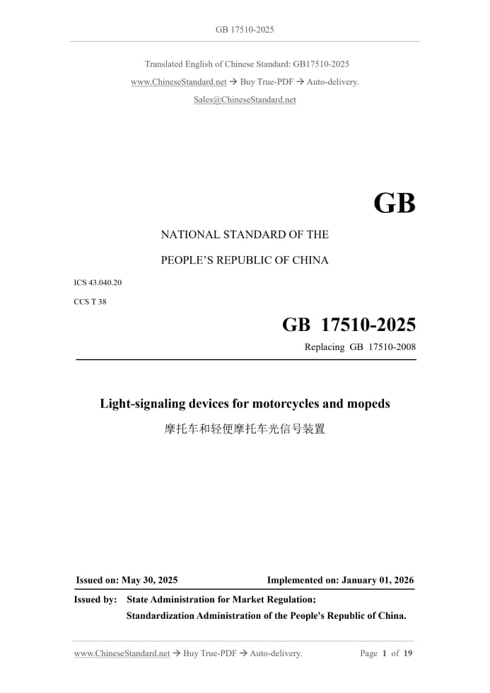 Similar standardsGB 17510-2025: Light-signalling devices for motorcycles and mopeds---This is an excerpt. Full copy of true-PDF in English version (including equations, symbols, images, flow-chart, tables, and figures etc.), auto-downloaded/delivered in 9 seconds, can be purchased online: https://www.ChineseStandard.net/PDF.aspx/GB17510-2025GB NATIONAL STANDARD OF THE PEOPLE’S REPUBLIC OF CHINA ICS 43.040.20 CCS T 38 Replacing GB 17510-2008 Light-signaling devices for motorcycles and mopeds Issued on: MAY 30, 2025 Implemented on: JANUARY 01, 2026 Issued by. State Administration for Market Regulation; Standardization Administration of the People's Republic of China. Table of ContentsForeword... 3 1 Scope... 5 2 Normative references... 5 3 Terms and definitions... 5 4 Determination for the same type... 6 5 Overall requirements... 6 6 Light distribution requirements... 9 7 Tests... 11 8 Inspection rules... 13 9 Implementation of the standard... 15 Annex A (normative) Light distribution angle range... 16 Annex B (normative) Luminous intensity distribution... 18 Light-signaling devices for motorcycles and mopeds1 ScopeThis document specifies the same type determination, general requirements, lighting requirements, test and inspection rules for light-signaling devices for motorcycles and mopeds. This document applies to the design, manufacture and acceptance of front position lamps, rear position lamps, brake lamps, turn signal lamps, reversing lamps and rear license plate lighting devices for L1 to L5 vehicles.2 Normative referencesThe following referenced documents are indispensable for the application of this document. For dated references, only the edition cited applies. For undated references, the latest edition of the referenced document (including any amendments) applies. GB 4785, Prescription for installation of the external lighting and light-signaling devices for motor vehicles and their trailers GB 18100, Provisions for the installation of lighting and light-signaling devices for motorcycles and mopeds UN R37, Uniform provisions concerning the approval of filament lamps for use in approved lamp units of power-driven vehicles and of their trailers UN R128, Uniform provisions concerning the approval of light emitting diode (LED) light sources for use in approved lamp units on power-driven vehicles and their trailers3 Terms and definitionsFor the purposes of this document, the terms and definitions defined in GB 4785 and GB 18100 as well as the followings apply. 3.1 light-signaling device A unit or group of units used to emit light signals to other road users to indicate the presence of a vehicle or a change in its motion state, and to perform one or more functions. NOTE. In this document, the term "device" refers to one or more of the following. front position lamps, rear position lamps, brake lamps, turn signal lamps, backup lamps and rear license plate lighting devices.4 Determination for the same typeLight-signaling devices that do not differ in the following main features are considered to be of the same type. - Manufacturer; - Model of the device; - Number, type, lighting principle, and module structure of replaceable or non- replaceable light sources used; - Number and structure of major optical components (e.g., reflectors, light distribution lenses, light guides, variable light intensity controllers, etc.); - Type of device.5 Overall requirements5.1 General requirements 5.1.1 The device should be designed and manufactured so that, under normal conditions of use, it can still meet the requirements of use and comply with the provisions of this document even if it is subjected to vibration. 5.1.2 Light-signaling devices with illuminated logos meet the following requirements. a) Luminous logos should be part of the light signal device and the light color must be consistent. Brake lights, turn signal lights and reverse lights should not have luminous logos. There should be no more than two luminous logos installed facing forward or rearward. The light-transmitting surface of the luminous logo itself may be asymmetrical. b) The illuminated logo should be the vehicle manufacturer's trademark or model logo. c) When the luminous logo is not illuminated, the light-signaling device shall also meet its corresponding photometric and chromaticity requirements. 5.2 Requirements for front position lights, rear position lights and brake lights 5.2.1 Front/rear position lamps that are mixed with other functions and use the same light source may be designed to operate in conjunction with an additional system for regulating luminous intensity. In this case, for rear position lamps that share a light source with the brake lamp, multiple light sources should be connected in parallel, or the function should be equipped with a fault monitoring system. 5.2.2 If the front position lamp contains one or more infrared radiation generators, the photometric and chromaticity of the front position lamp shall meet the requirements regardless of whether the infrared radiation generator is operating or not. 5.3 Requirements for turn signal lights 5.3.1 Front turn signal lamps are classified into categories 11, 11a, 11b, and 11c based on their light distribution levels. Rear turn signal lamps are classified into category 12. The spacing between the front turn signal lamp and the adjacent low beam lamp or front fog lamp shall meet the following requirements. a) Category 11 front turn signal lights. not less than 75 mm; b) Category 11a front turn signal lights. not less than 40 mm; c) Category 11b front turn signal lights. not less than 20 mm; d) Category 11c front turn signal lights. no spacing requirement. 5.3.2 Sequential opening meets the following requirements. a) After each light source is activated, it should remain on until the lighting cycle ends. The sequential lighting change process should end within 200 ms after the lighting cycle begins. b) The changes in the sequential opening should be gradually l