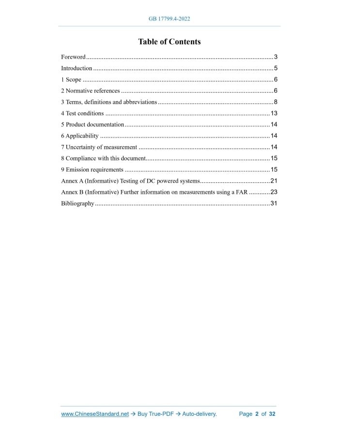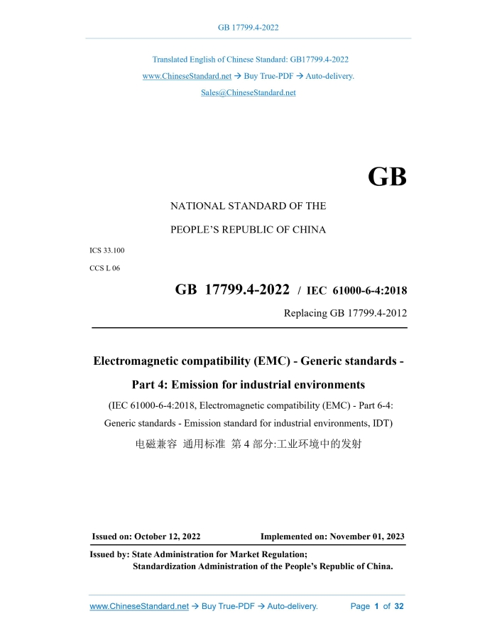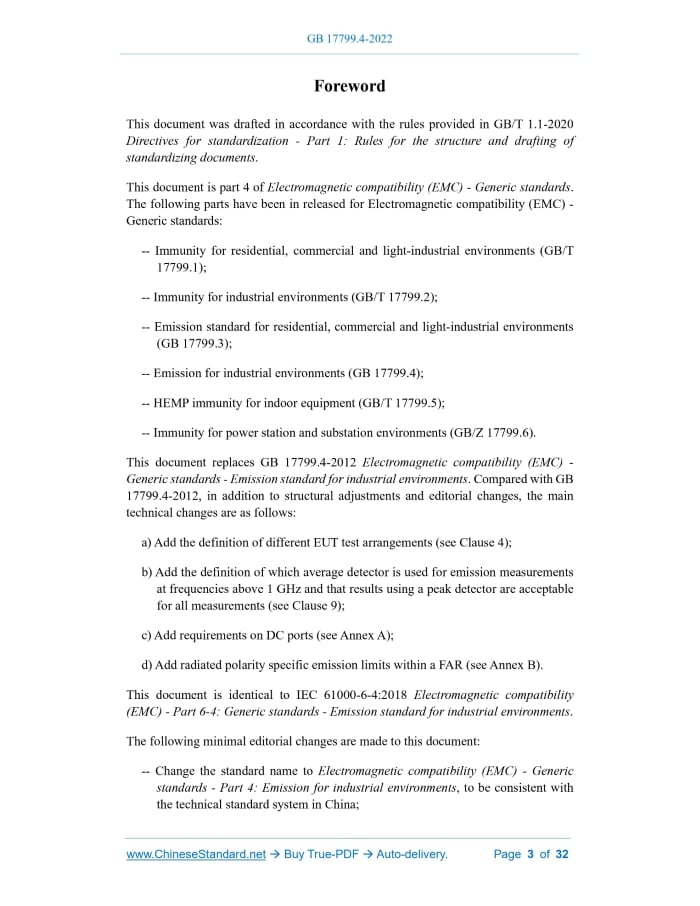 Similar standardsGB 17799.4-2022: Electromagnetic compatibility (EMC) - Generic standards - Part 4: Emission for industrial environments---This is an excerpt. Full copy of true-PDF in English version (including equations, symbols, images, flow-chart, tables, and figures etc.), auto-downloaded/delivered in 9 seconds, can be purchased online: https://www.ChineseStandard.net/PDF.aspx/GB17799.4-2022 GB NATIONAL STANDARD OF THE PEOPLE’S REPUBLIC OF CHINA ICS 33.100 CCS L 06 GB 17799.4-2022 / IEC 61000-6-4.2018 Replacing GB 17799.4-2012 Electromagnetic compatibility (EMC) - Generic standards - Part 4.Emission for industrial environments (IEC 61000-6-4.2018, Electromagnetic compatibility (EMC) - Part 6-4. Generic standards - Emission standard for industrial environments, IDT) Issued on. OCTOBER 12, 2022 Implemented on. NOVEMBER 01, 2023 Issued by. State Administration for Market Regulation; Standardization Administration of the People’s Republic of China. Table of ContentsForeword... 3 Introduction... 5 1 Scope... 6 2 Normative references... 6 3 Terms, definitions and abbreviations... 8 4 Test conditions... 13 5 Product documentation... 14 6 Applicability... 14 7 Uncertainty of measurement... 14 8 Compliance with this document... 15 9 Emission requirements... 15 Annex A (Informative) Testing of DC powered systems... 21 Annex B (Informative) Further information on measurements using a FAR... 23 Bibliography... 31ForewordThis document was drafted in accordance with the rules provided in GB/T 1.1-2020 Directives for standardization - Part 1.Rules for the structure and drafting of standardizing documents. This document is part 4 of Electromagnetic compatibility (EMC) - Generic standards. The following parts have been in released for Electromagnetic compatibility (EMC) - Generic standards. -- Immunity for residential, commercial and light-industrial environments (GB/T 17799.1); -- Immunity for industrial environments (GB/T 17799.2); -- Emission standard for residential, commercial and light-industrial environments (GB 17799.3); -- Emission for industrial environments (GB 17799.4); -- HEMP immunity for indoor equipment (GB/T 17799.5); -- Immunity for power station and substation environments (GB/Z 17799.6). This document replaces GB 17799.4-2012 Electromagnetic compatibility (EMC) - Generic standards - Emission standard for industrial environments. Compared with GB 17799.4-2012, in addition to structural adjustments and editorial changes, the main technical changes are as follows. a) Add the definition of different EUT test arrangements (see Clause 4); b) Add the definition of which average detector is used for emission measurements at frequencies above 1 GHz and that results using a peak detector are acceptable for all measurements (see Clause 9); c) Add requirements on DC ports (see Annex A); d) Add radiated polarity specific emission limits within a FAR (see Annex B). This document is identical to IEC 61000-6-4.2018 Electromagnetic compatibility (EMC) - Part 6-4.Generic standards - Emission standard for industrial environments. The following minimal editorial changes are made to this document. -- Change the standard name to Electromagnetic compatibility (EMC) - Generic standards - Part 4.Emission for industrial environments, to be consistent with the technical standard system in China; Please note that some of the contents of this document may involve patents. The issuing organization of this document is not responsible for identifying patents. This document shall be under the jurisdiction of Standardization Administration of the People’s Republic of China. The previous versions of this document and the documents which are replaced by this document are as follows. -- It was first published as GB 17799.4-2001 in 2001 and revised for the first time in 2012; -- This is the second revision.1 ScopeThis document for emission requirements applies to electrical and electronic equipment intended for use within the environment existing at industrial (see 3.1.12) locations. This document does not apply to equipment that fall within the scope of GB 17799.3. The environments encompassed by this document cover both indoor and outdoor locations.2 Normative referencesThe following documents are referred to in the text in such a way that some or all of their content constitutes requirements of this document. For dated references, only the version corresponding to that date is applicable to this document; for undated references, the latest version (including all amendments) is applicable to this document. GB 4824-2019, Industrial, scientific and medical equipment - Radio-frequency disturbance characteristics - Limits and methods of measurement (CISPR 11.2015, IDT)3 Terms, definitions and abbreviationsPhysical boundary of the equipment which electromagnetic fields may radiate through or impinge on.4 Test conditionsThe equipment under test (EUT) shall be tested in the operating mode producing the largest emission in the frequency band being measured, consistent with normal applications. The configuration of the test sample shall be varied to achieve maximum emission consistent with typical applications and installation practice. Pre-testing may be used to reduce test time.5 Product documentationThe purchaser/user/installer shall be informed within the product documentation if special measures have to be taken to achieve compliance. One example, would be the need to use shielded or special cables.6 ApplicabilityThe application of measurements for emission(s) depends on the particular equipment, its configuration, its ports, its technology and its operating conditions. Measurements shall be applied to the relevant ports of the equipment according to the requirements defined in Table 3 ~ Table 5.Measurements shall only be carried out where the relevant ports exist.7 Uncertainty of measurementWhere guidance for the calculation of the instrumentation uncertainty of a measurement is specified in GB/T 6113.402-2018 th