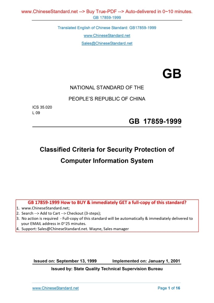 GB 17859-1999: Classified criteria for security protection of computer information system Delivery: 9 seconds. True-PDF full-copy in English & invoice will be downloaded + auto-delivered via email. See step-by-step procedure
